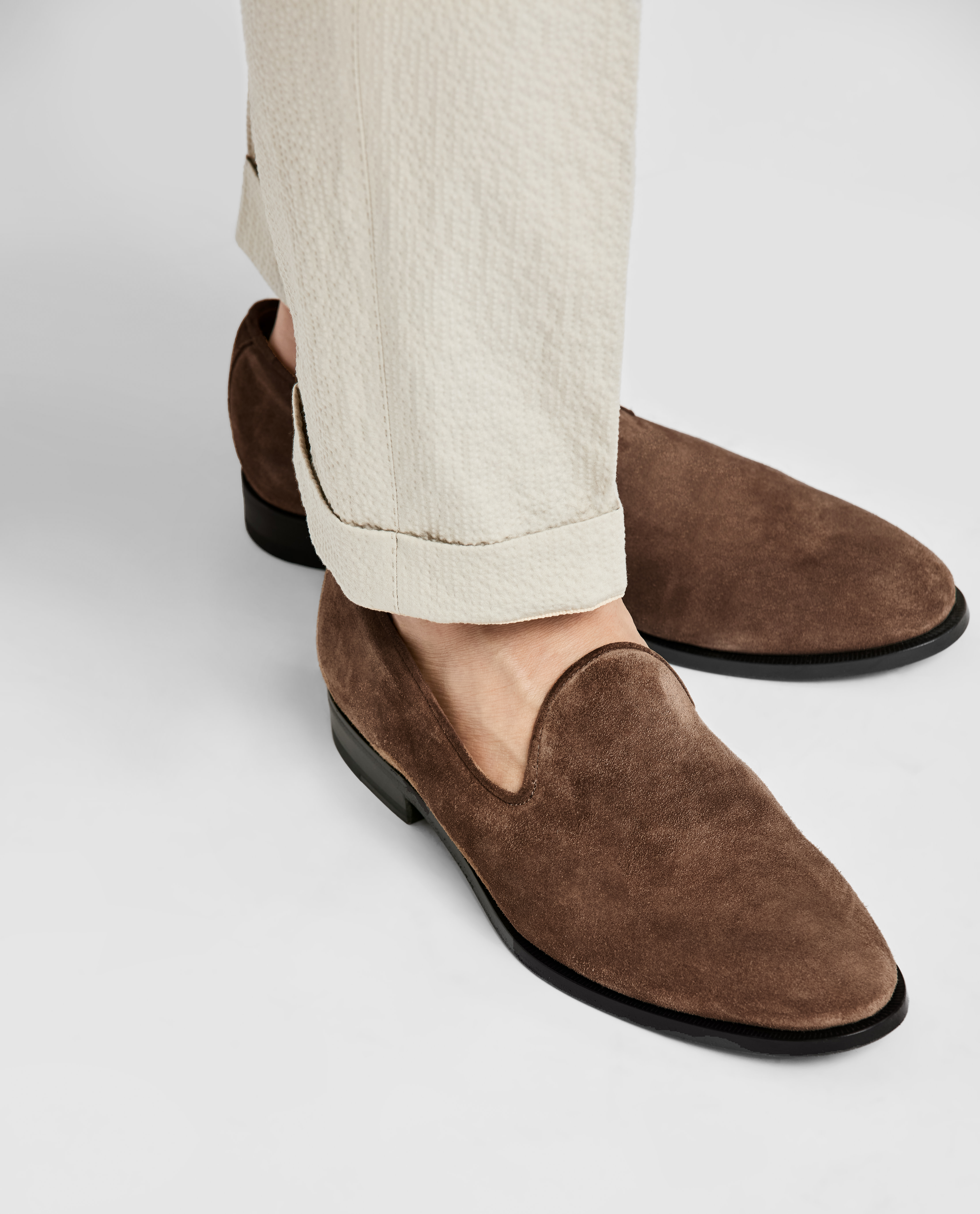 An elegant suede loafer in chocolate brown. Handmade from a flexible chrome-tanned calfskin leather, this light suede features a short nap for a touch of softness. Designed here as a plain toe loafer. Make these shoes your own with our many customization options to choose from.