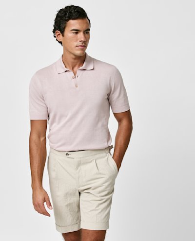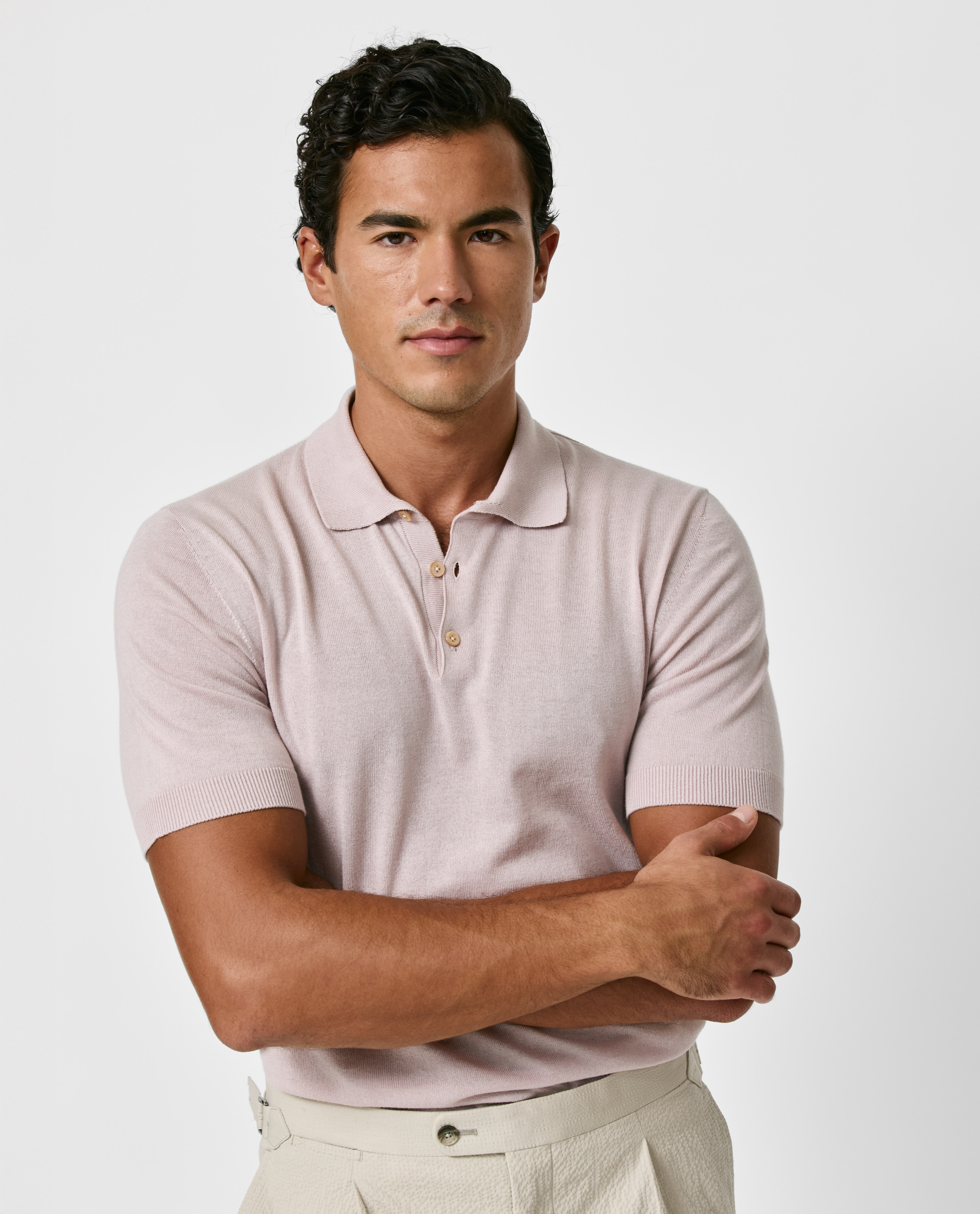 This pale pink knit is summer friendly with a seamless finish. Crafted from a blend of breathable Turkish cotton and soft Inner Mongolian cashmere. Designed here as a short-sleeved polo with buttons, in single ply for a lightweight look. Make this knitwear your own with our many customization options to choose from. Cotton & cashmere Breathable Soft feel