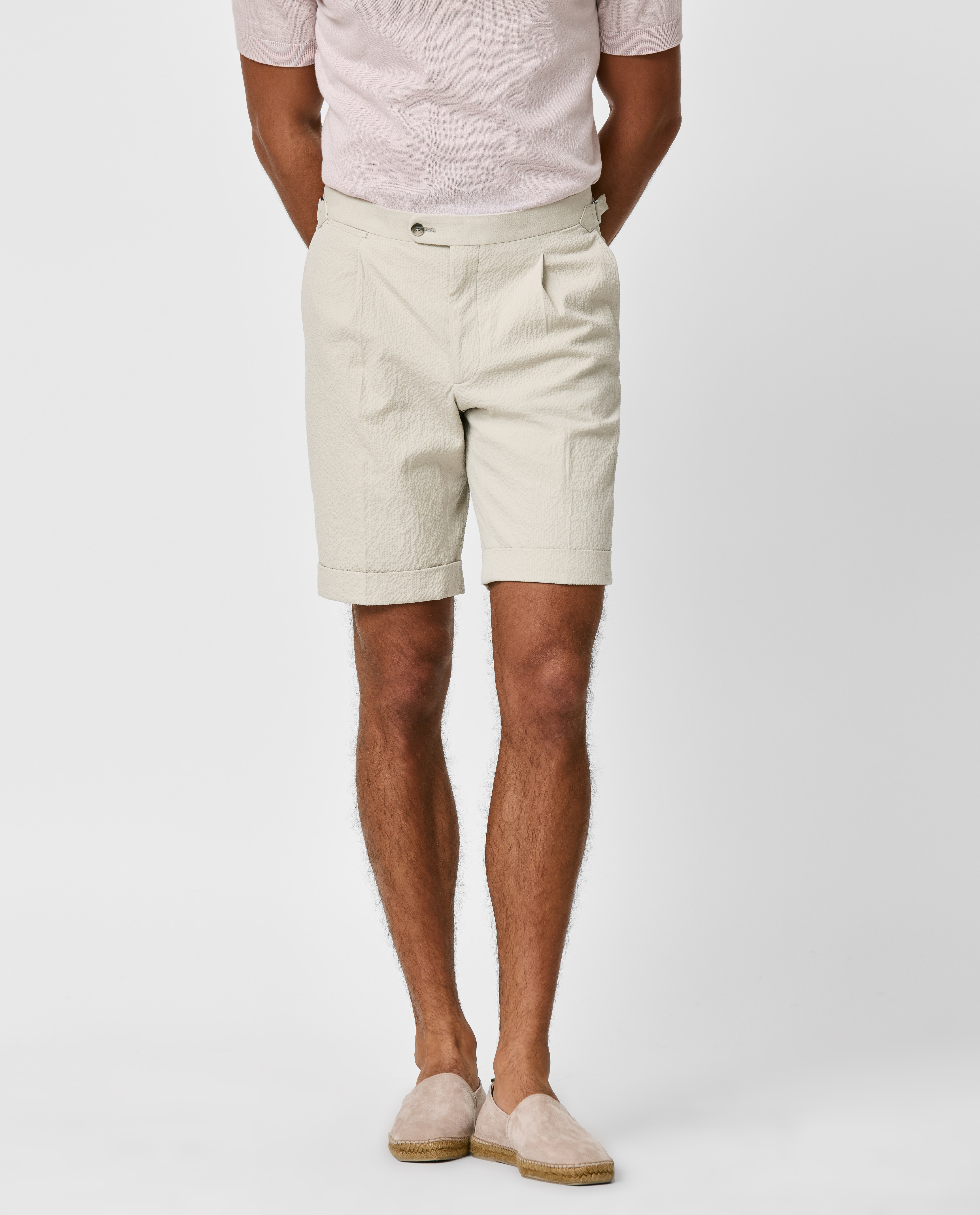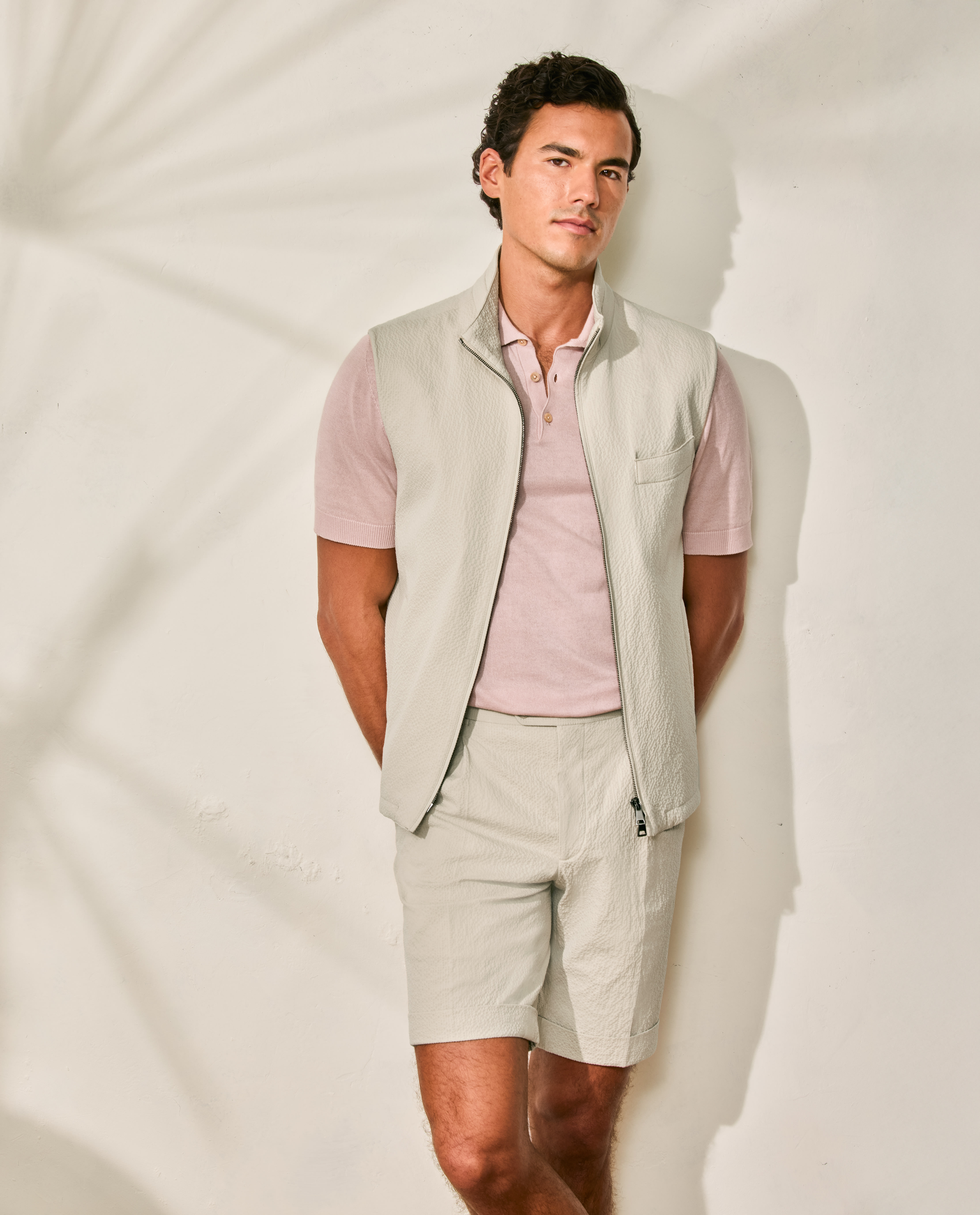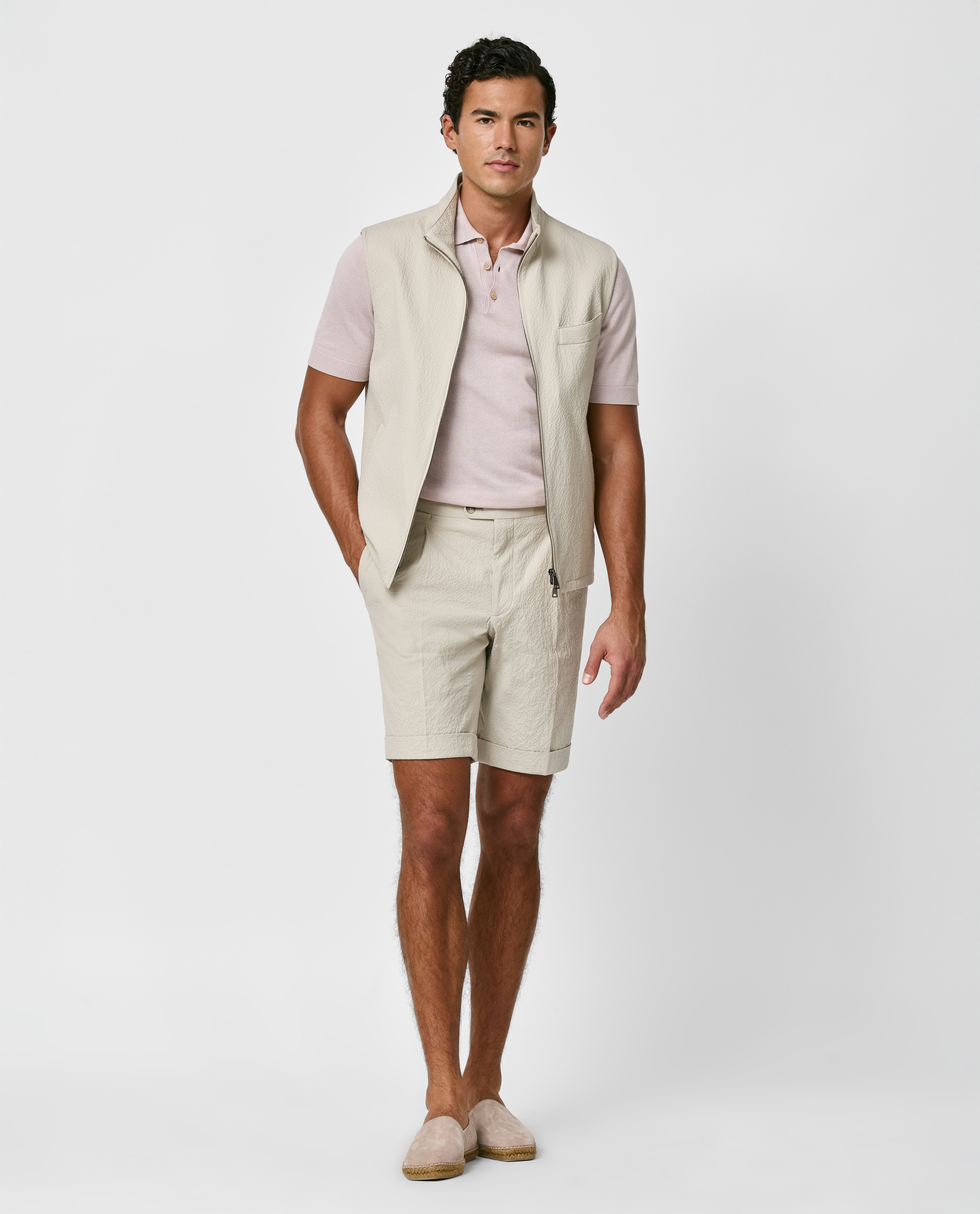 Set the tone for your next sun-filled adventure with this matching vest and Bermuda short combo in sand stretch cotton seersucker, a breezy choice for your most relaxed summer days. Combine it with a pale pink summer knit for a soft pop of color and laid-back espadrilles for a beach-ready vibe.