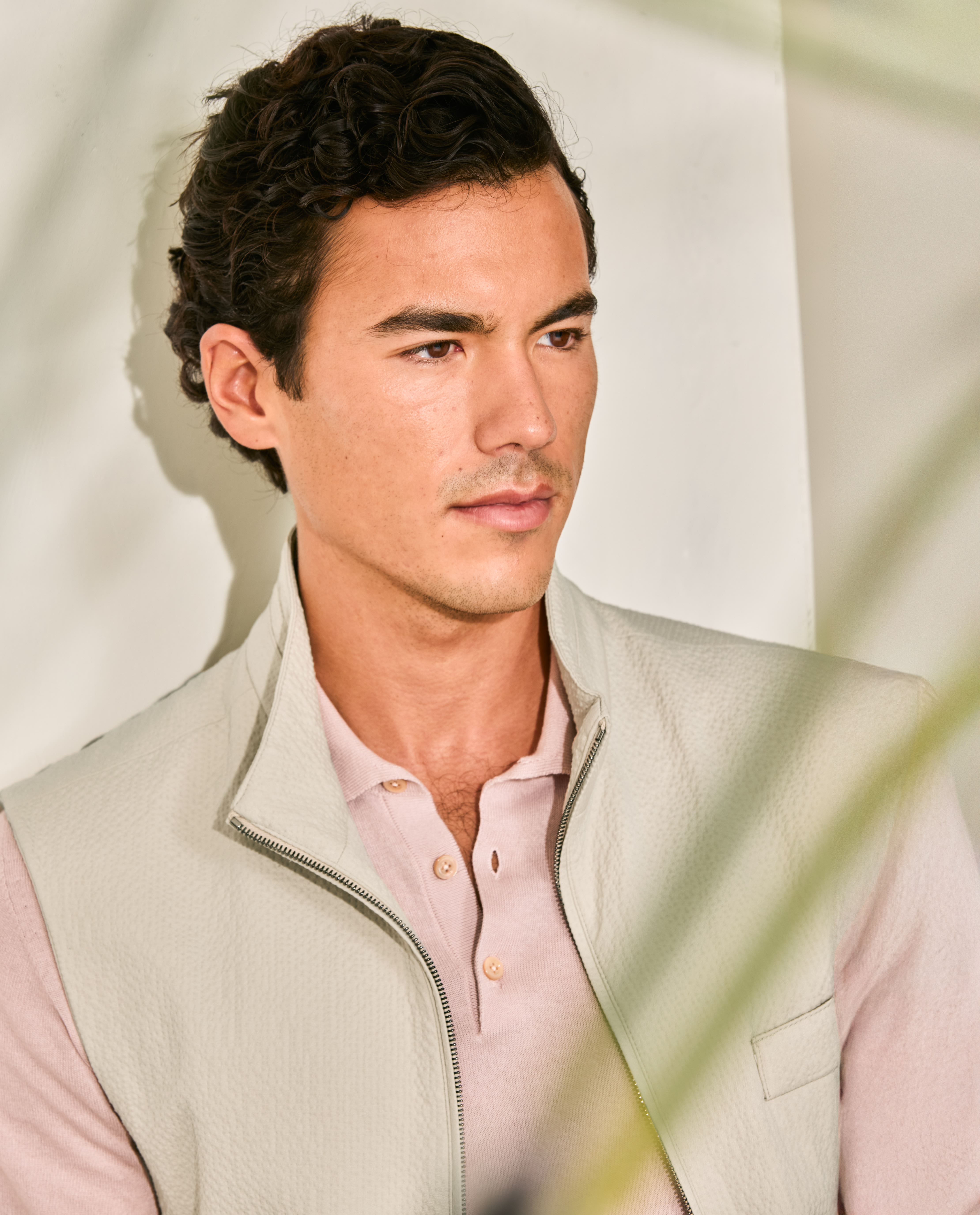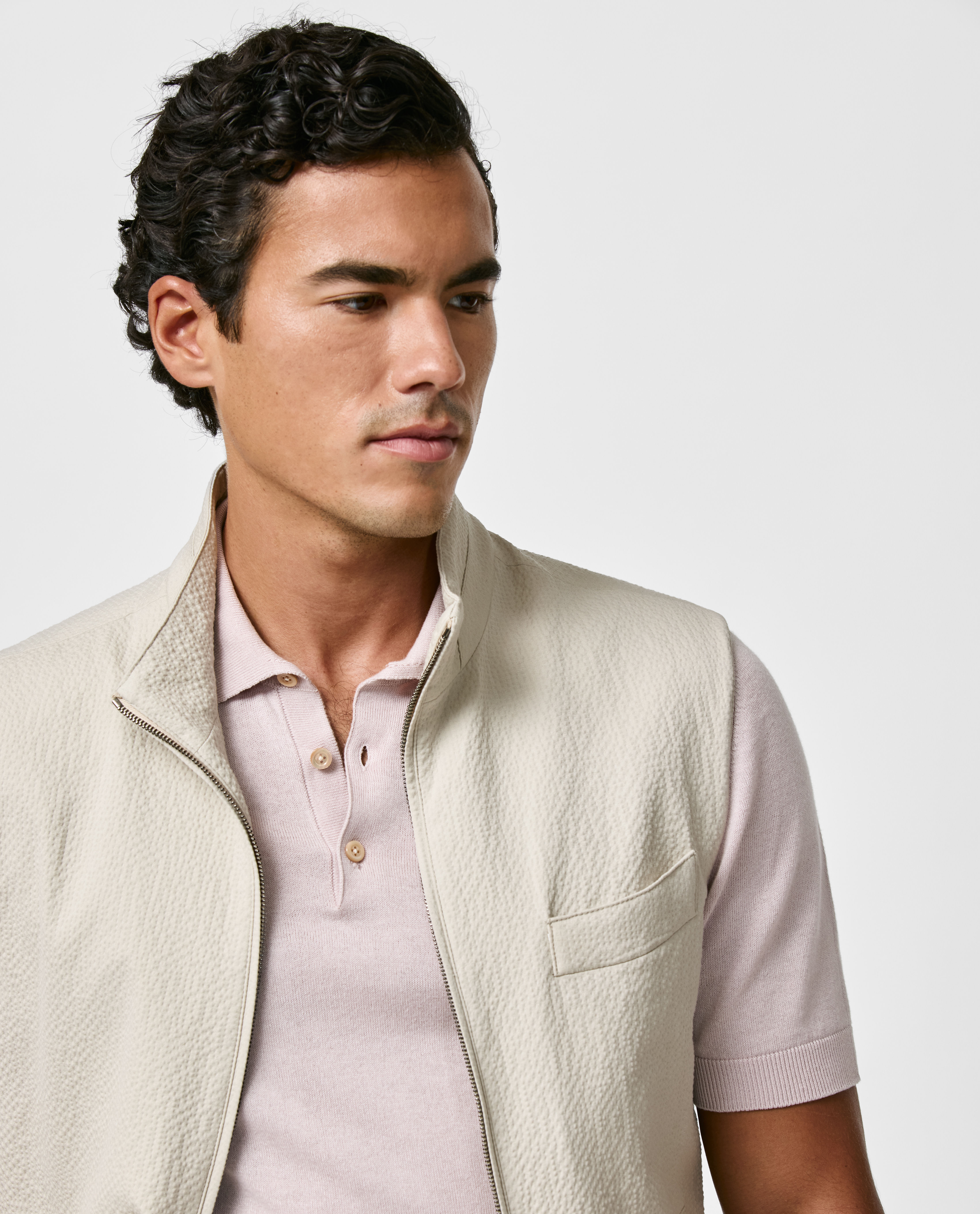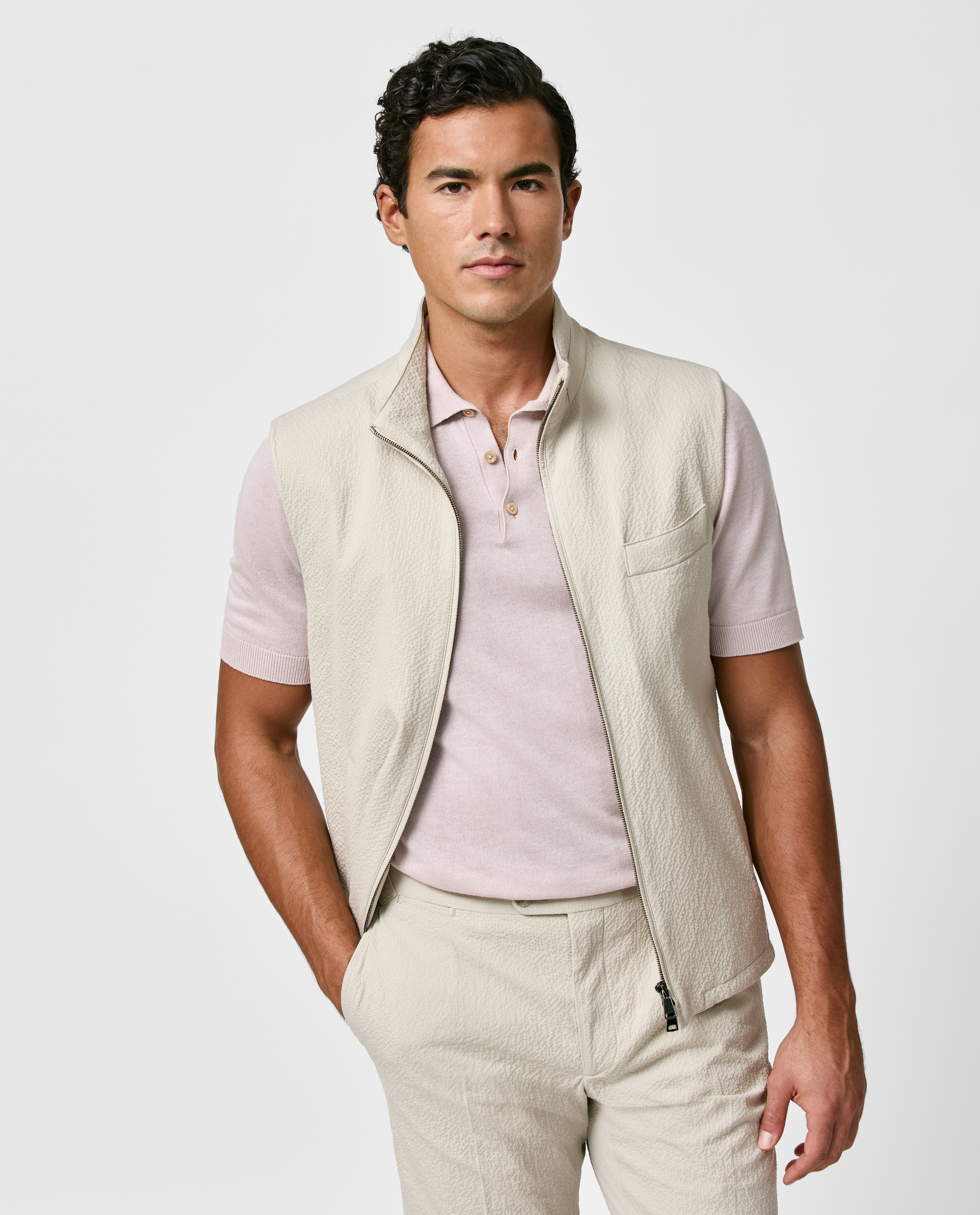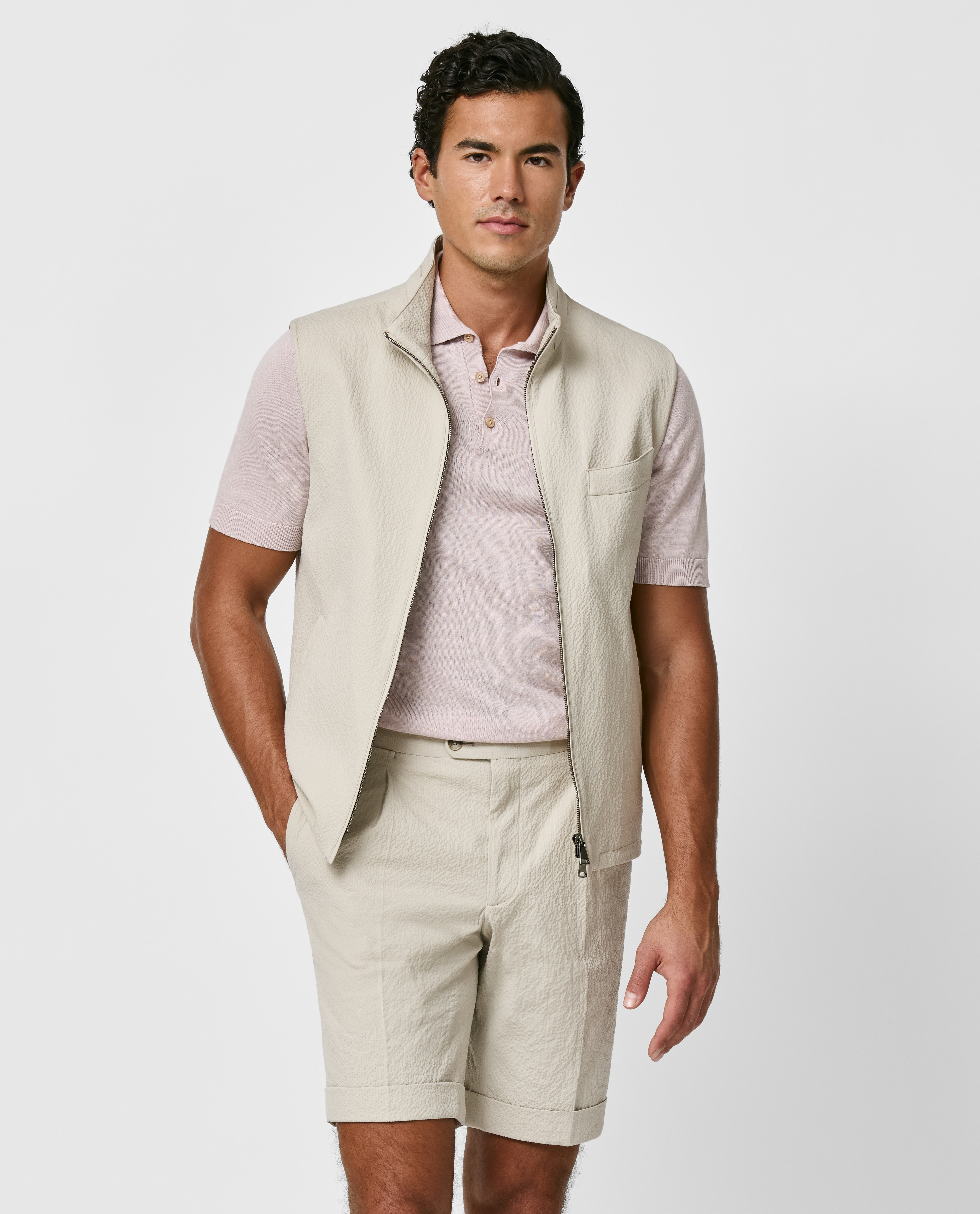 Crafted from cooling stretch cotton seersucker, prized for its distinctively puckered texture that enhances airflow, this sand-colored vest features a practical two-way zip closure and timeless rounded welt chest pocket. Pair it with a summer knit and matching Bermuda shorts to create an effortless, smart-casual seasonal look. Prefer a different style? Every piece is made exclusively for you, with your choice of design options. Stretch cotton Seersucker Breathable Cooling