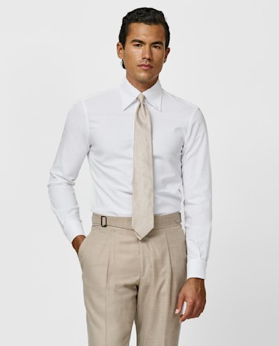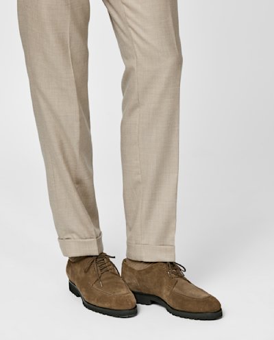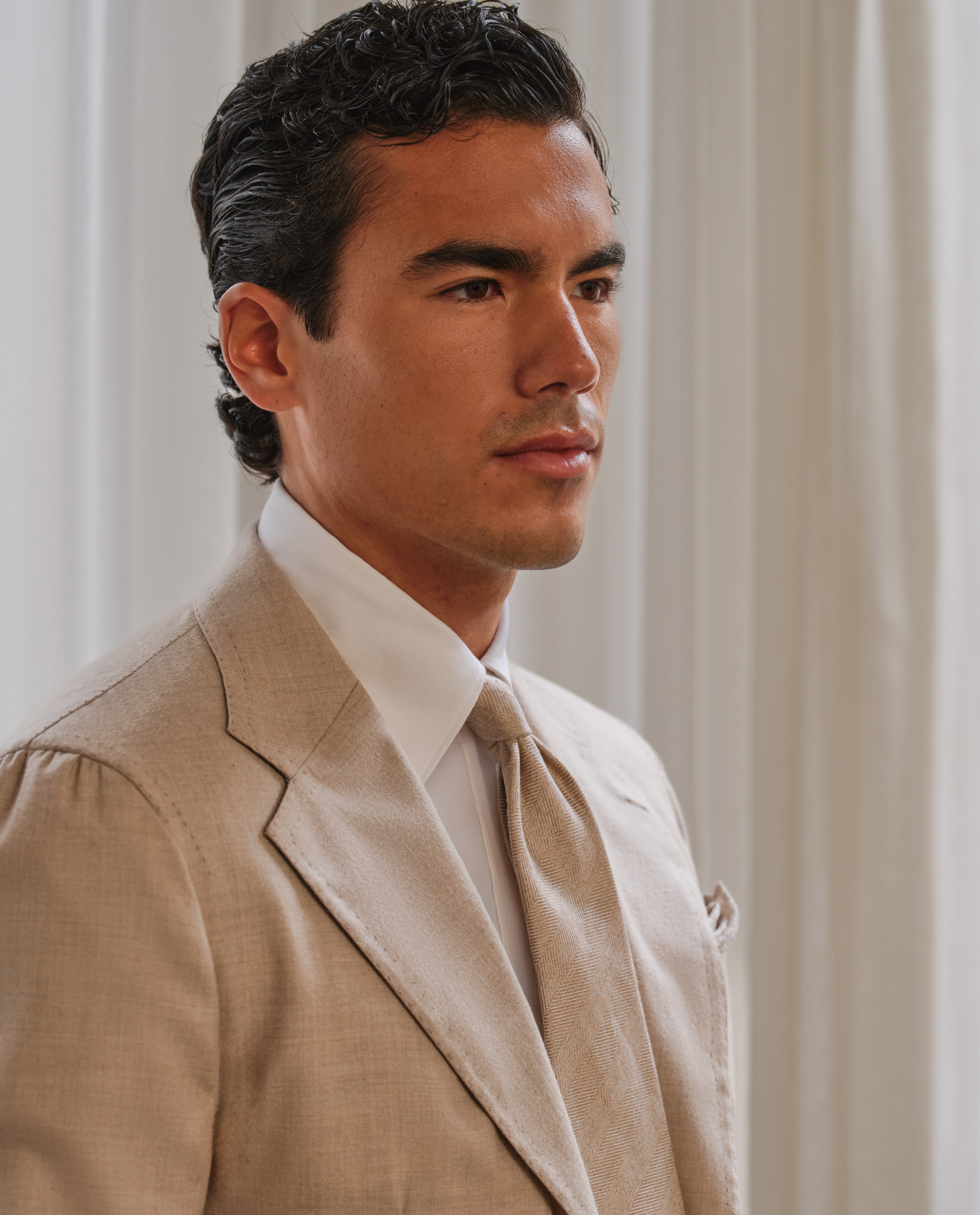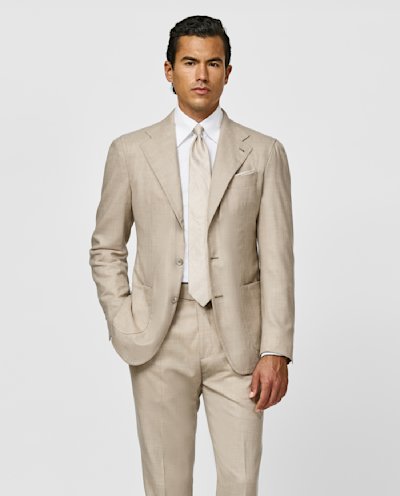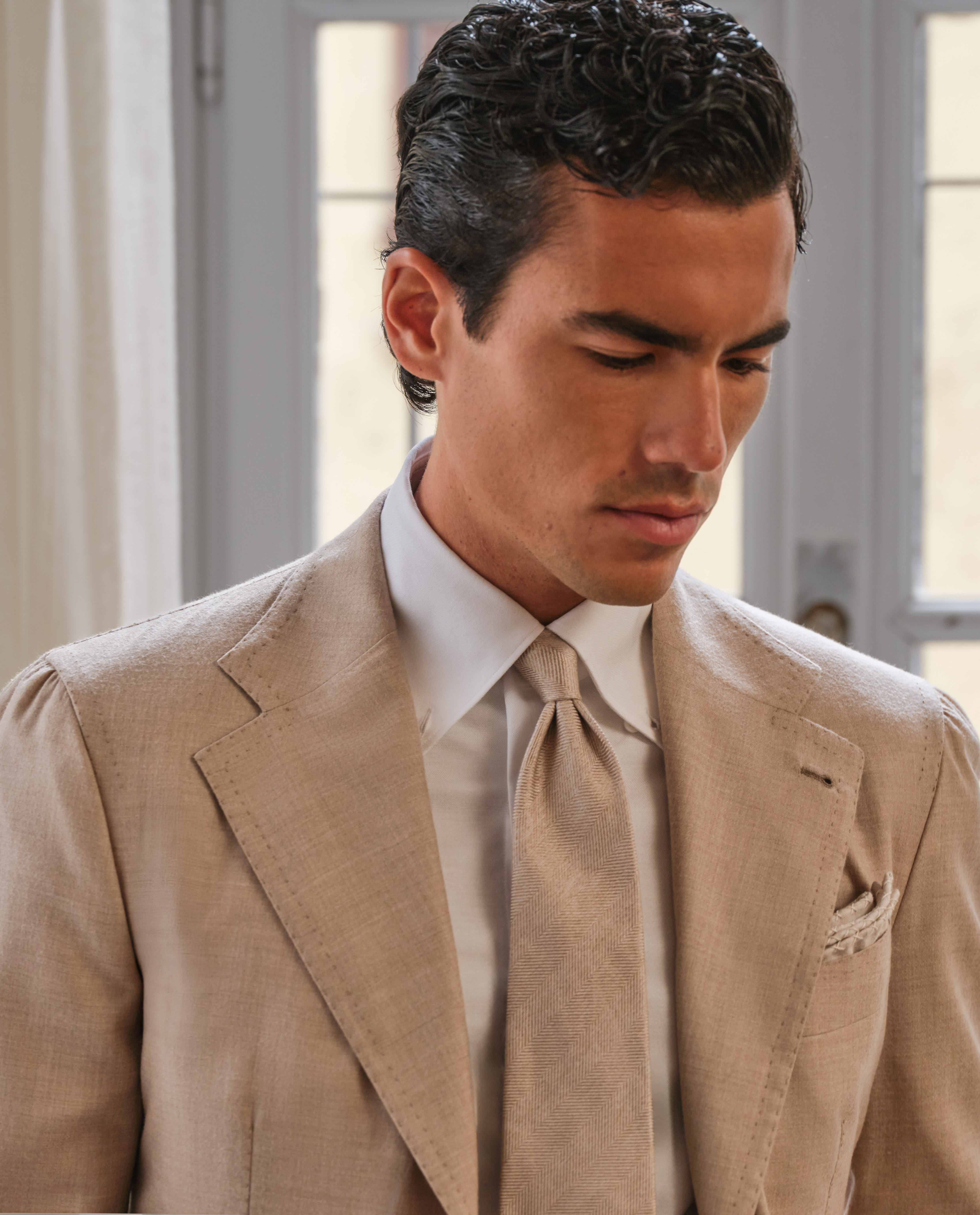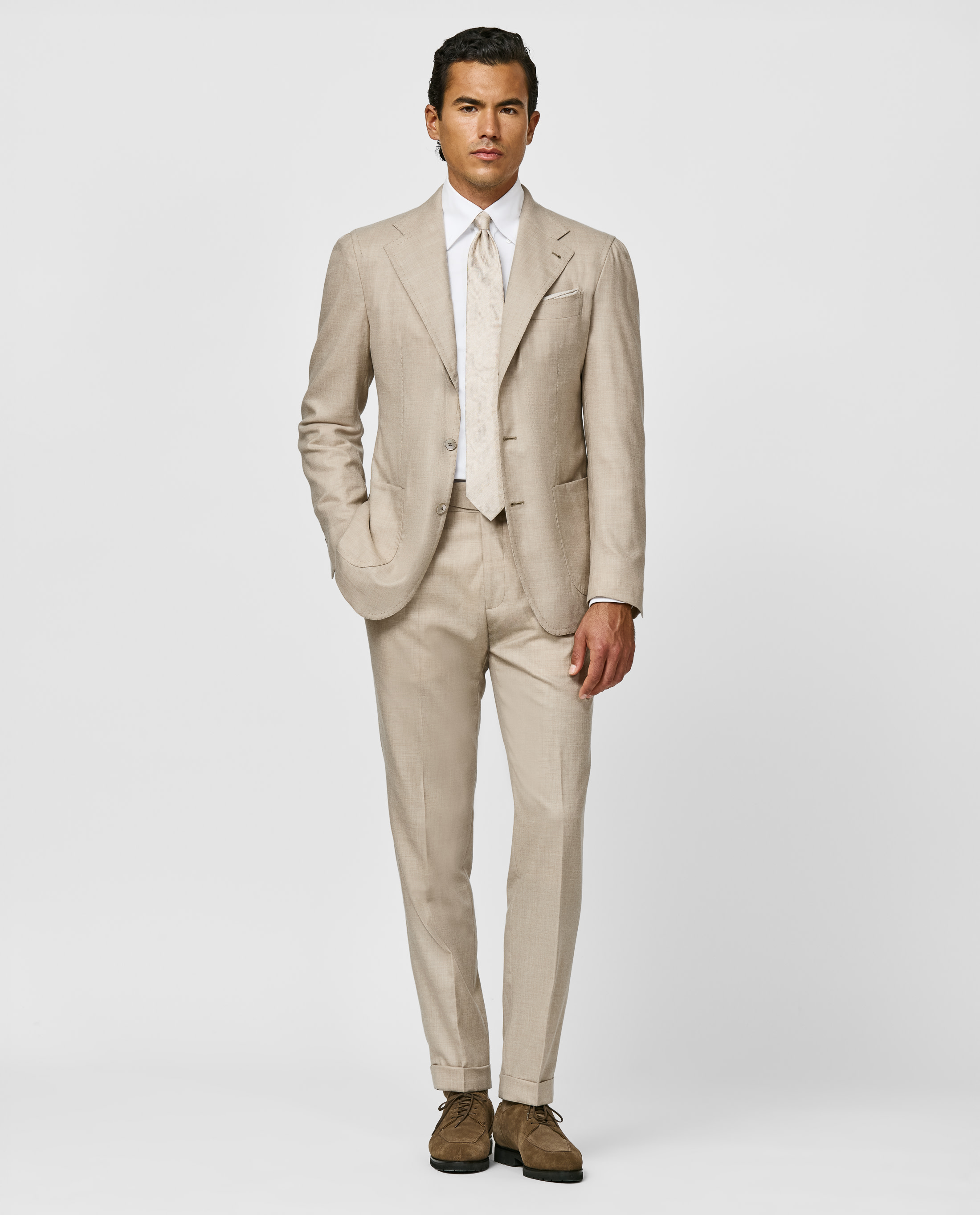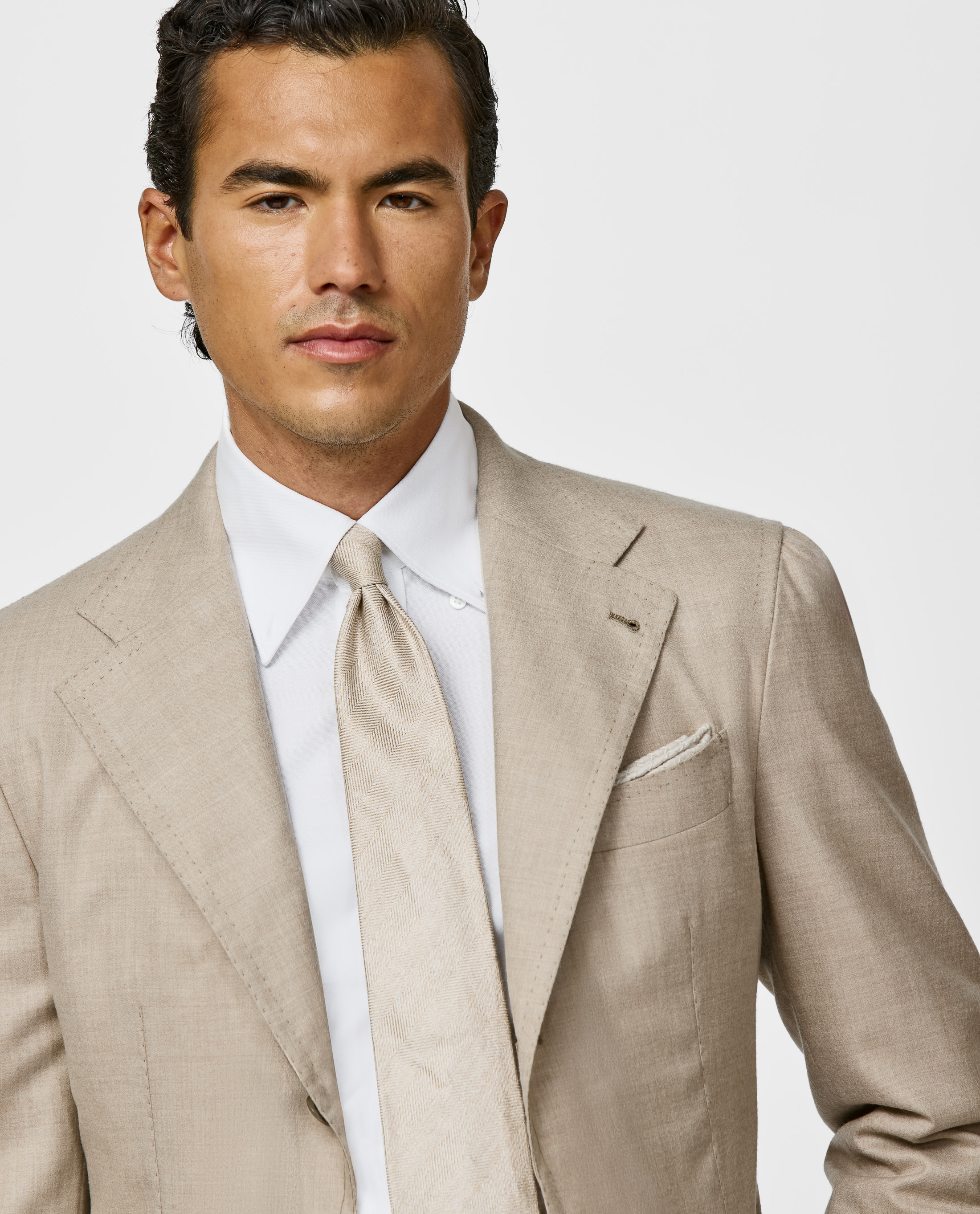 This sand suit is crafted from cashmere made in Italy by Loro Piana. Renowned for its exceptional fineness, purity, and resilience and crafted with technical expertise, the fabric offers a loose, fluid feel combined with added stretch for enhanced comfort and practicality. Style it with a classic white shirt and taupe suede shoes to complete the look. Make this suit your own with our many customization options to choose from.