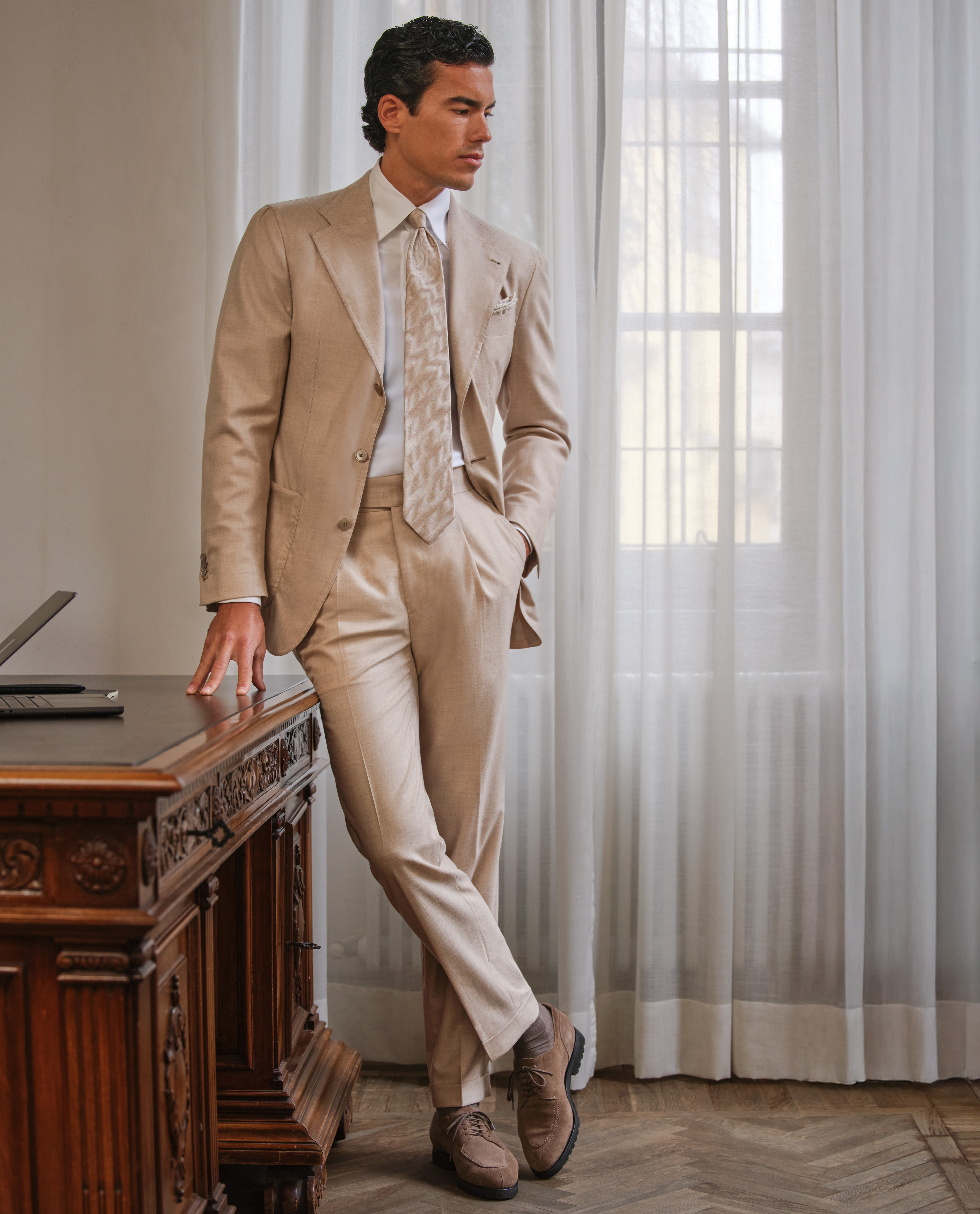 This renowned cashmere blend drapes with ease, offering natural stretch for all-day comfort at the office – the four-button cuff showcases premium craftsmanship and sartorial precision. Style this sand-hued suit with a crisp white shirt, tonal tie, and brown suede shoes for a business look that feels refined yet refreshingly modern.