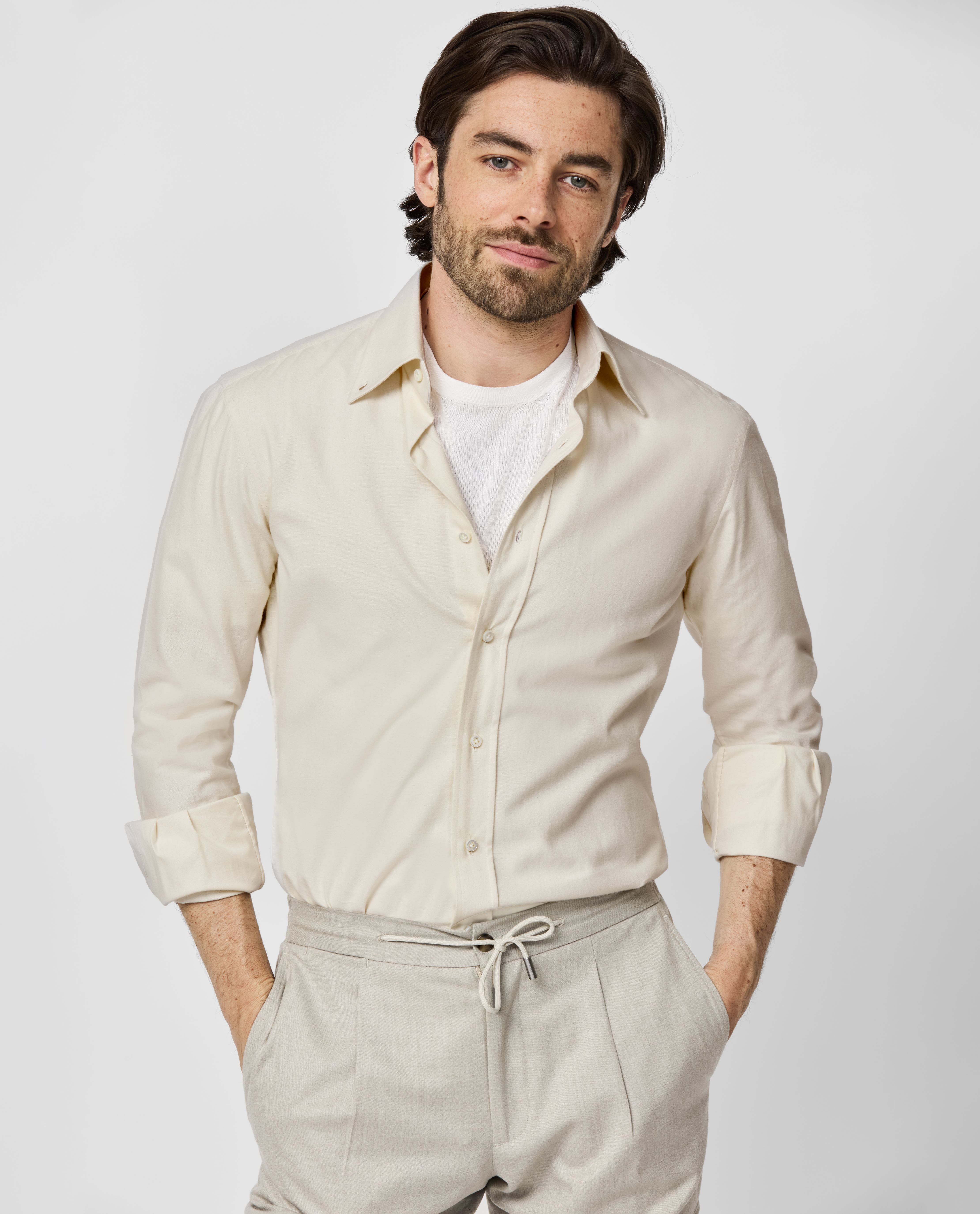 This cream shirt is as warm as wool, as soft as a flannel, but as light as cotton. Made from a light cotton flannel with a sartorial look and a particularly pleasant feel thanks to the brushing on one side and the double-brushing on the other. Designed here with a semi-cutaway collar. Make this shirt your own with our many customization options to choose from. 100% cotton Contains organic cotton Flannel Soft feel