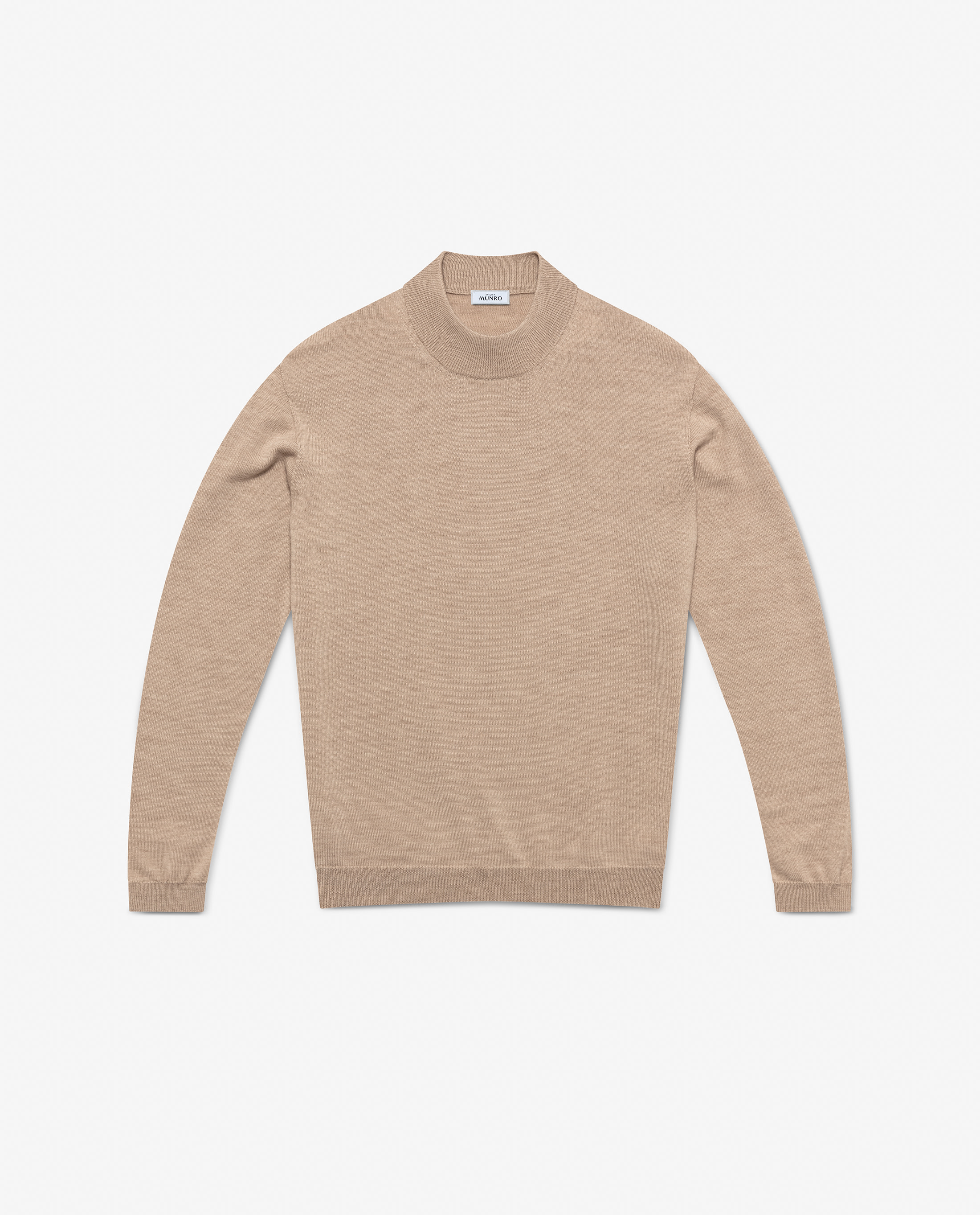 This sandy-hued mélange knit is a comfortable addition to your year-round wardrobe. The extra-fine merino wool is 3D knitted for a luxurious seamless look. Designed here as a mock neck, made from single yarns for a lighter wear. Make this knit your own with our many customization options to choose from.