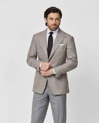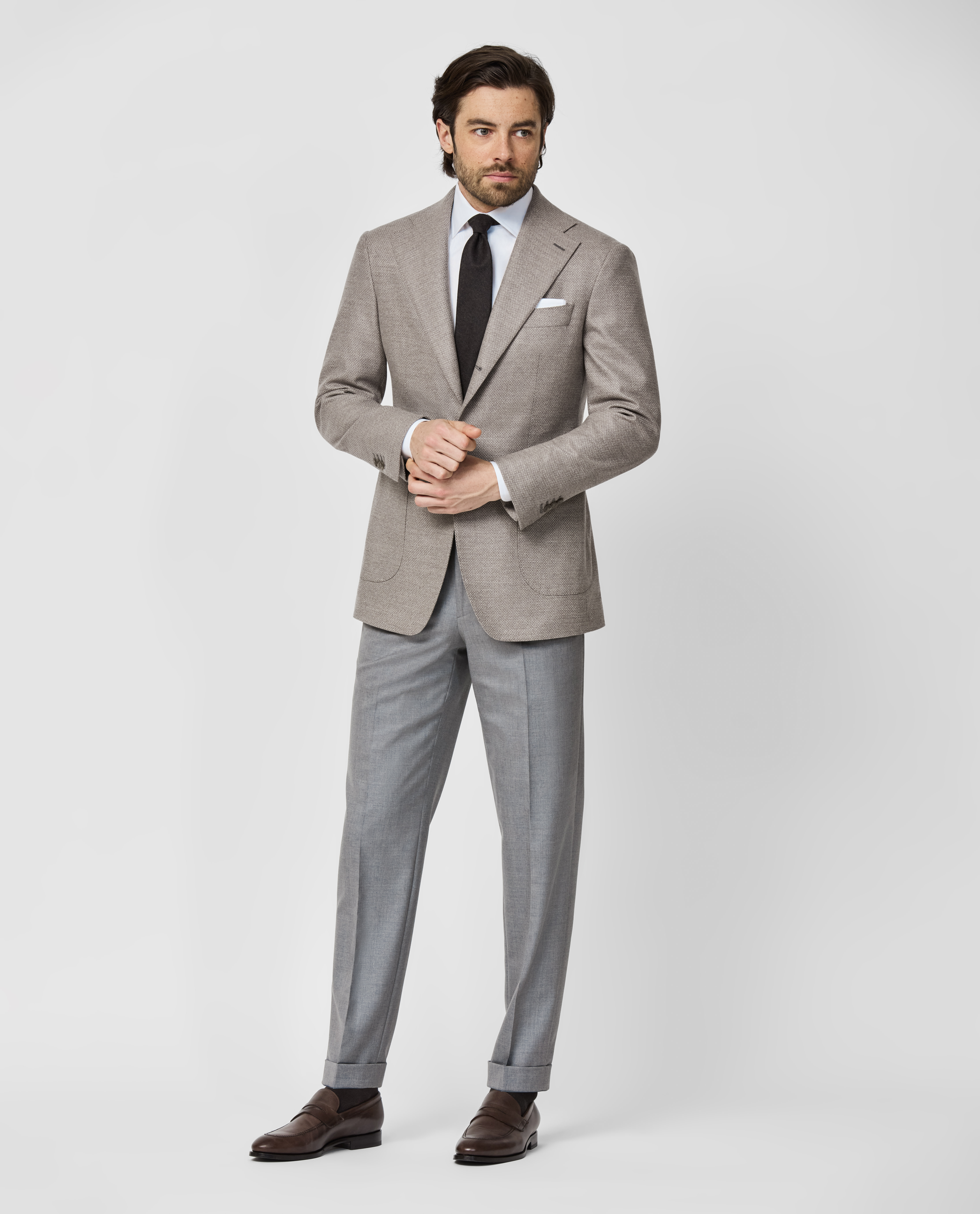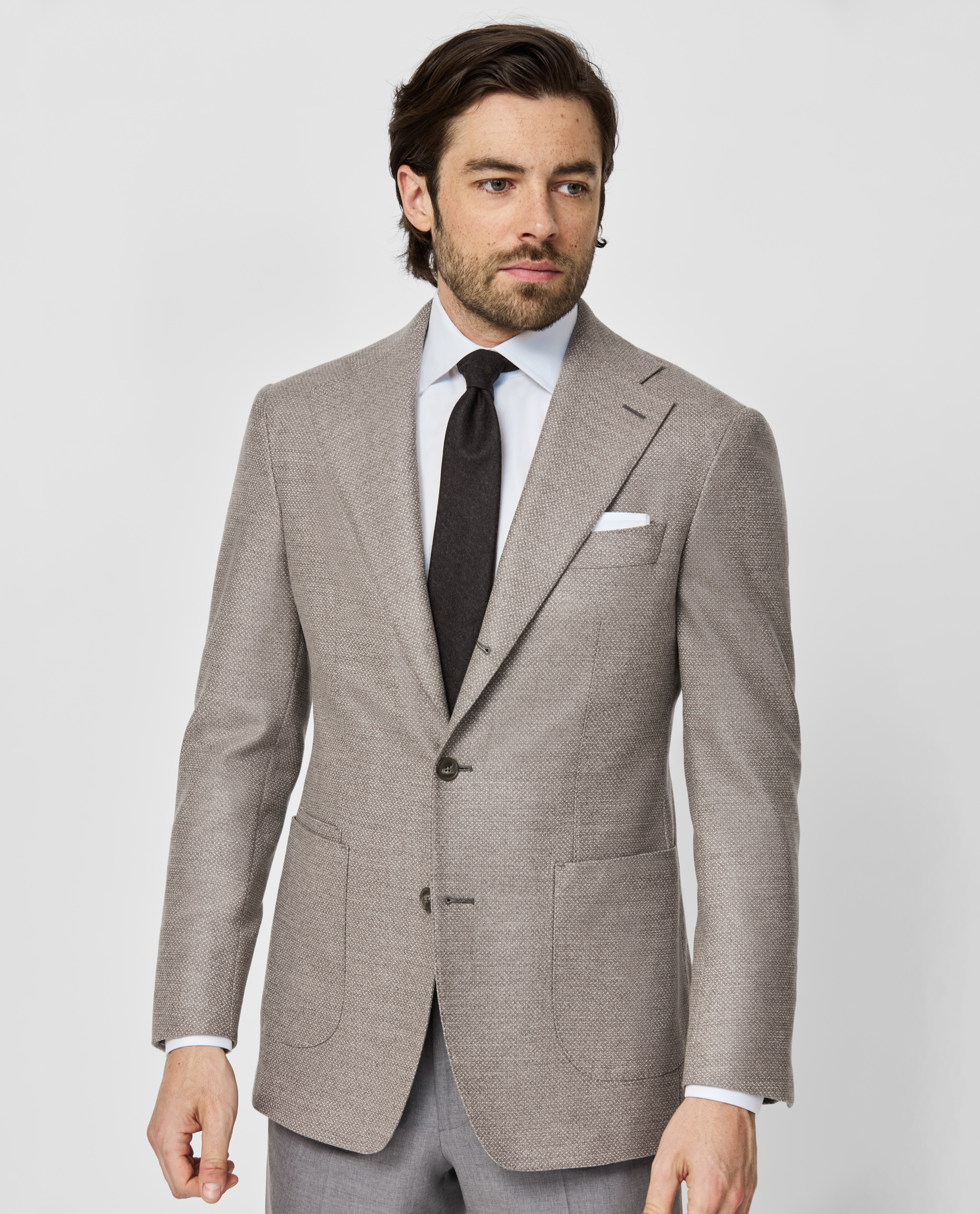 This taupe micro-dotted jacket unites performance, comfort, and elegance. Crafted from Jersely® fabric made in Italy by Loro Piana. Combining the finest pure wool and a small percentage of stretch, this blend is woven on a shuttle loom to create the elasticity of knitted jersey for a soft and breathable garment that moves with the body. Designed here with wide notch lapels. Style it with an Oxford shirt, flannel tie, trousers, and penny loafers to complete the look. Make this jacket your own with our many customization options. Wool blend Stretch Micro-dot Comfortable Breathable