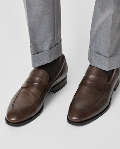 For a versatile look with less formality, try our handmade loafers in dark brown. Made from chrome-tanned calfskin with a subtle sheen finish. Designed here as penny loafers for extra adornment. Make these shoes your own with our many customization options to choose from.