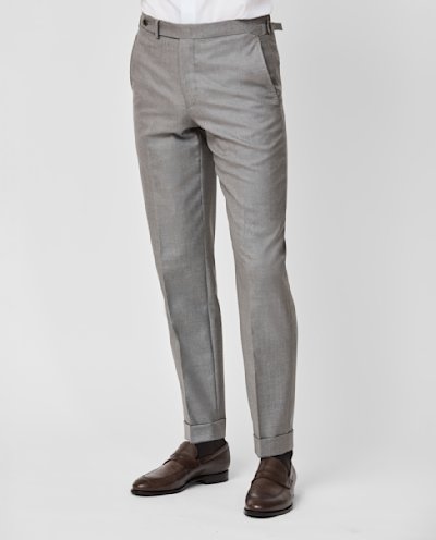 Always be business ready with these crisp gray trousers. The S130 wool is woven from double-twisted yarns offering a smooth appearance with exceptional crease resistance. Designed here with an extended waistband and 4cm turn up. Make these trousers your own with our many customization options to choose from. S130 wool Double-twisted yarns Crease resistant Crisp feel