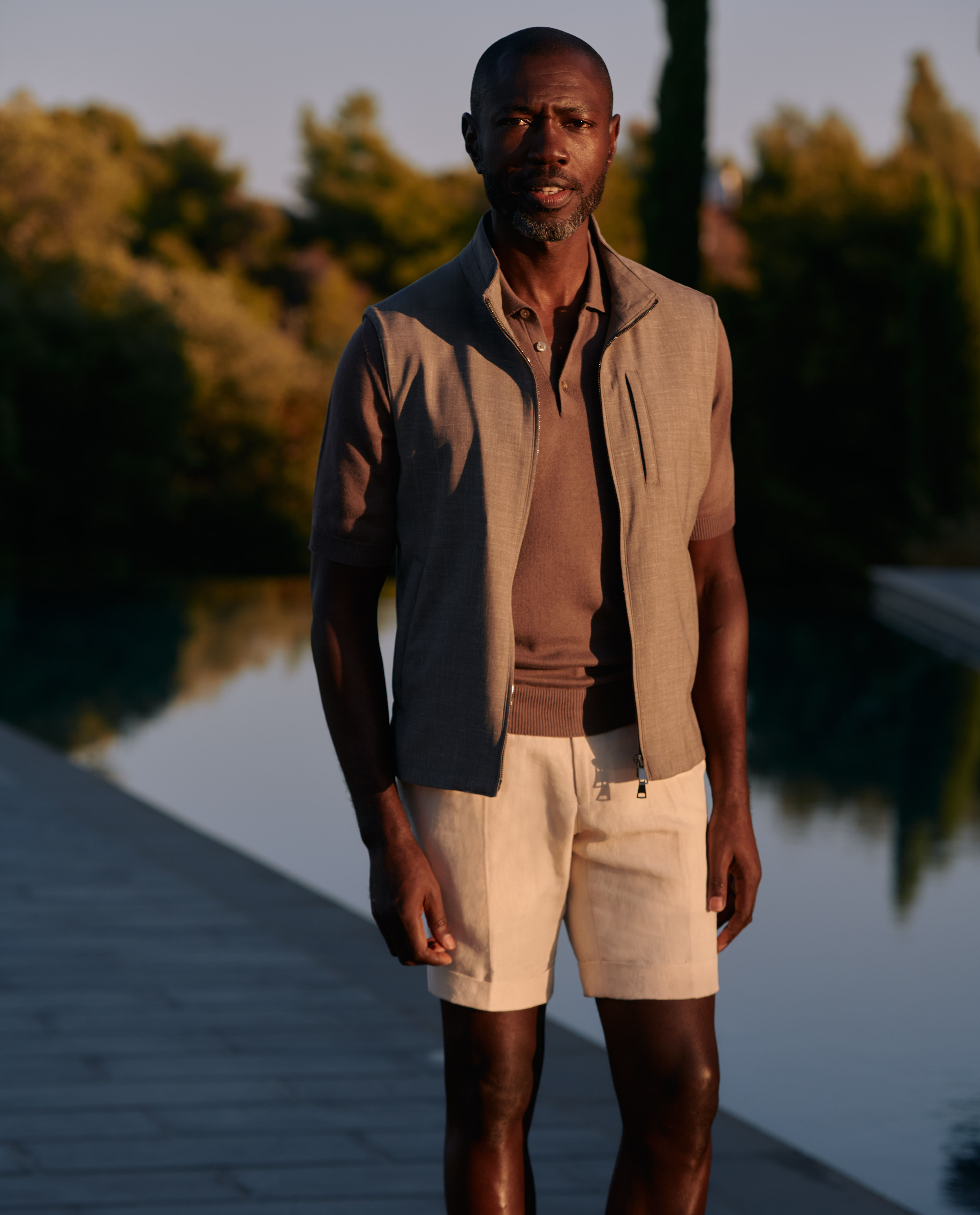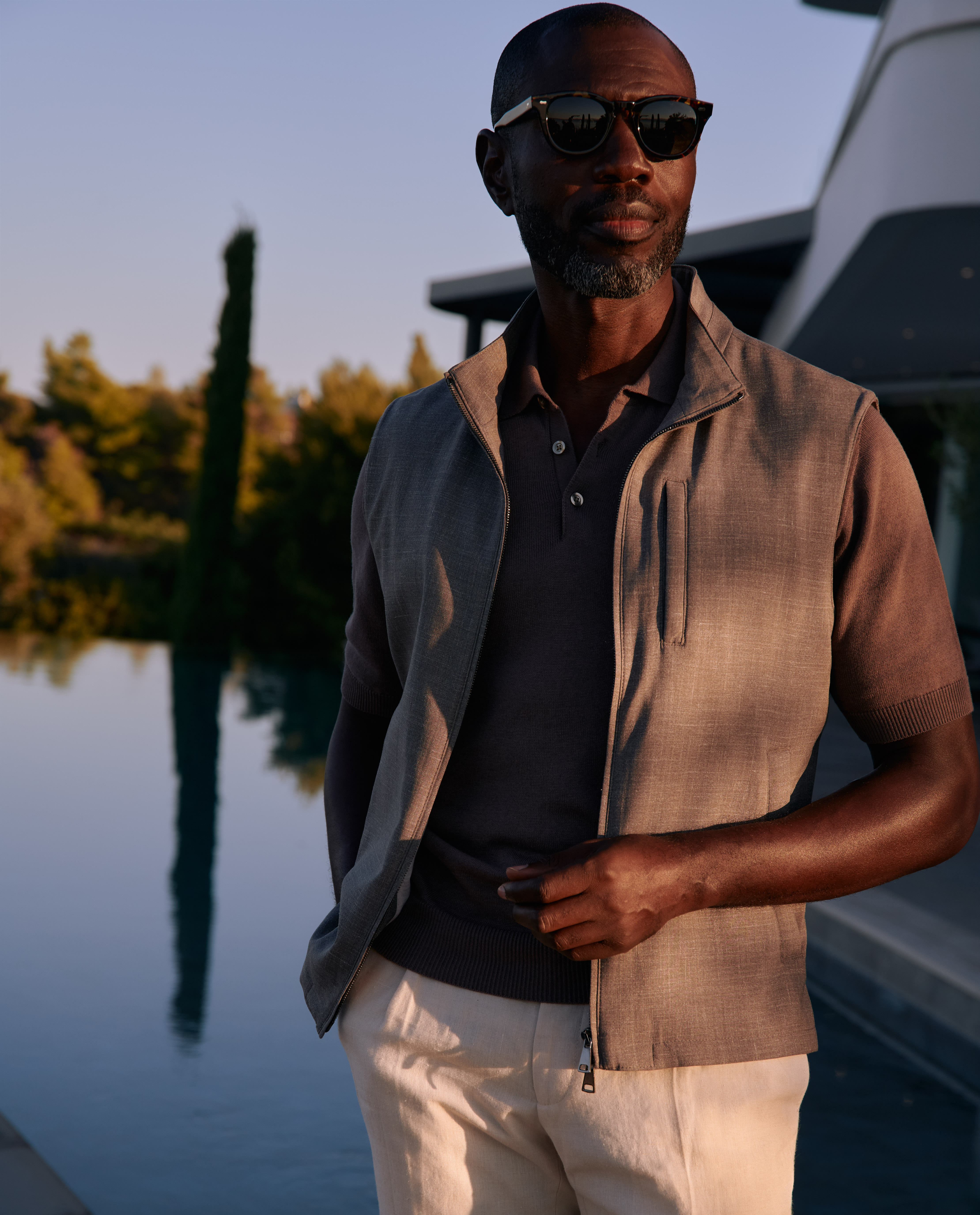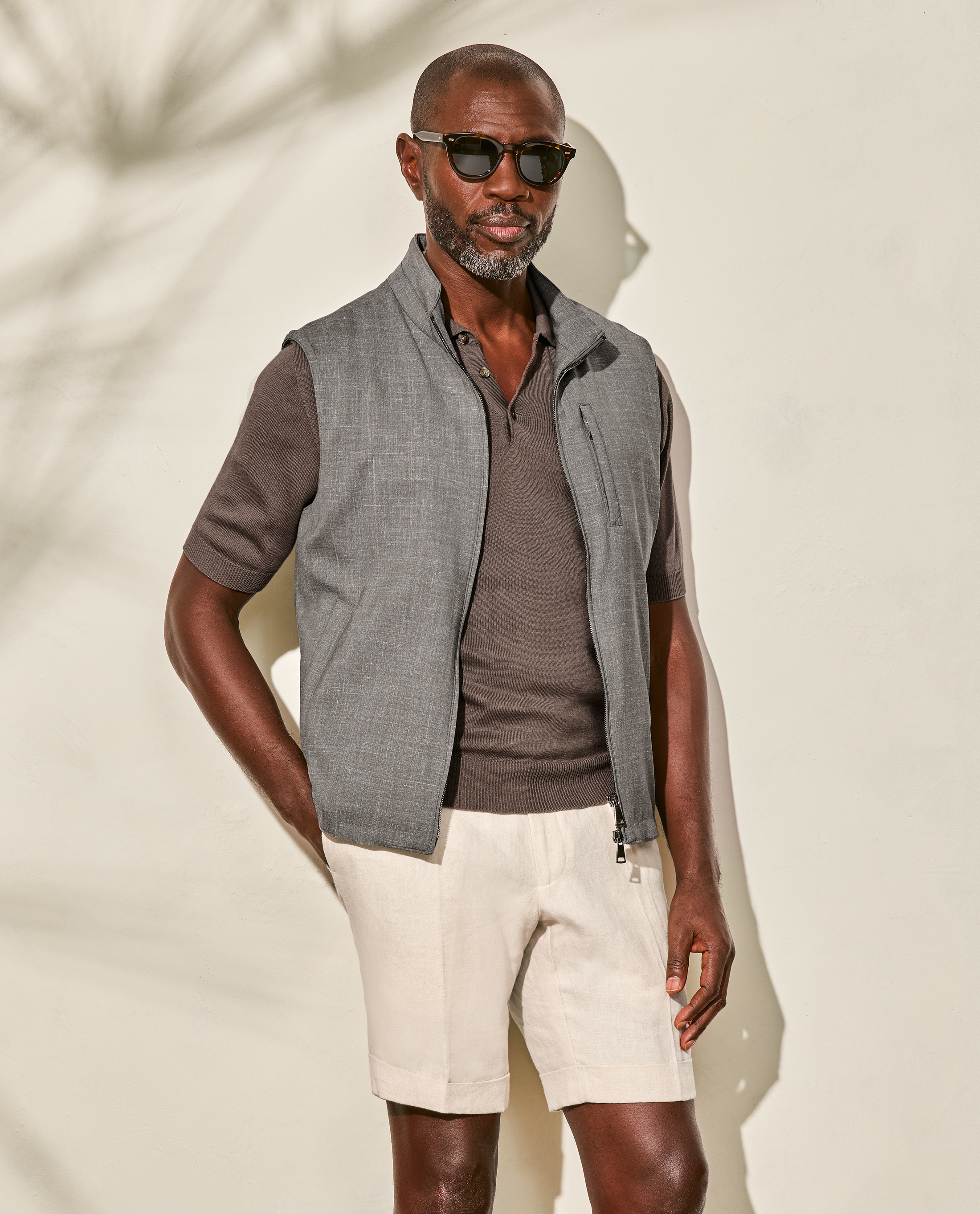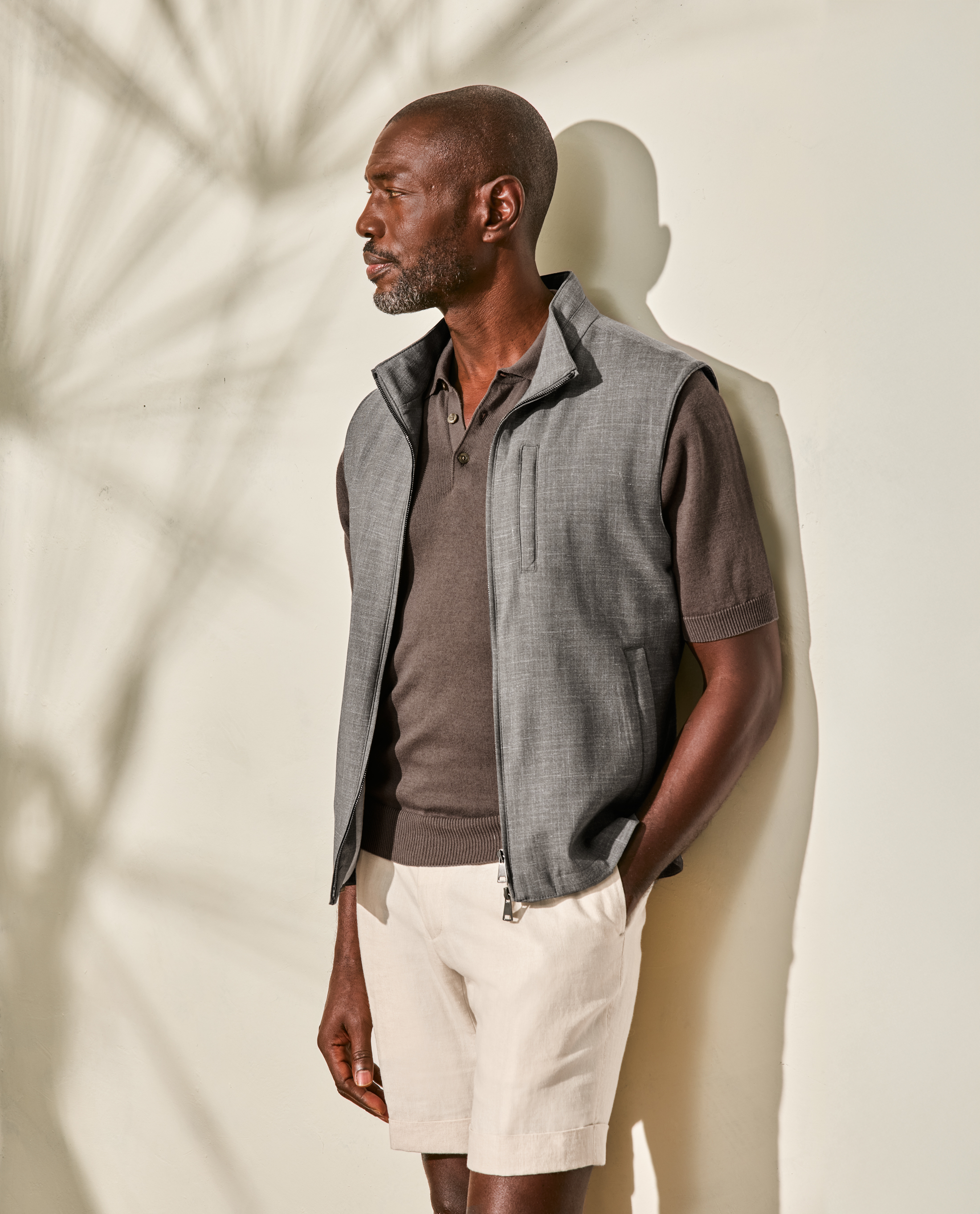 Ideal for warm days with a breeze and shifting temperatures, this taupe stretch vest offers an extra layer and practical pockets without weighing you down. Mirror the warm, natural tones of summer by pairing it with a dark taupe polo knit, sand-colored linen Bermudas, and neutral espadrilles.