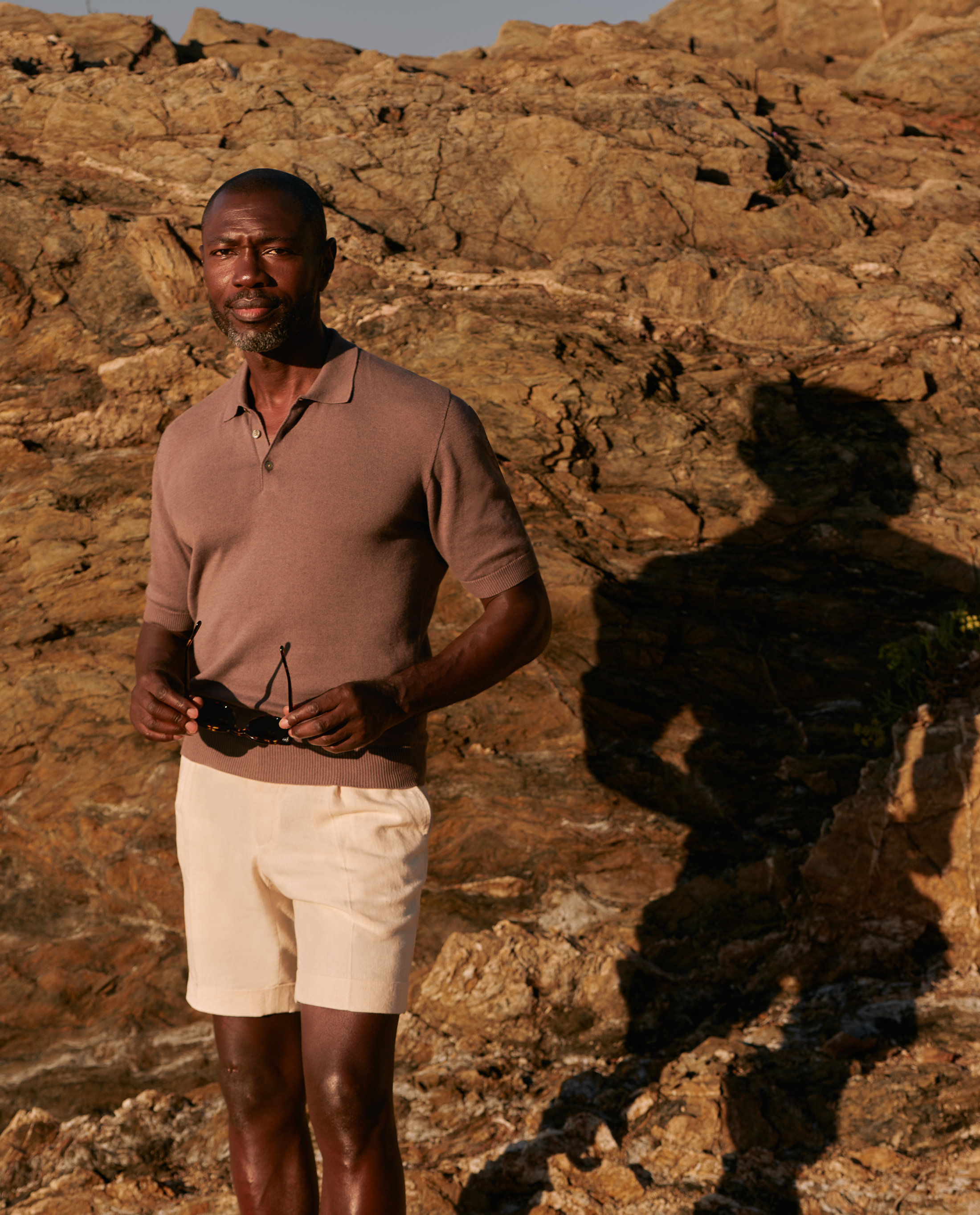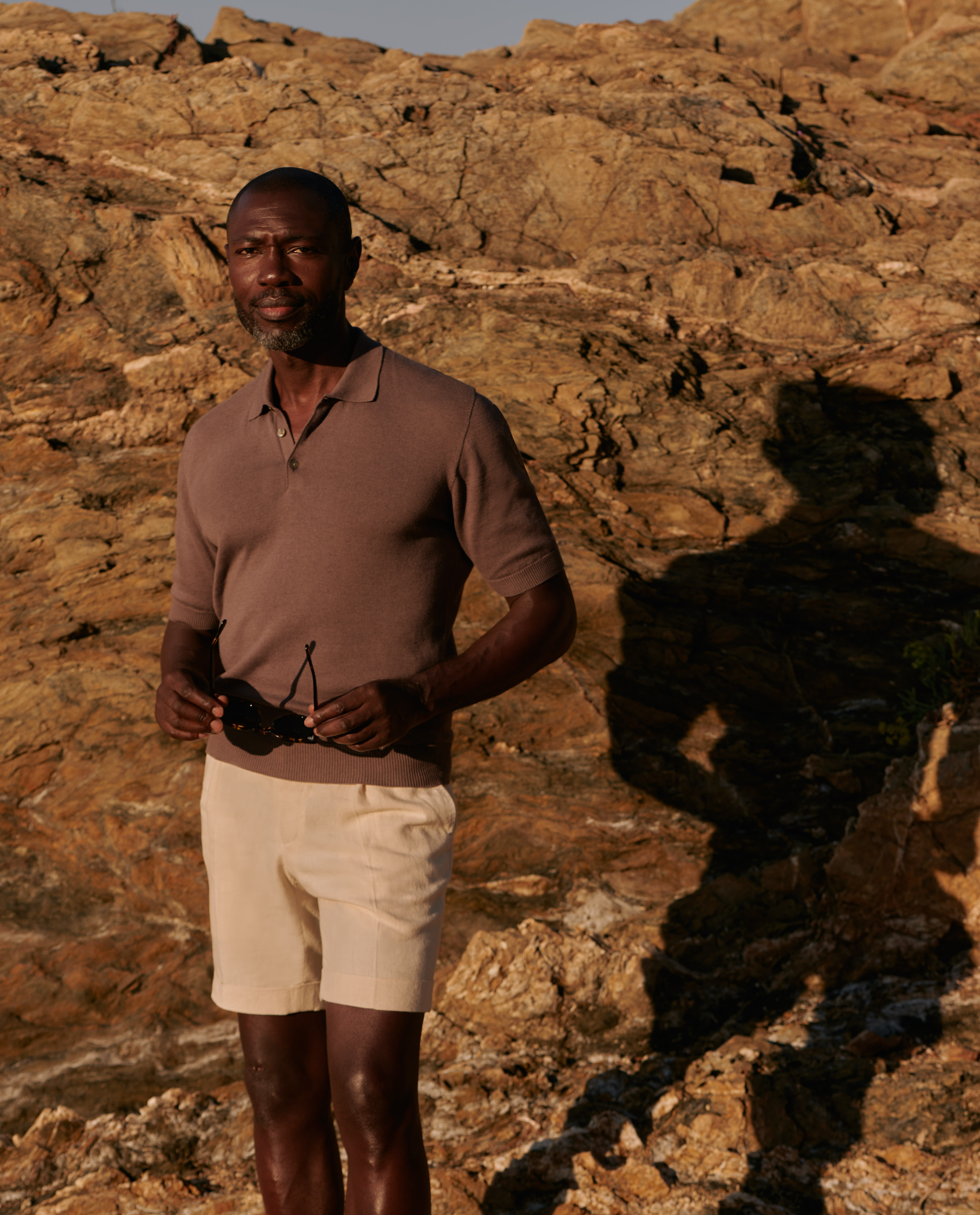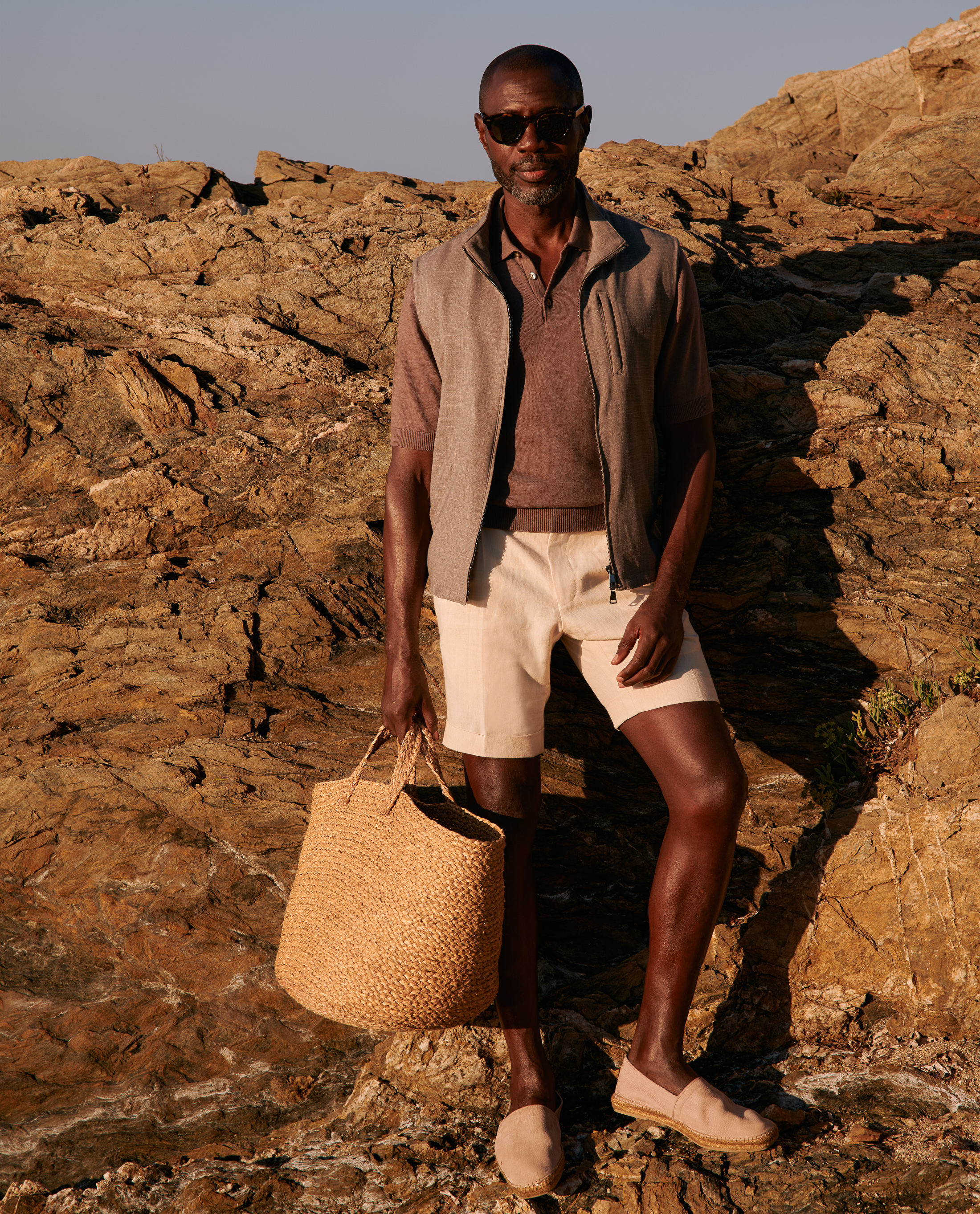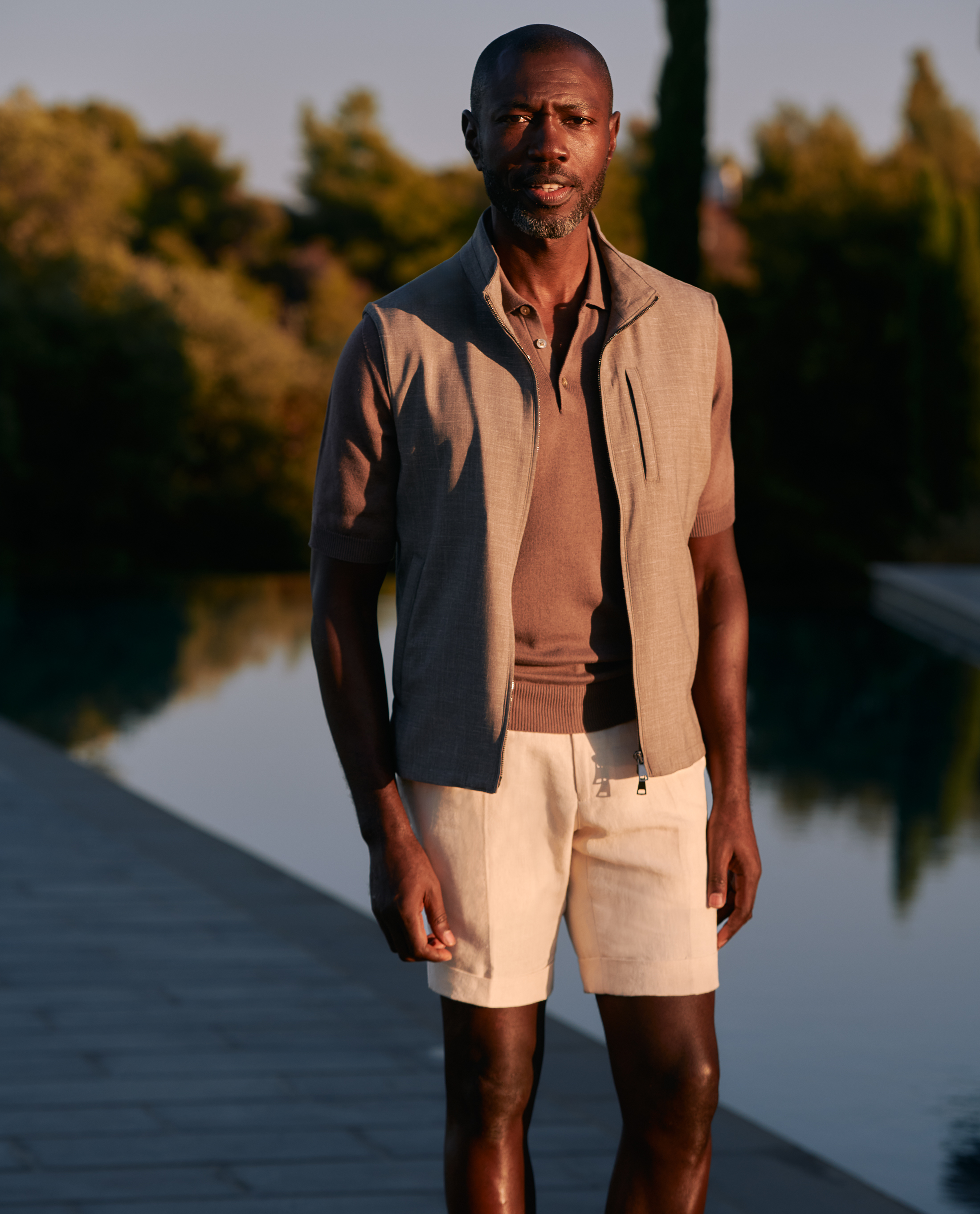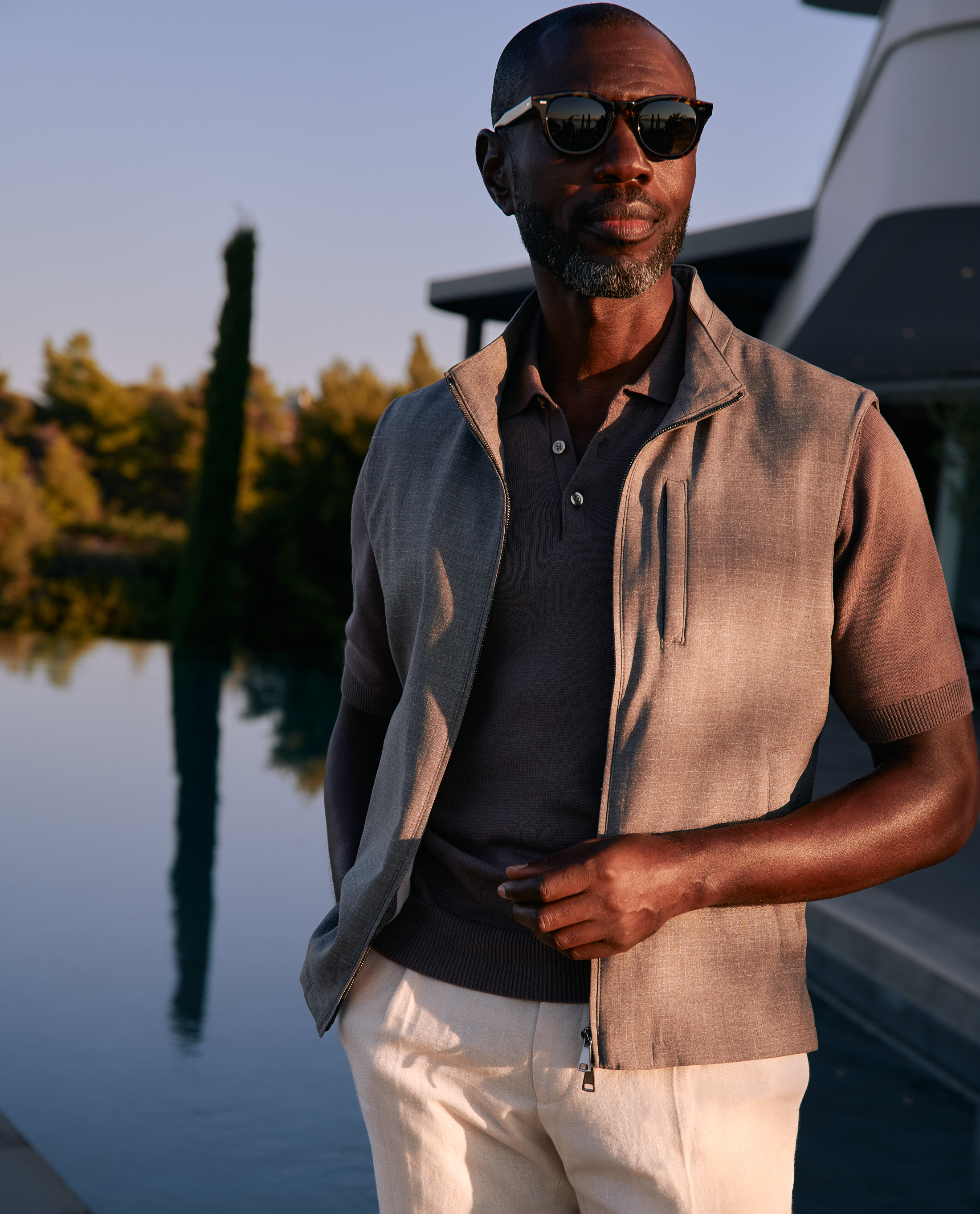 Ideal for warm days with a breeze and shifting temperatures, this taupe stretch vest offers an extra layer and practical pockets without weighing you down. Mirror the warm, natural tones of summer by pairing it with a dark taupe polo knit, sand-colored linen Bermudas, and neutral espadrilles.