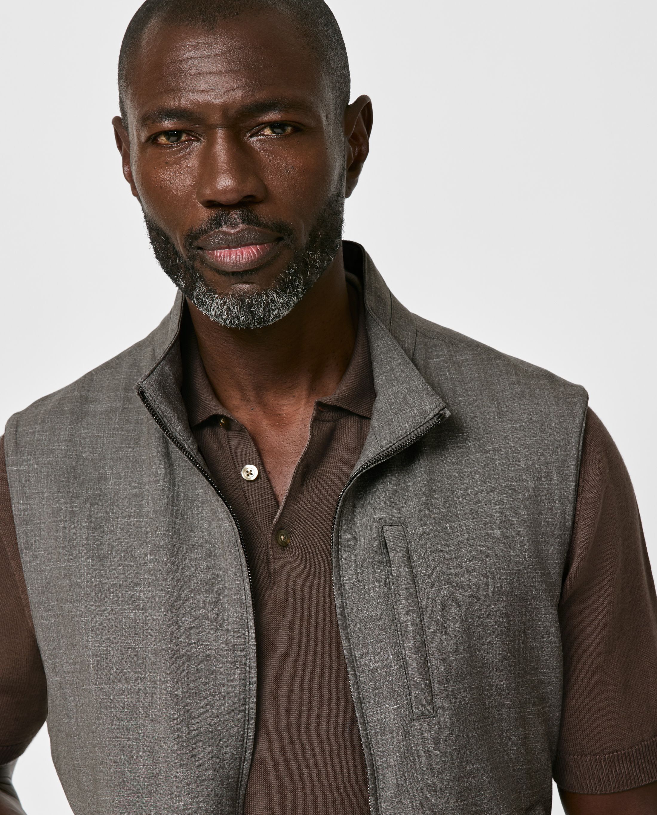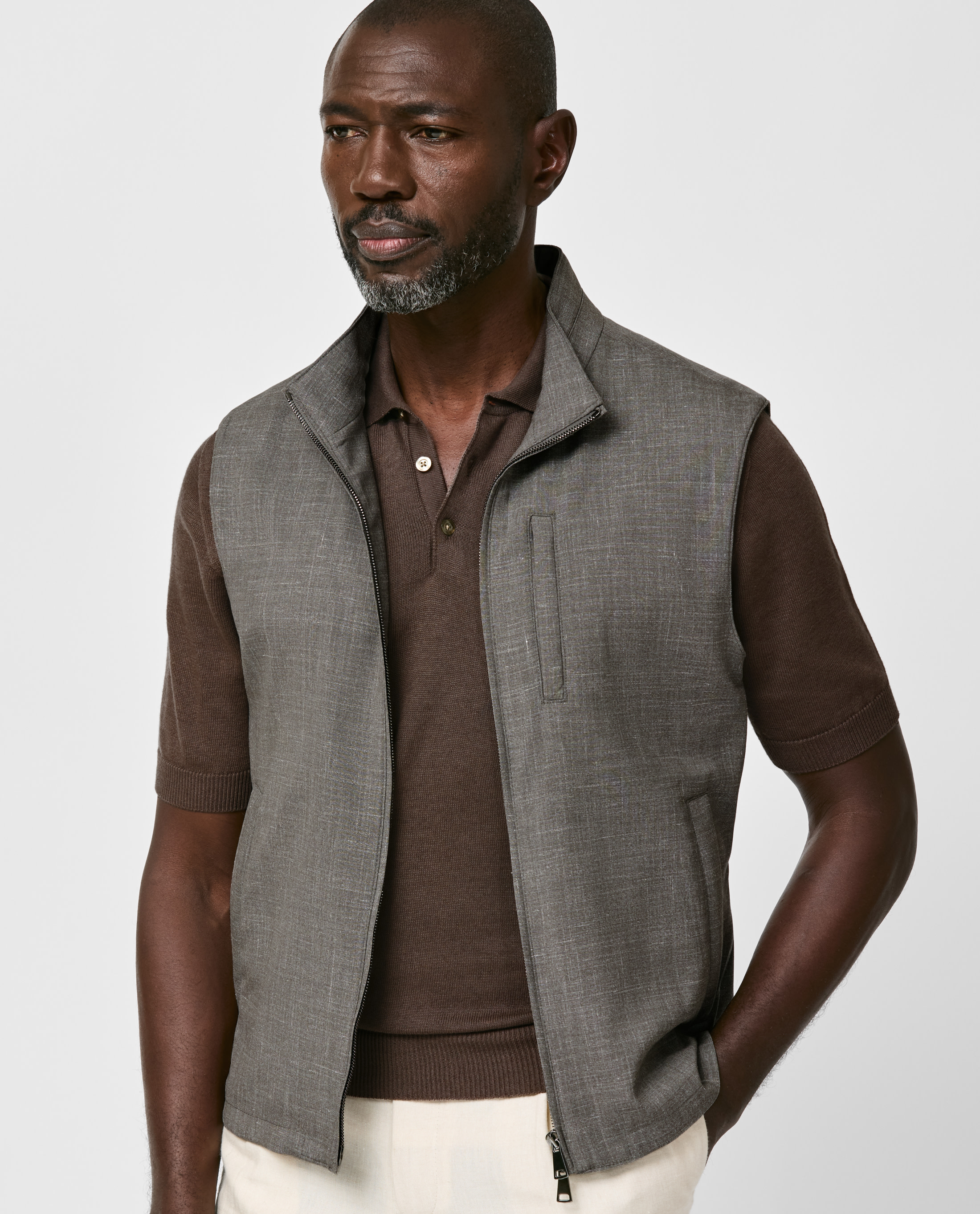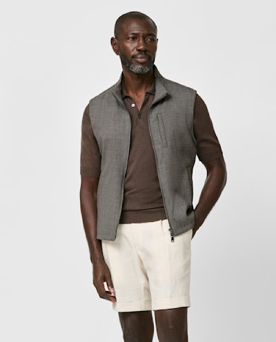 Crafted from Summertime Move® fabric made in Italy by Loro Piana, this earthy taupe vest combines a luxurious and breathable wool-silk-linen blend with added stretch for refined warm-weather comfort. Designed here with a practical two-way zip closure and vertical zip chest pocket. Pair it with a summer knit, linen Bermudas, and your favorite espadrilles to create a lightweight, smart-casual seasonal look. Prefer a different style? Every piece is made exclusively for you, with your choice of design options. Stretch wool, silk & linen Plain weave Subtle shine Breathable Lightweight