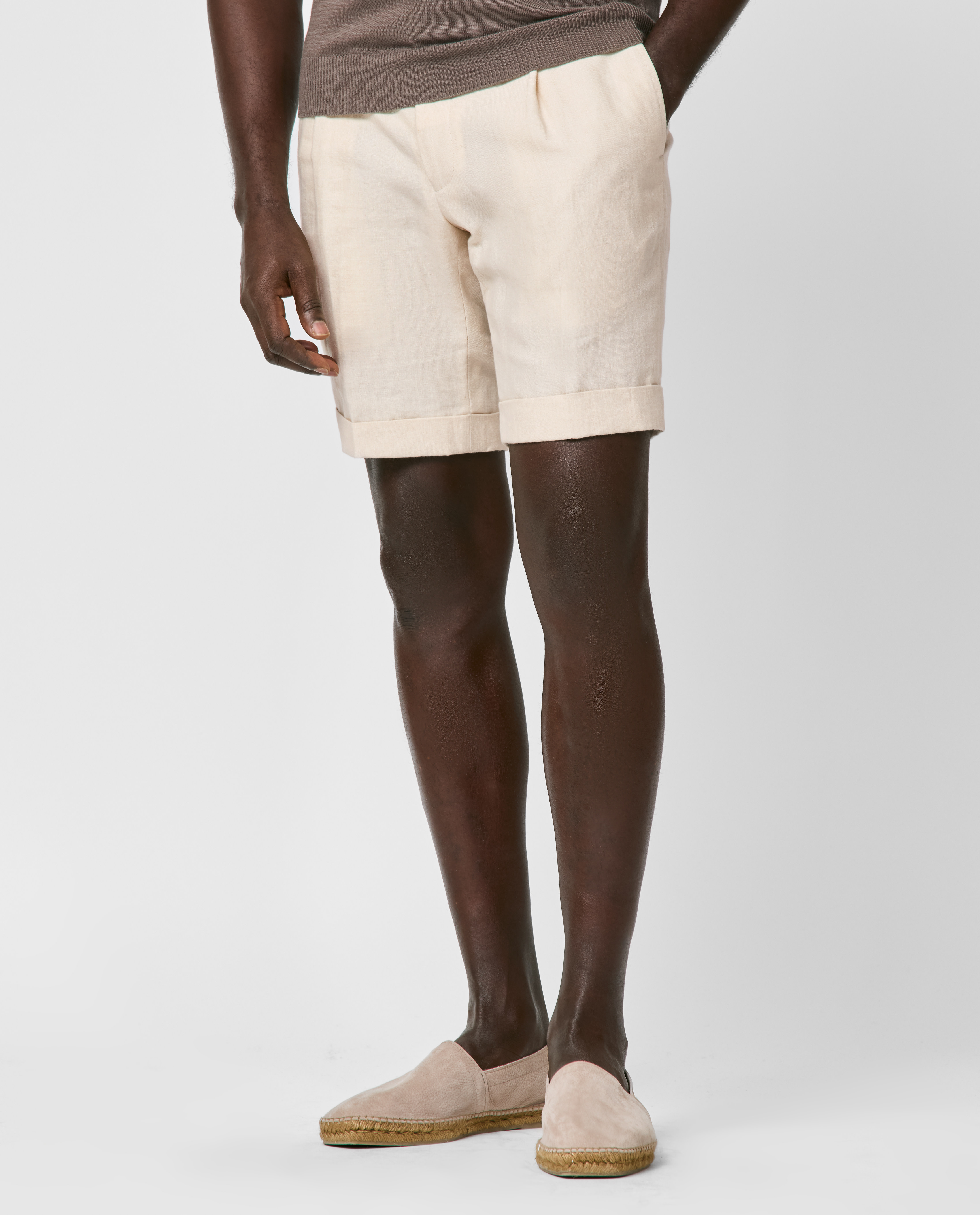 Bring freshness to your warm-weather wardrobe with these sand-colored linen shorts. Crafted from robust and hollow fibers, allowing for excellent regulation of body temperature and moisture absorption with durability. Designed here as bermuda shorts with pleats. Make these shorts your own with our many customization options to choose from. 100% linen Summer fiber Breathable Durable