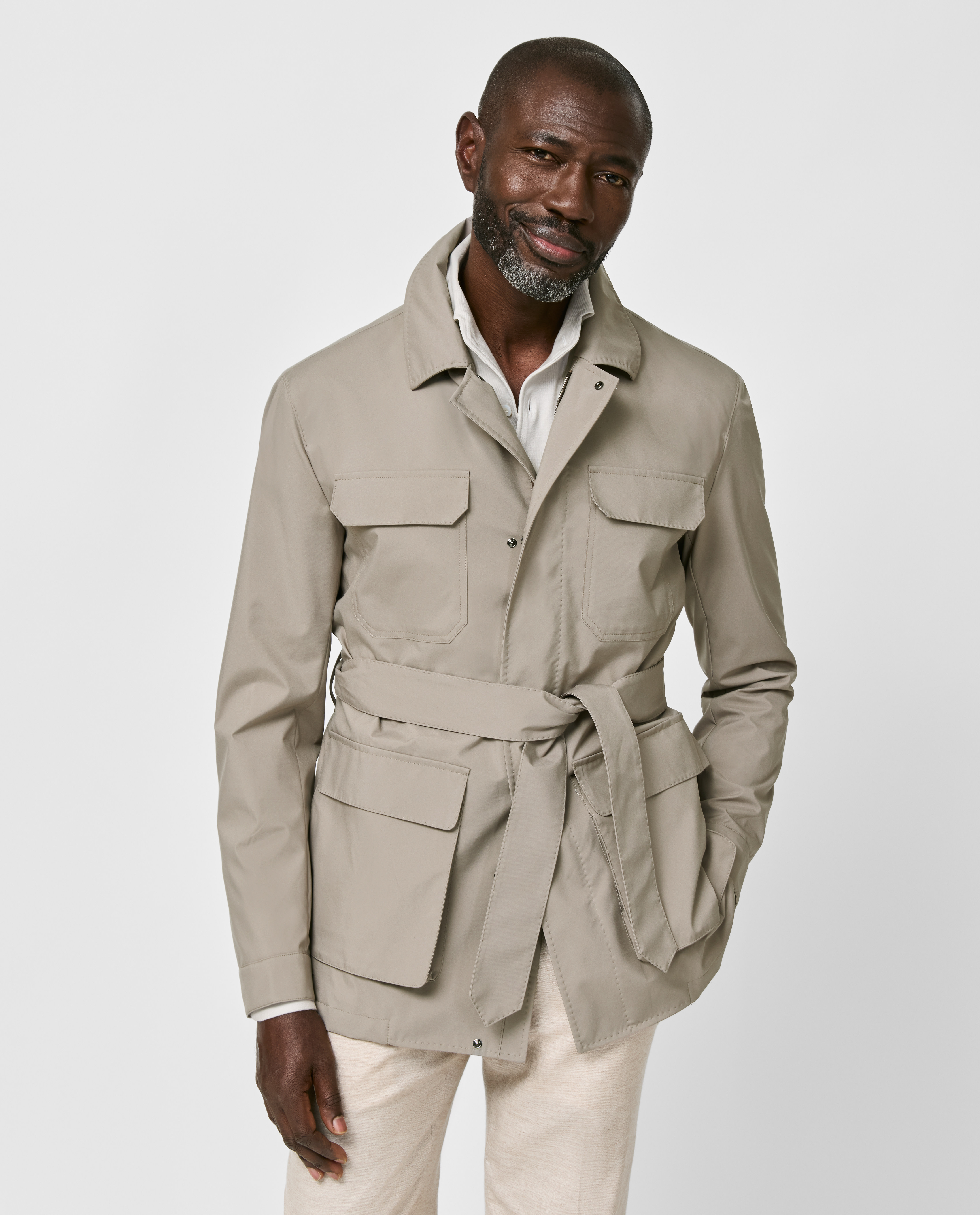 Crafted from highly functional technical fabric in the versatile shade of taupe, this utility jacket with zip combines smart-casual practicality with lightweight water repellence to keep you cool, dry, and ready for any weather or summer adventure. Designed here with utility patch with flap chest pockets, and bellow side pockets. This piece is shown with a removable safari belt, available exclusively through your style advisor. To add it to your order, please contact your style advisor. Pair it with your favorite light-colored stretch essentials and suede shoes to create a comfortable, smart-casual seasonal look.