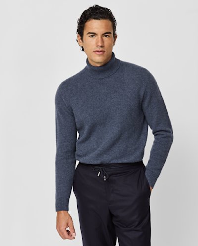 A luxurious denim blue knit with an elevated seamless look. Made from pure cashmere for a soft feel with superior warmth. Designed here as a turtleneck, in double ply for winter warmth. Make this knitwear your own with our many customization options to choose from. 100% cashmere Lightweight warmth Breathable Soft feel