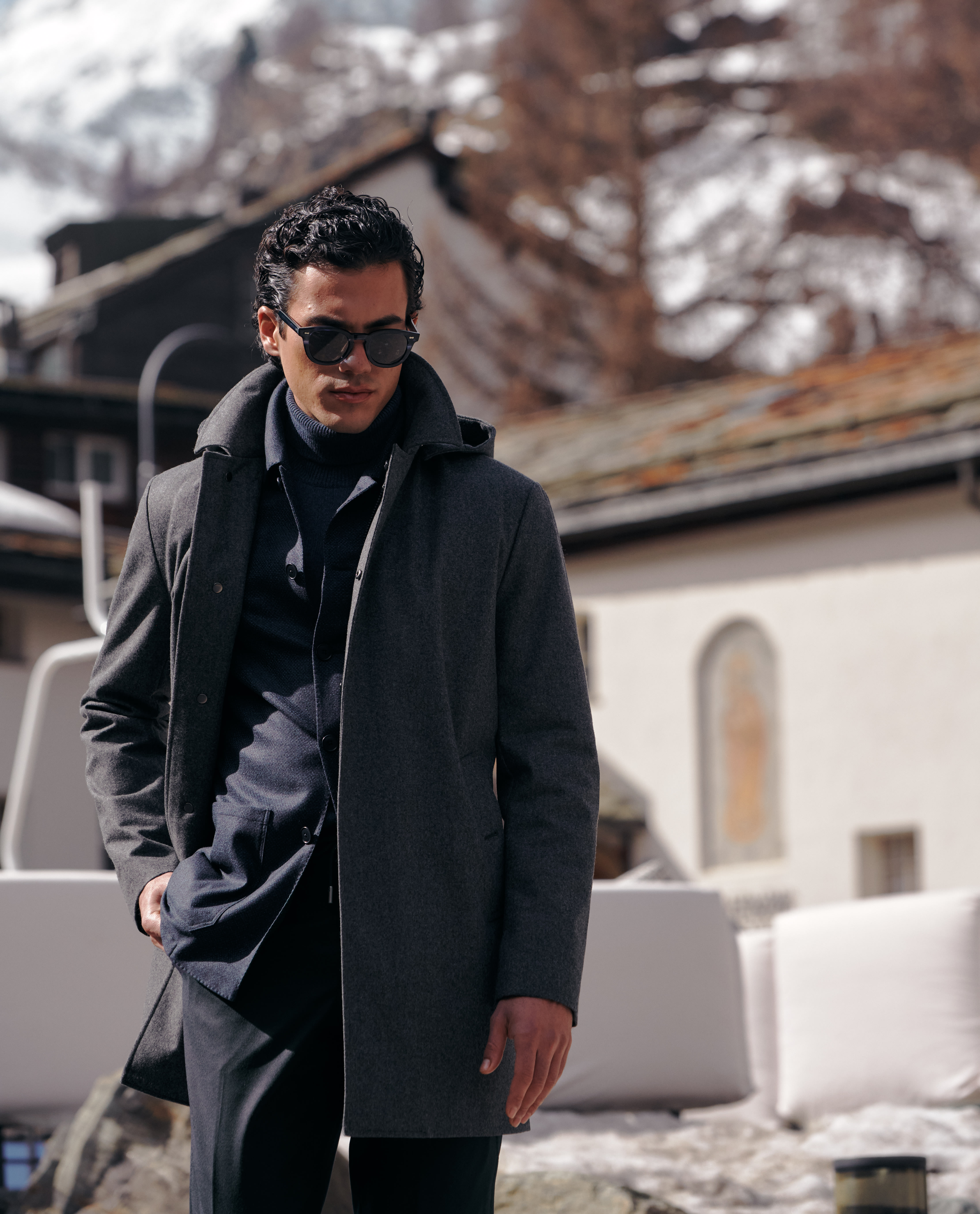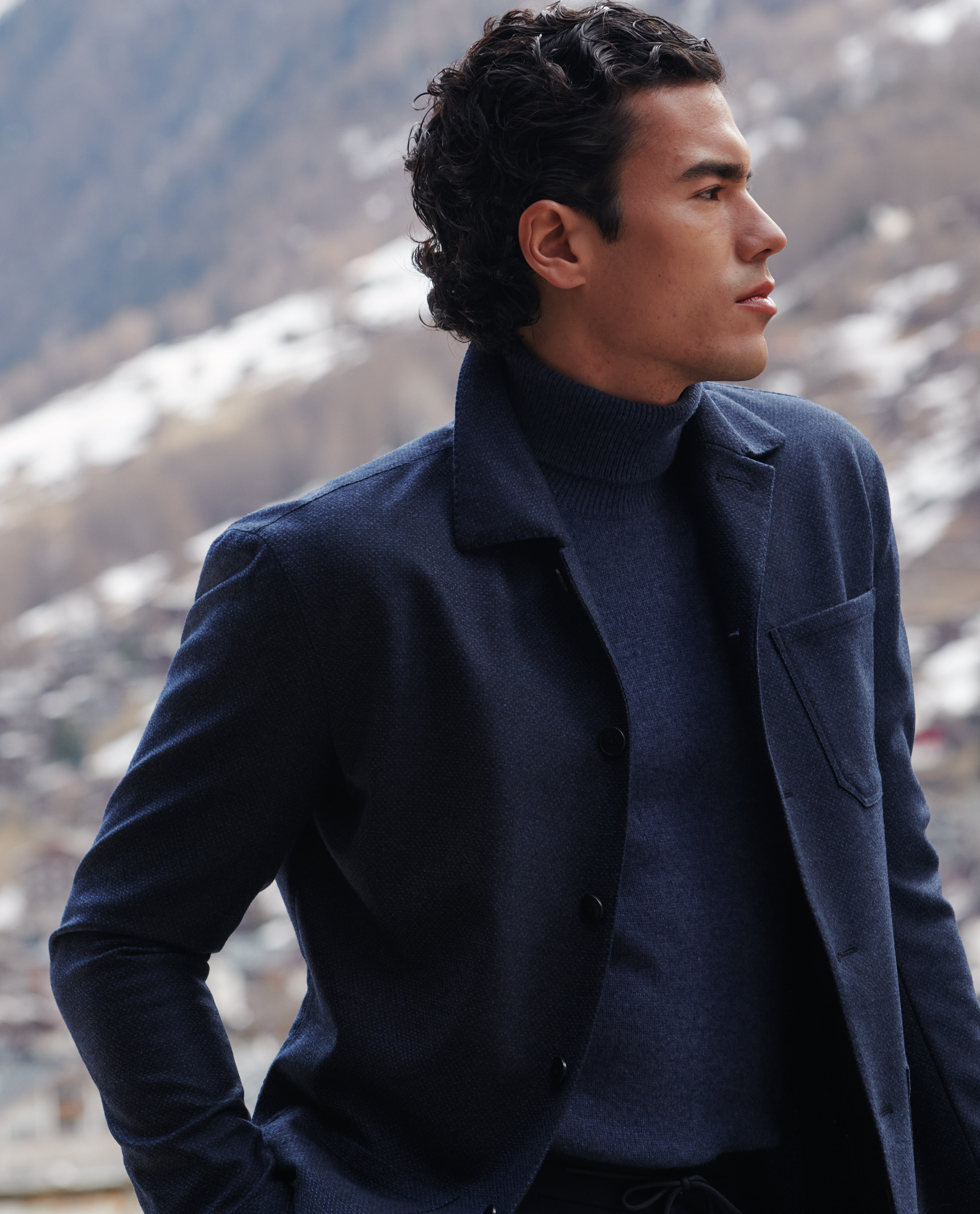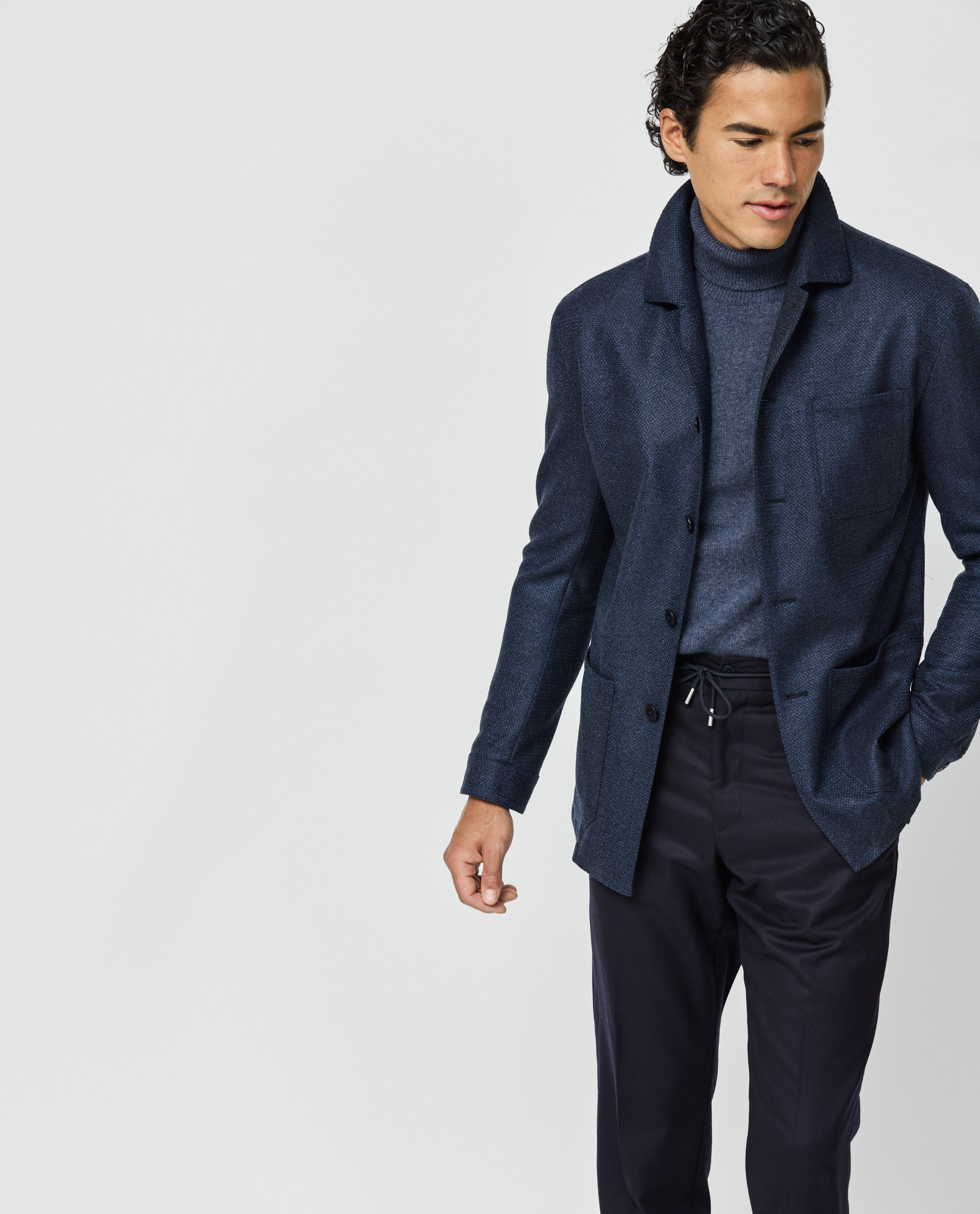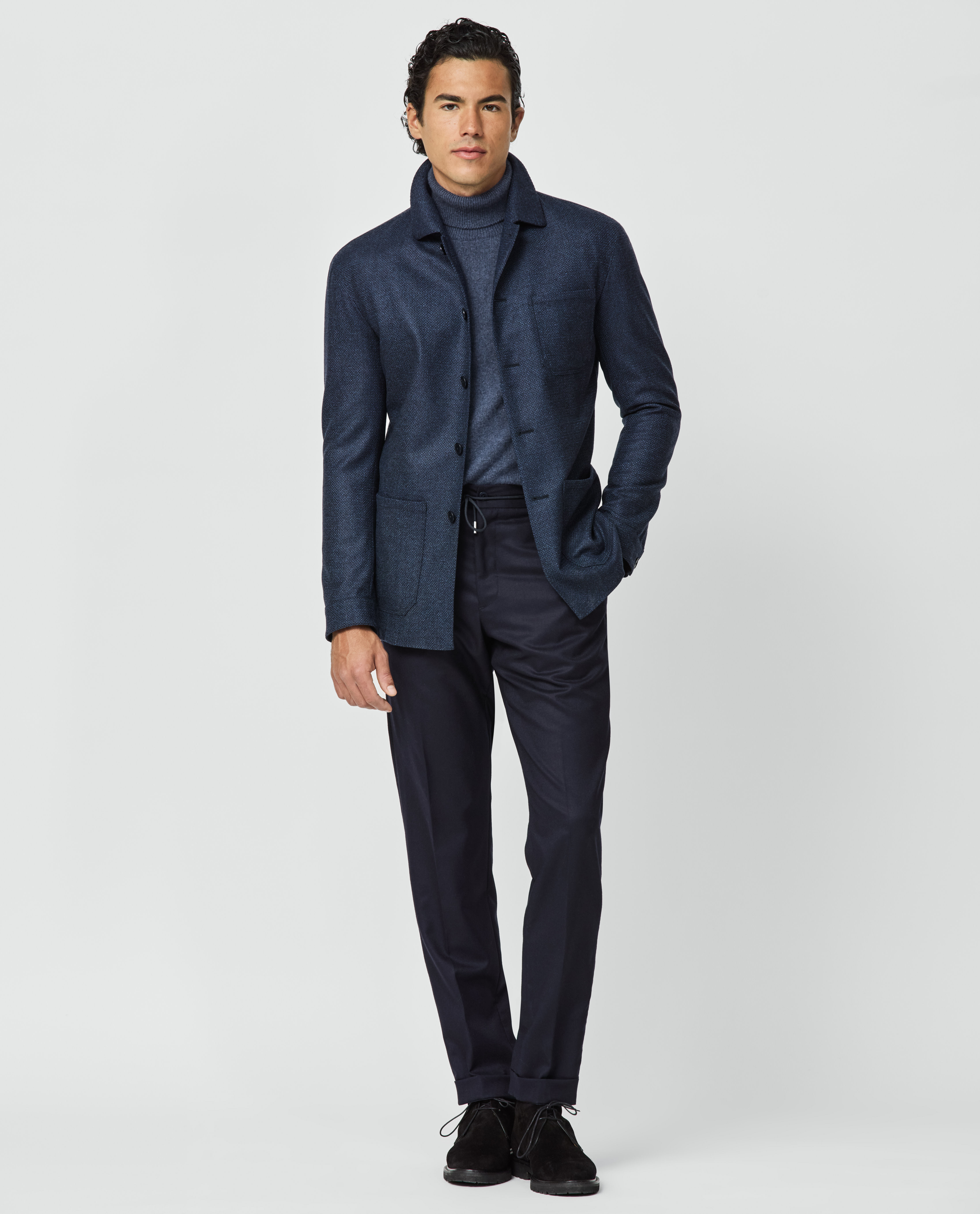 Nothing says modern and refined quite like a utility jacket crafted from one of the world’s finest fabrics. Extra elegant when paired with your favorite tonal separates, like this cashmere turtleneck with flannel drawstring trousers and suede Bluchers. Headed out? Slip on a weather-proof coat for superior protection from the elements.