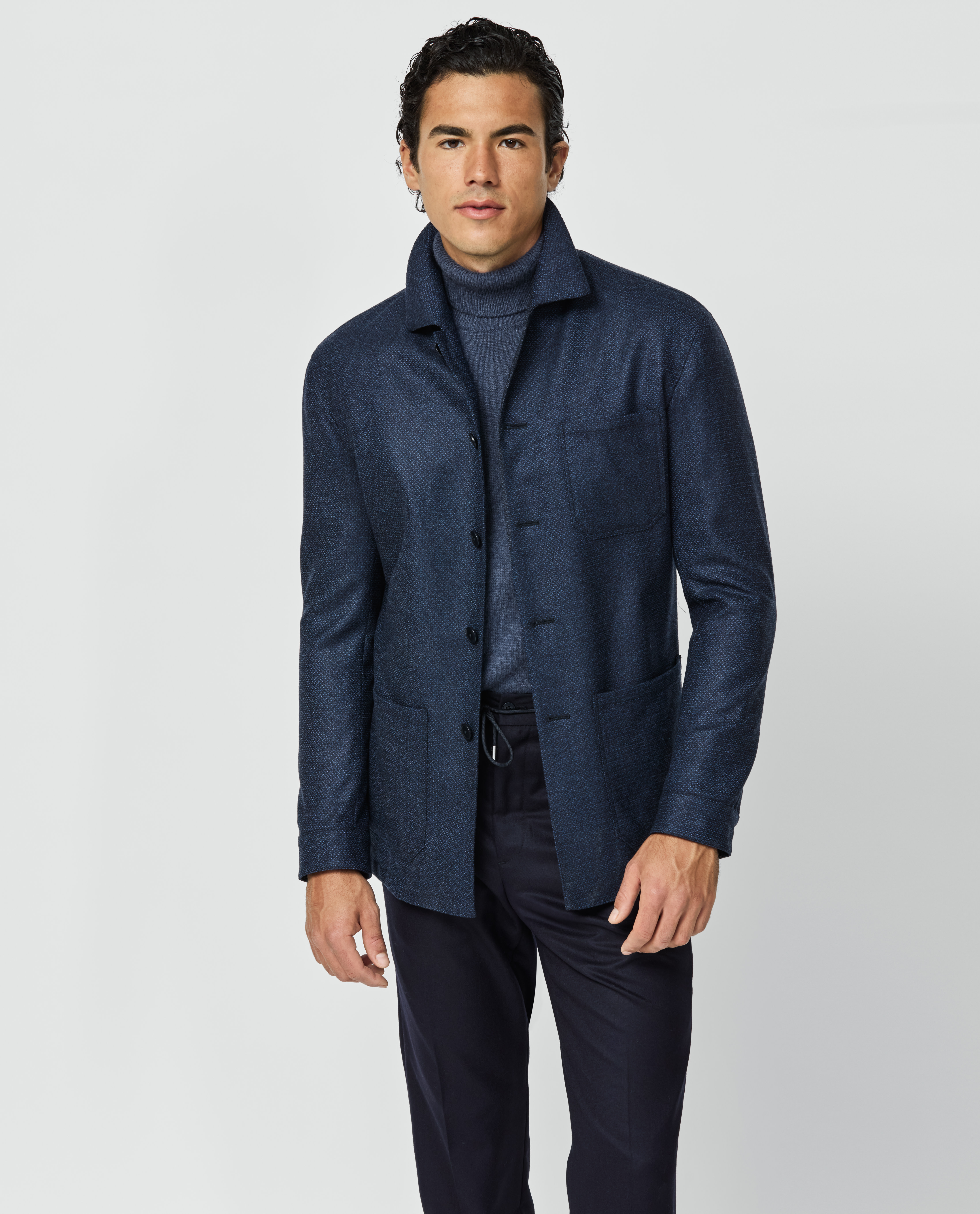This dark blue micro-dotted jacket unites performance, comfort, and elegance. Crafted from Jersely® fabric made in Italy by Loro Piana. Combining the finest pure wool and a small percentage of stretch, this blend is woven on a shuttle loom to create the elasticity of knitted jersey for a soft and breathable garment that moves with the body. Designed here as a utility jacket with patch pockets. Style it with a turtleneck, flannel trousers, and suede shoes to complete the look. Make this jacket your own with our many customization options. Wool blend Stretch Micro-dot Comfortable Breathable