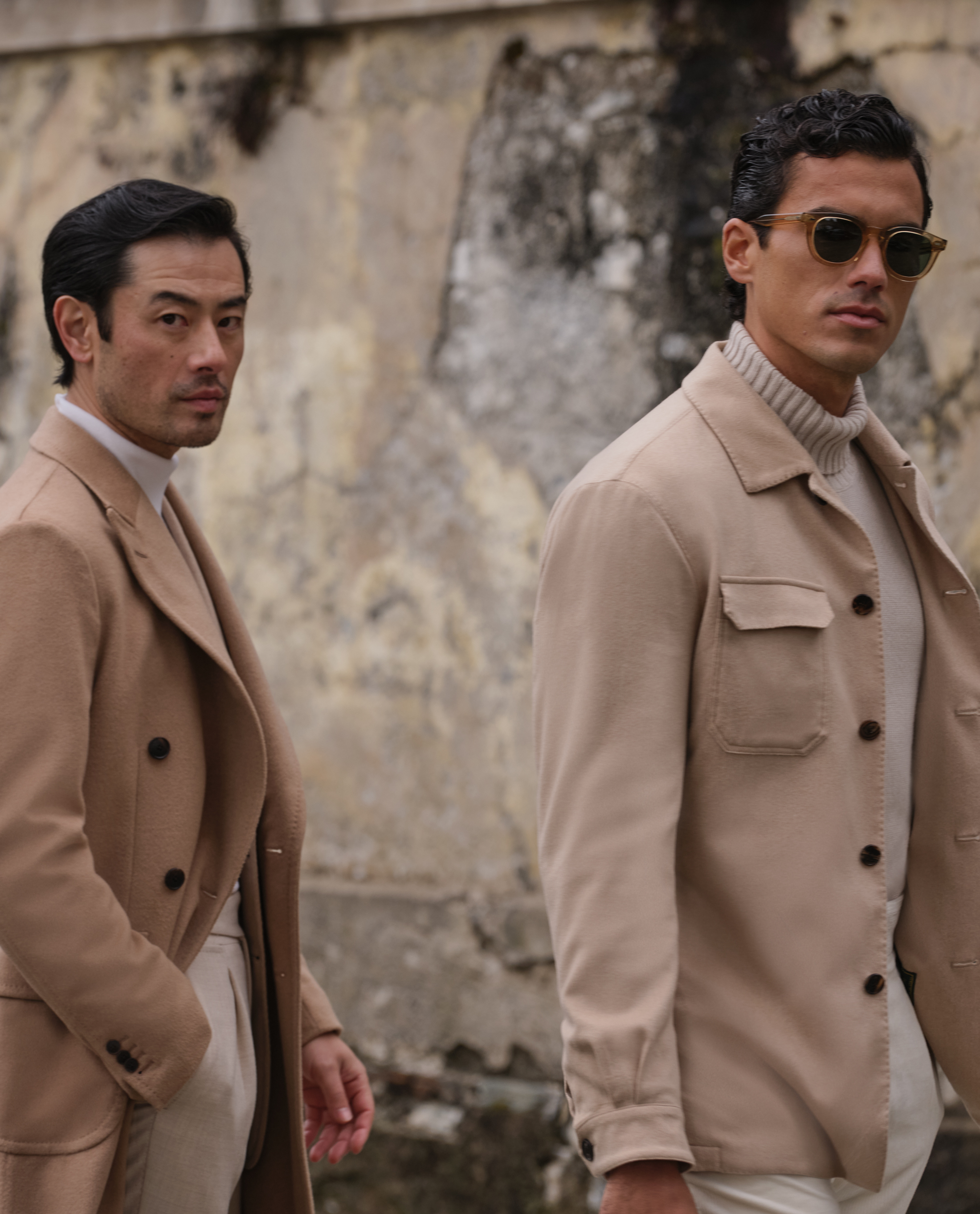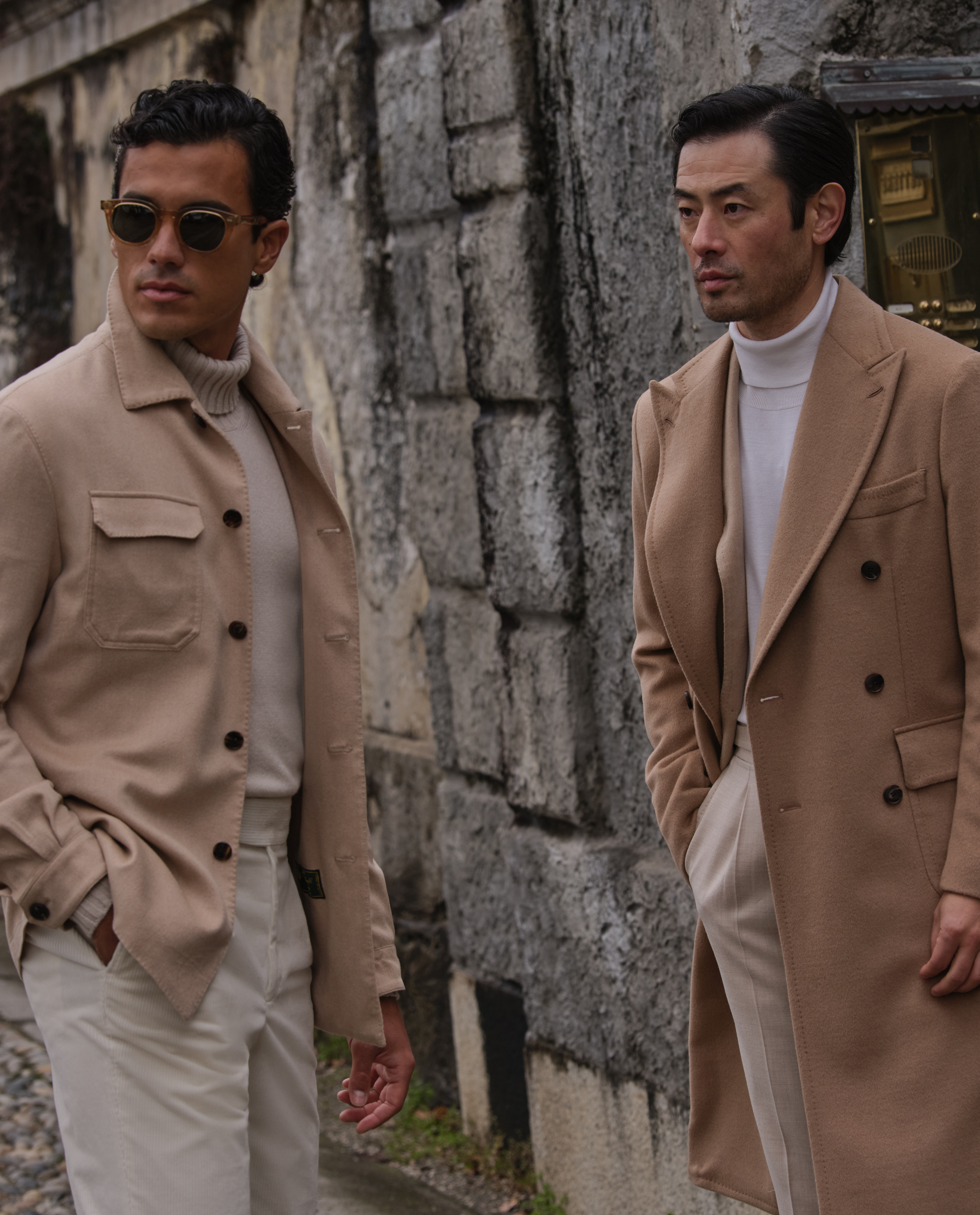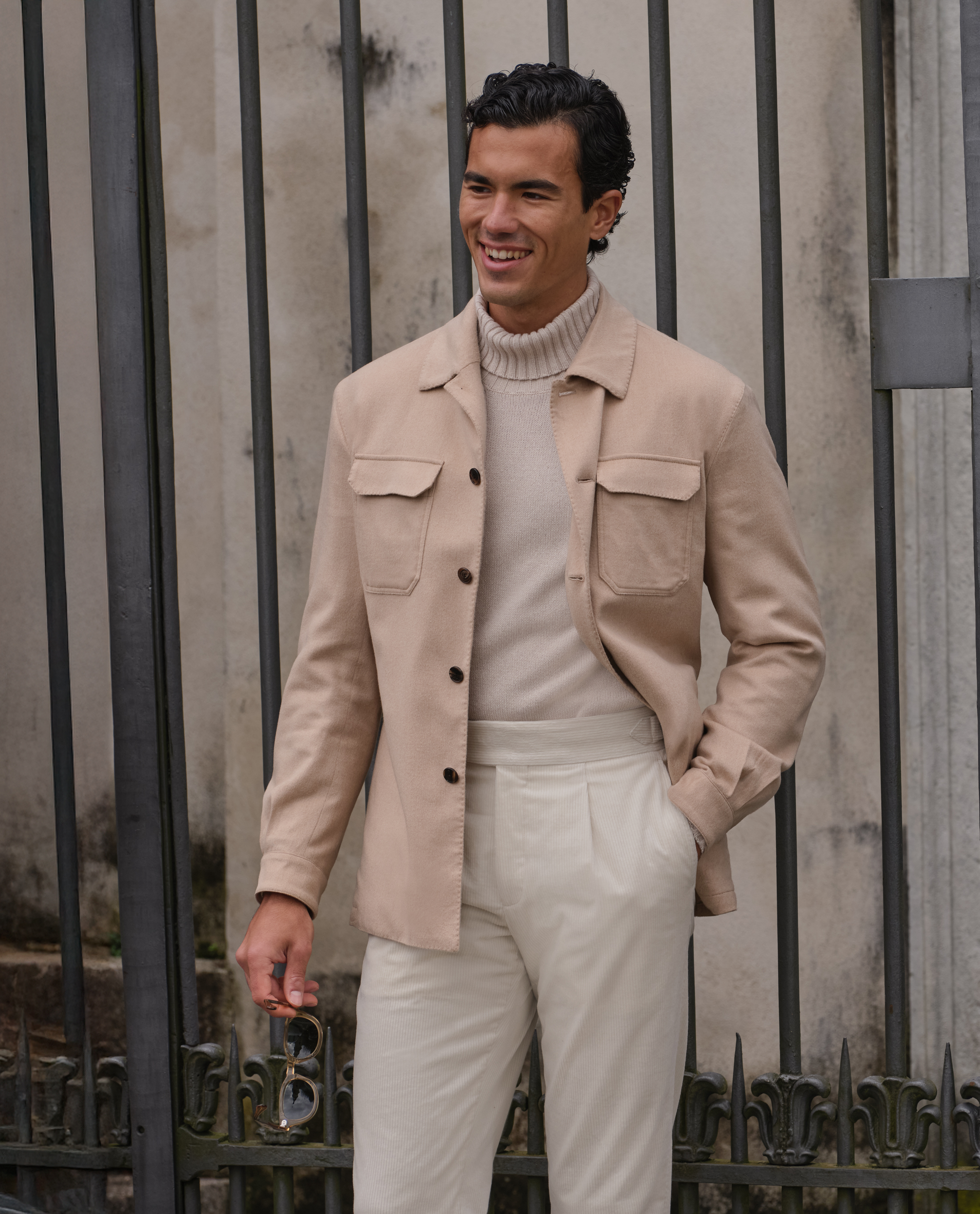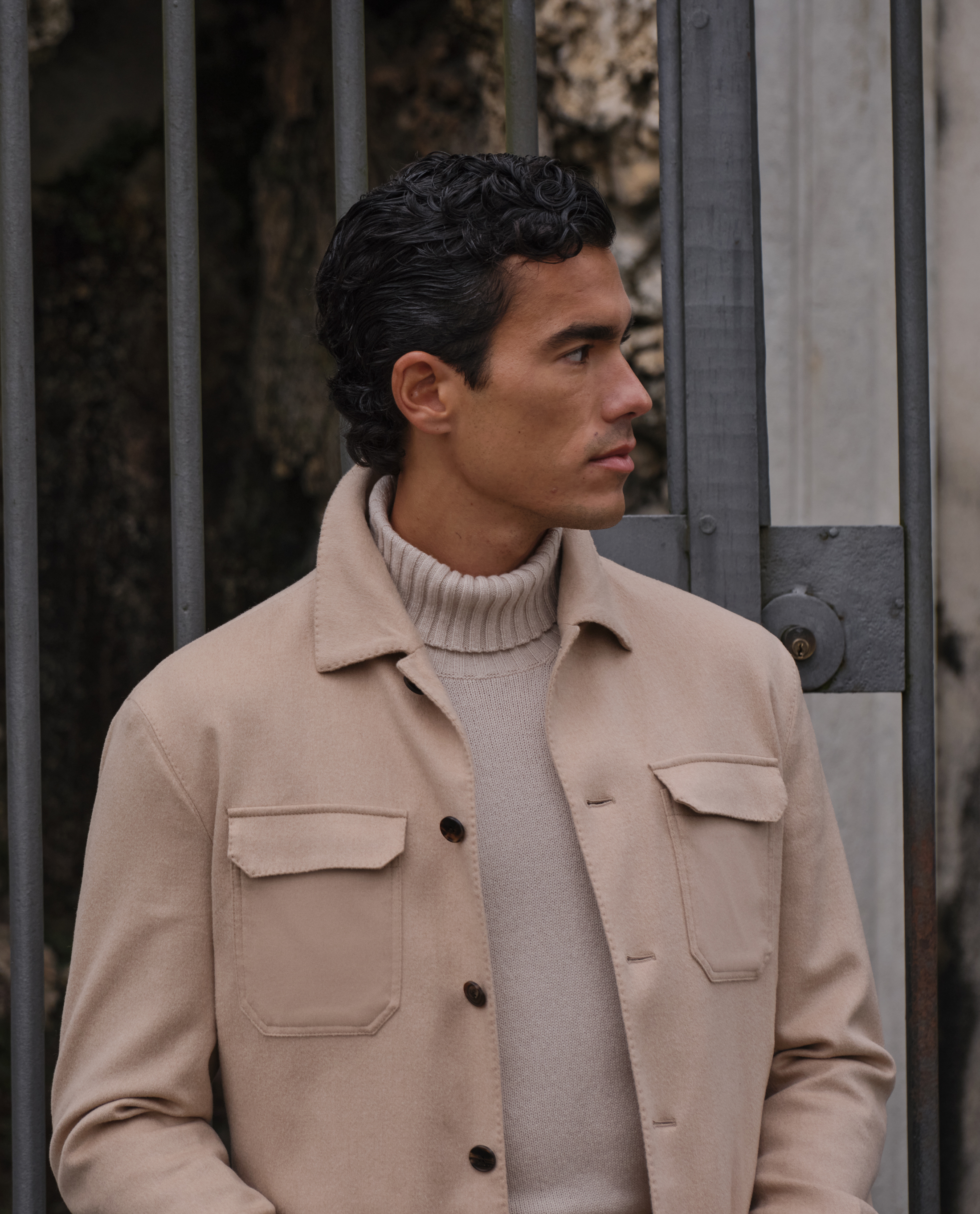 This warm sand utility jacket is crafted from the luxurious Bactrian camel fleece fabric made in Italy by Loro Piana. Sourced from the rare, noble fibers of baby camels in Mongolia, this ancestral quality is known for its exceptional softness, insulation, and natural color. Style it with a cashmere turtle neck, corduroy trousers, and suede boots to complete the look. Make this jacket your own with our many customization options to choose from.