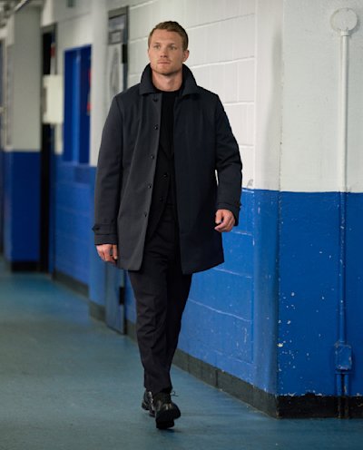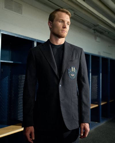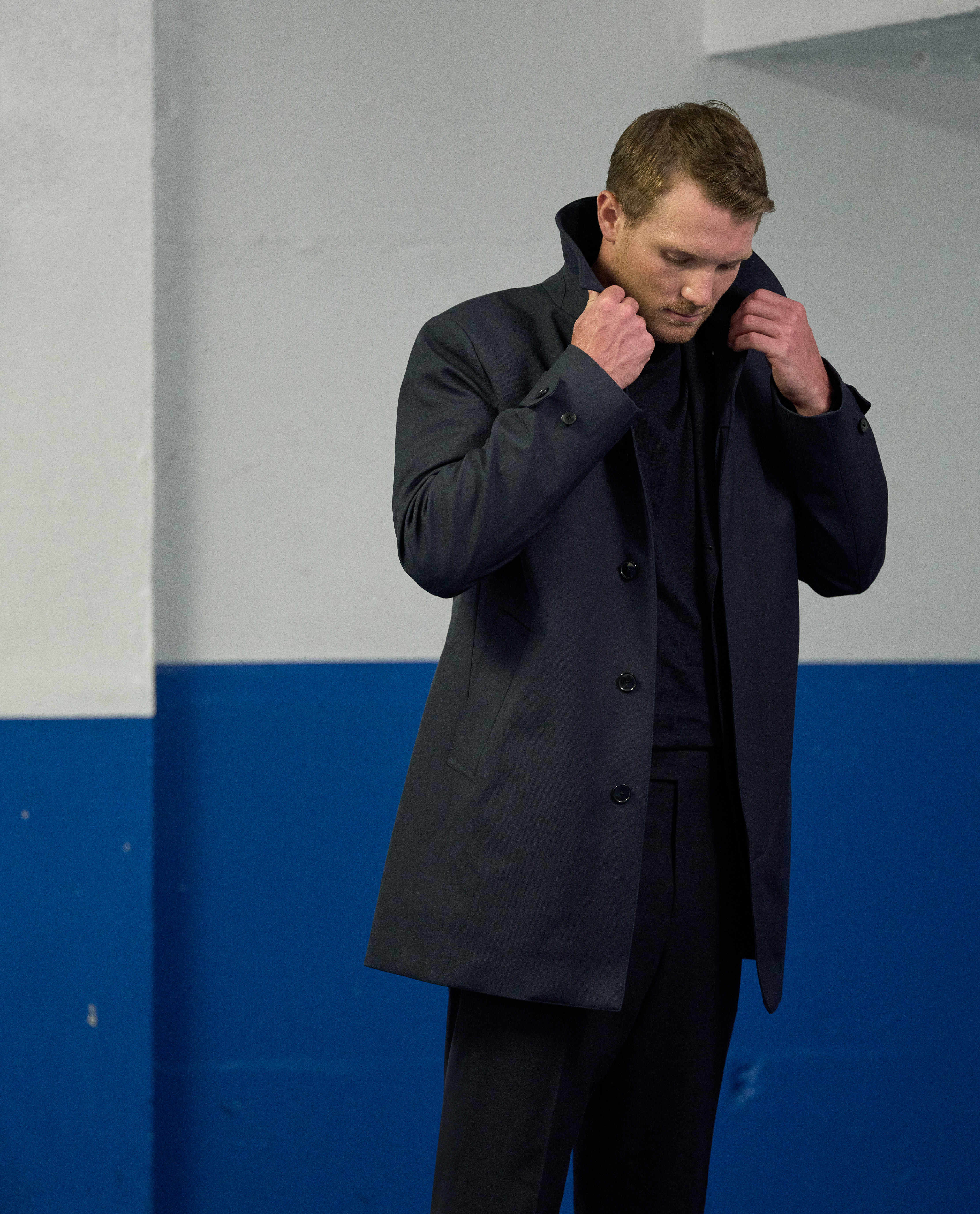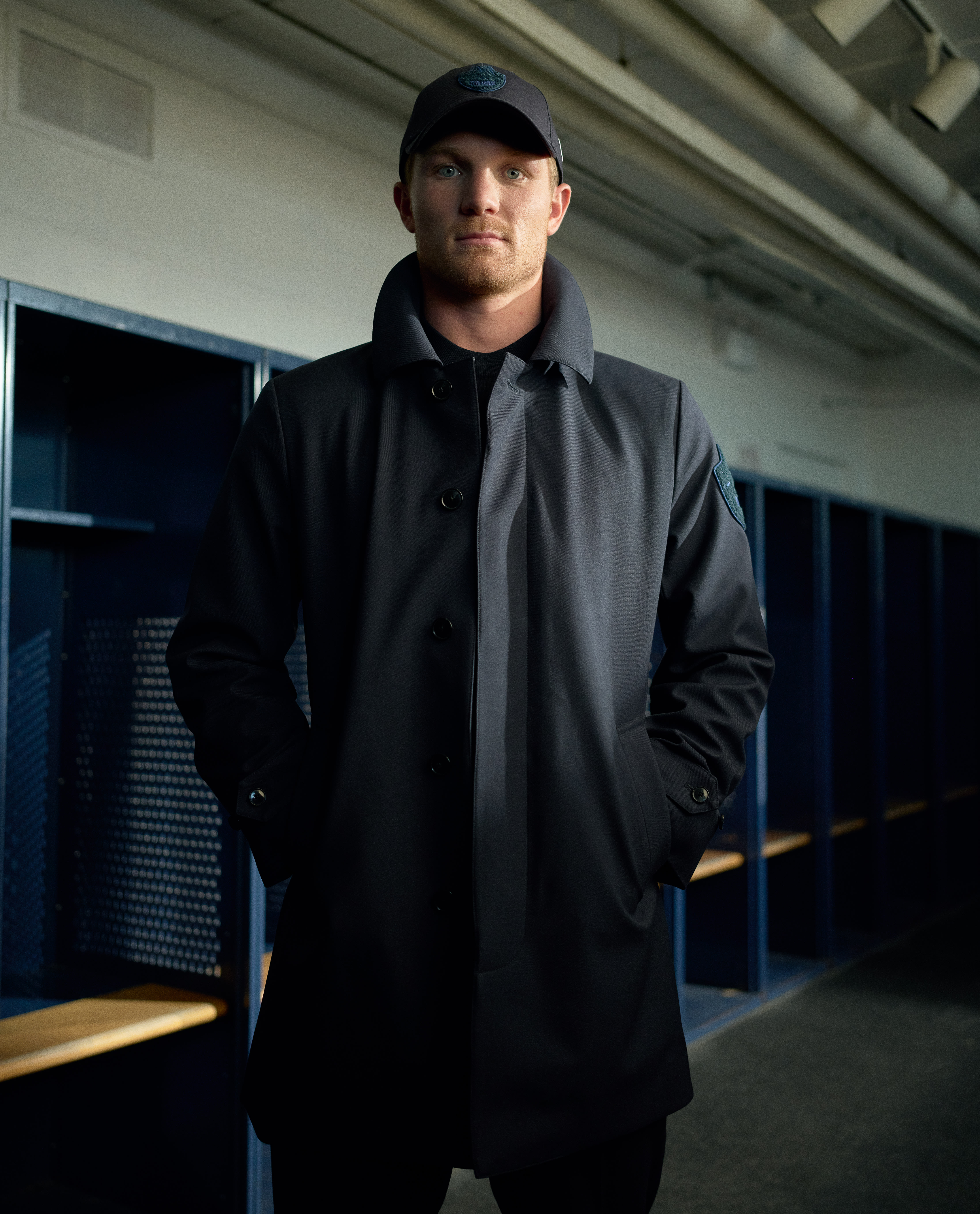 Ty Dallandrea nails the head-to-toe dark blue look with his pre-game tunnel fit, including a chic, dark blue coat with plenty of practical water repellence thanks to its refined Storm System® wool fabric made in Italy by Loro Piana. Underneath: a soft midnight blue stretch suit, wool crew neck knit, and sleek black Bluchers.