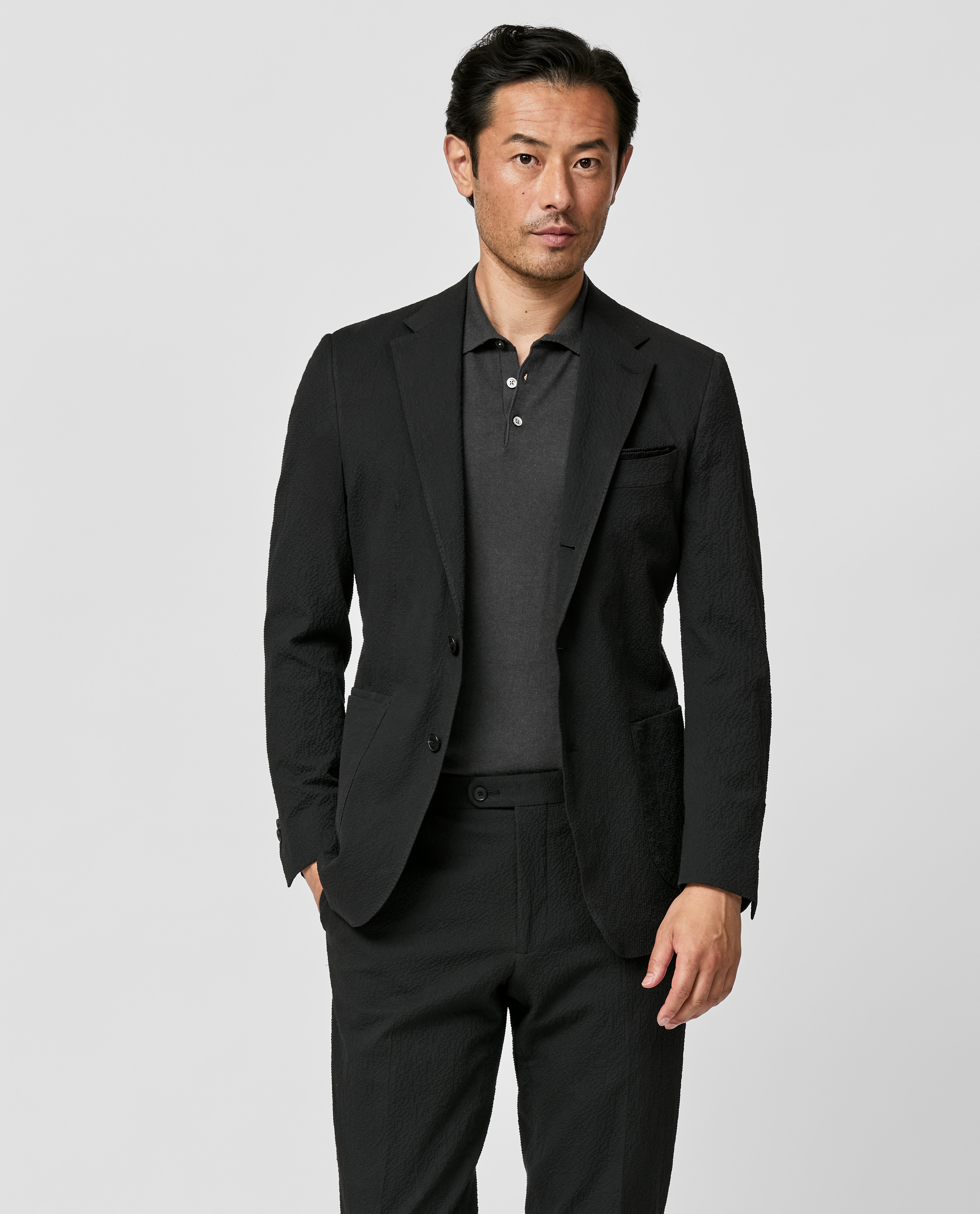 This black seersucker suit will see you thrive this summer. Woven in Italy, from a sophisticated stretch cotton blend with a puckered texture for an airy and comfortable fit. Designed here with low-gorge lapels and patch side pockets with an extra small patch pocket inside. Style it with a polo knit and suede loafers to complete the look. Make this suit your own with our many customization options to choose from. Stretch cotton Seersucker Puckered texture Comfortable
