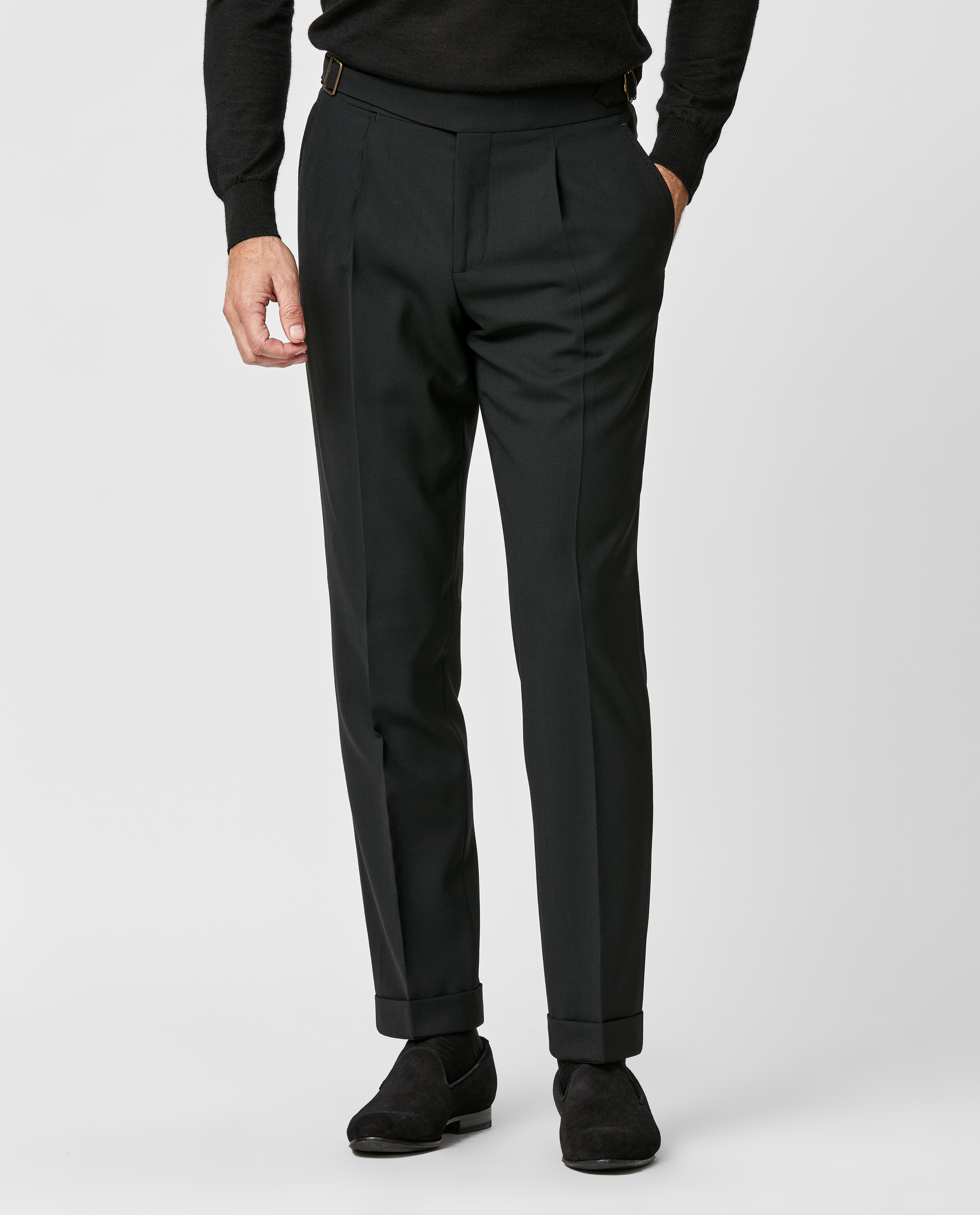 Lightweight and classic black, these light fresco trousers can be worn all year round. Crafted from pure wool with natural stretch, constructed in a breathable open weave for a comfortable pair of pants that won't easily wrinkle. Designed here with a high-waistband, single pleats, and a turn-up. Make these trousers your own with our many customization options to choose from. 100% wool Natural stretch Breathable Lightweight Crease resistant