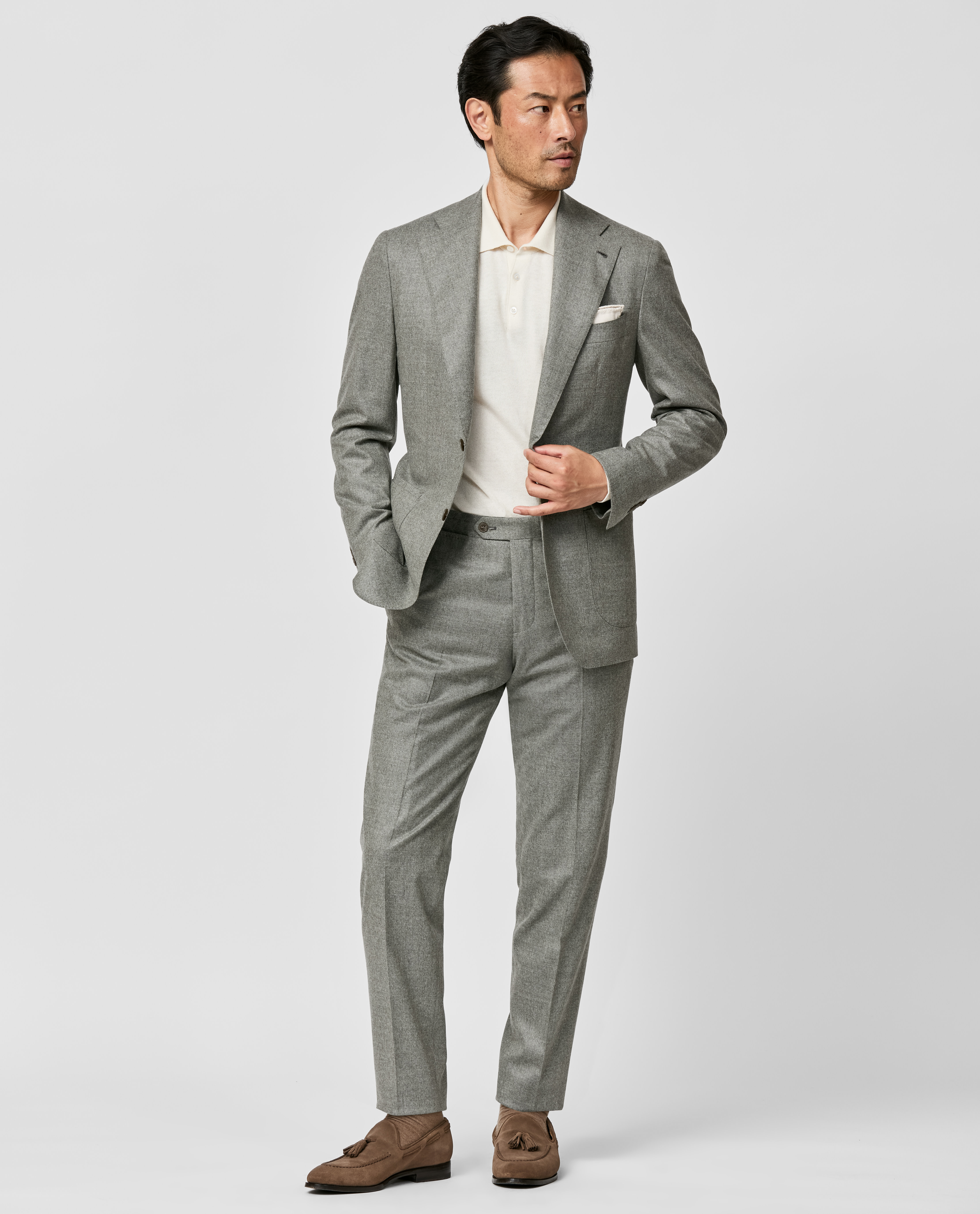 This heathered gray suit features a classic and comfortable flannel. Naturally stretchy and breathable, the S120 wool is woven with double-twisted yarns. Designed here as a 1-button jacket with wide notch lapels and patch side pockets. Style it with a polo knit and suede shoes to complete the look. Make this suit your own with our many customization options to choose from. S120 merino wool Flannel Double-twisted yarns Natural stretch Breathable