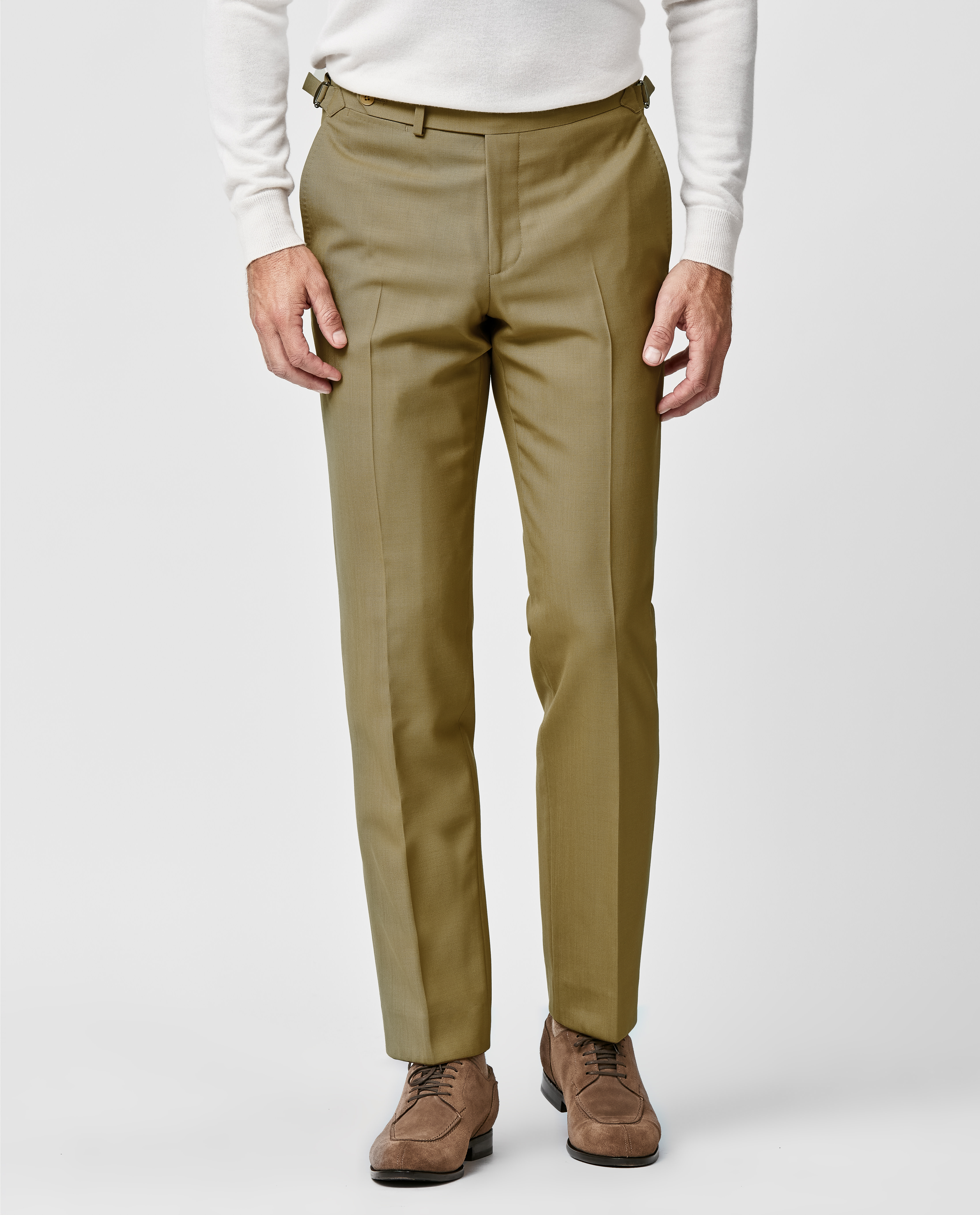 Lightweight and classic khaki, these light fresco trousers can be worn all year round. Crafted from pure wool with natural stretch, constructed in a breathable open weave for a comfortable pair of pants that won't easily wrinkle. Designed here with an extended waistband. Make these trousers your own with our many customization options to choose from. 100% wool Natural stretch Breathable Lightweight Crease resistant
