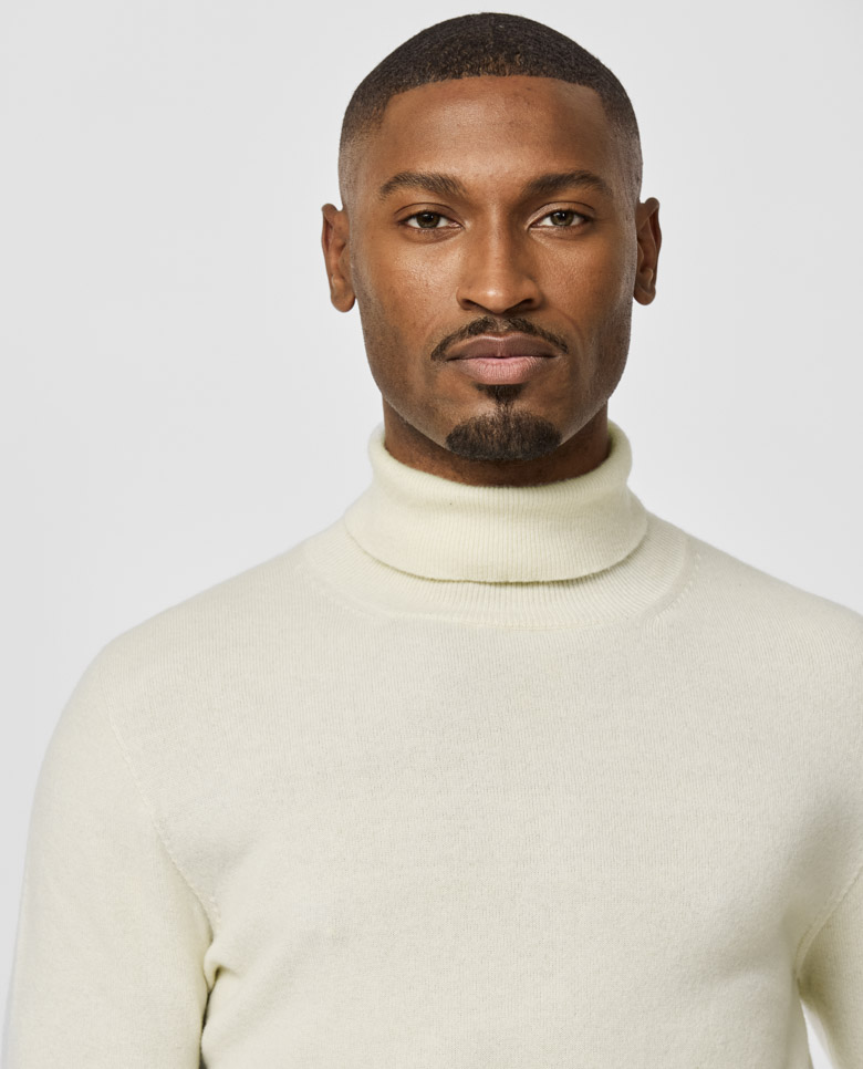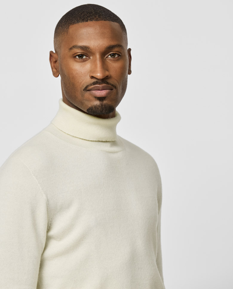 A luxurious off-white knit with an elevated seamless look. Made from pure cashmere for a soft feel with superior warmth. Designed here as a turtleneck, in single yarns for a lighter wear. Make this knitwear your own with our many customization options to choose from. 100% cashmere Lightweight warmth Breathable Soft feel