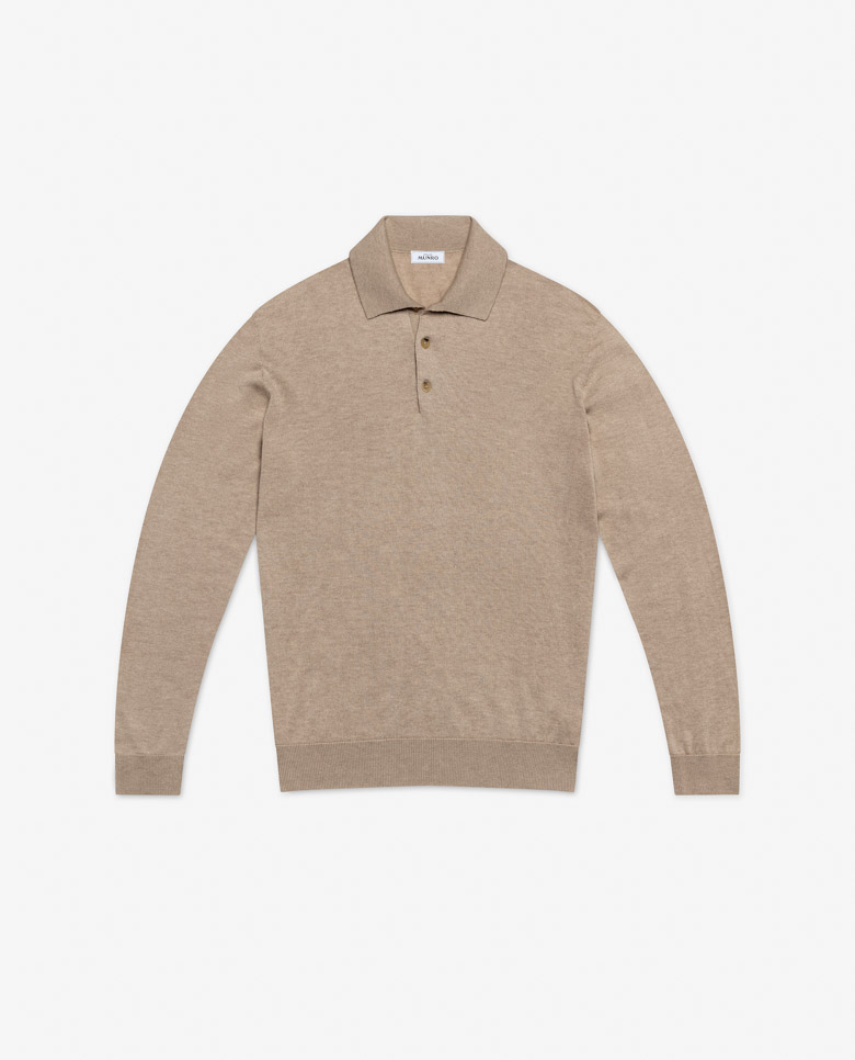 This sand-colored knit is summer friendly with a seamless finish. Crafted from a blend of breathable Turkish cotton and soft Inner Mongolian cashmere. Designed here as a polo, in single yarn for a lightweight look. Make this knitwear your own with our many customization options to choose from.