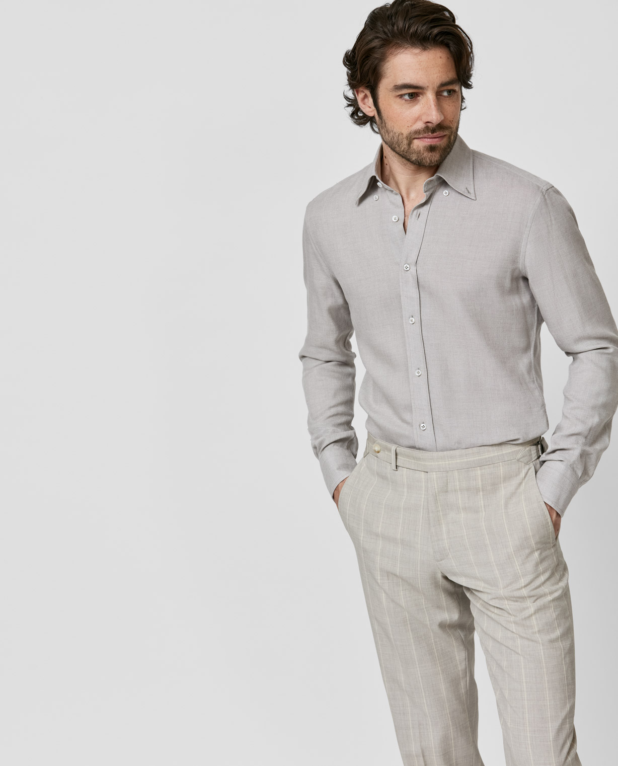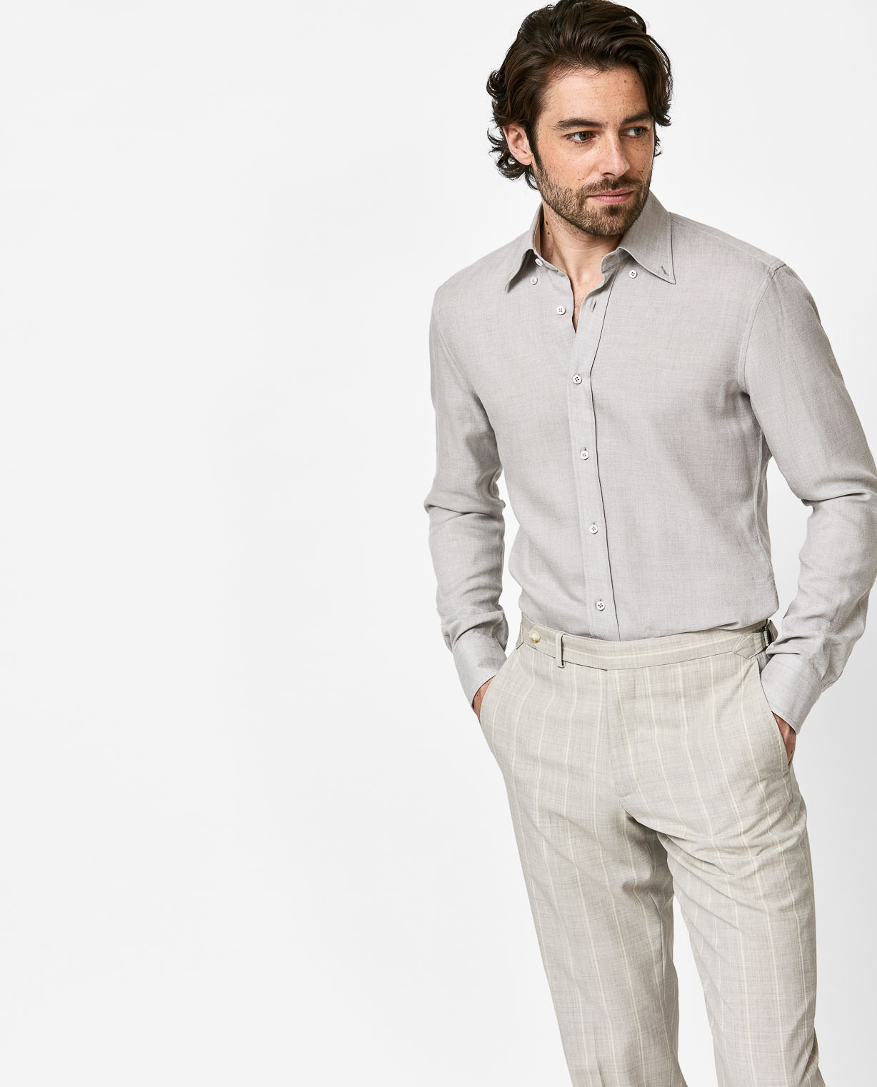 Relaxed summer days are complete with this multi-functional mouliné shirt in sand. The unique blend combines the softness and elegant drape of modal with the thermoregulation and moisture management of merino wool. Together the fabric possesses a natural stretch for enhanced crease resistance and comfort too. Designed here with a button-down collar. Make this shirt your own with our many customization options to choose from. Modal & merino wool Natural stretch Elegant drape Breathable Crease resistant