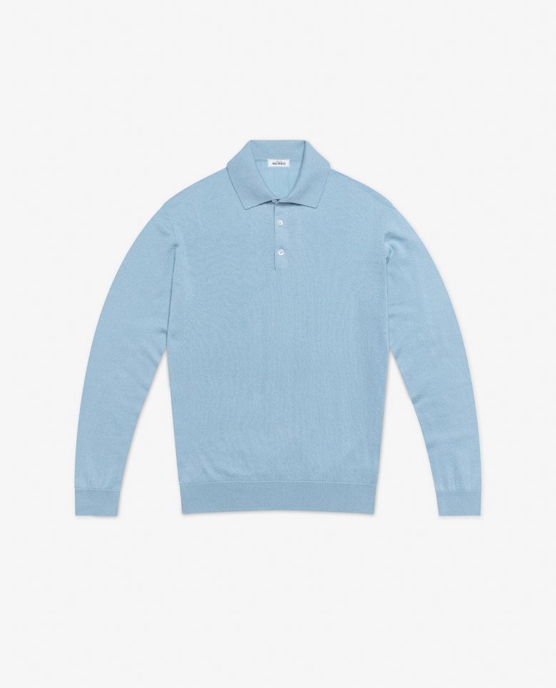 This sky blue knit is summer friendly with a seamless finish. Crafted from a blend of breathable Turkish cotton and soft Inner Mongolian cashmere. Designed here as a classic polo, in single yarn for a lightweight look. Make this knitwear your own with our many customization options to choose from. Cotton & cashmere Breathable Soft feel