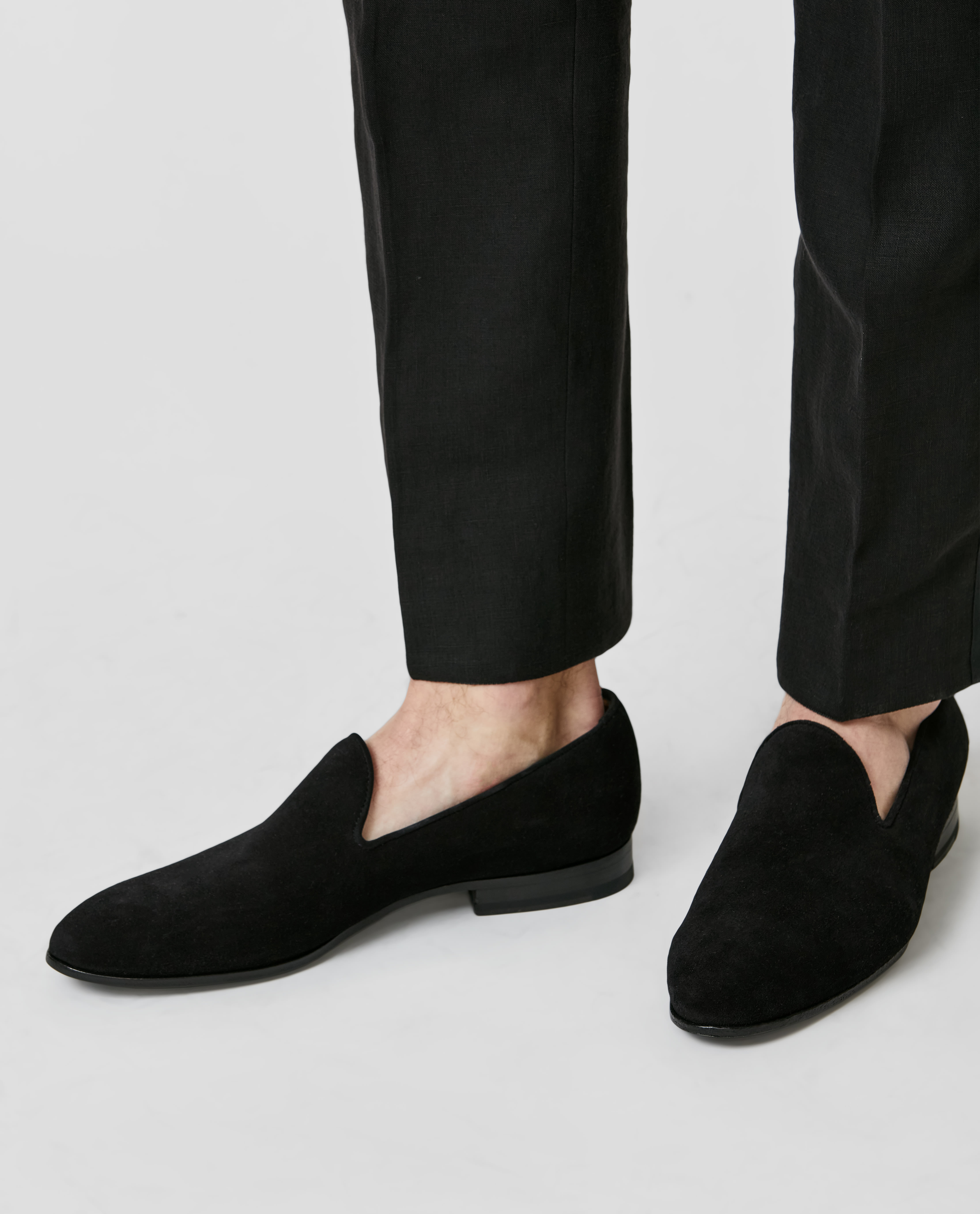 Add a touch of casual luxury to your look with these black loafers. The soft suede calfskin leather is chrome tanned and features a water-resistant finish to withstand the wetter months. Designed here as a plain toe loafer with a rubber sole. Make these shoes your own with our many customization options to choose from. Handmade Suede calfskin leather Chrome tanned Flexible Water-resistant finish