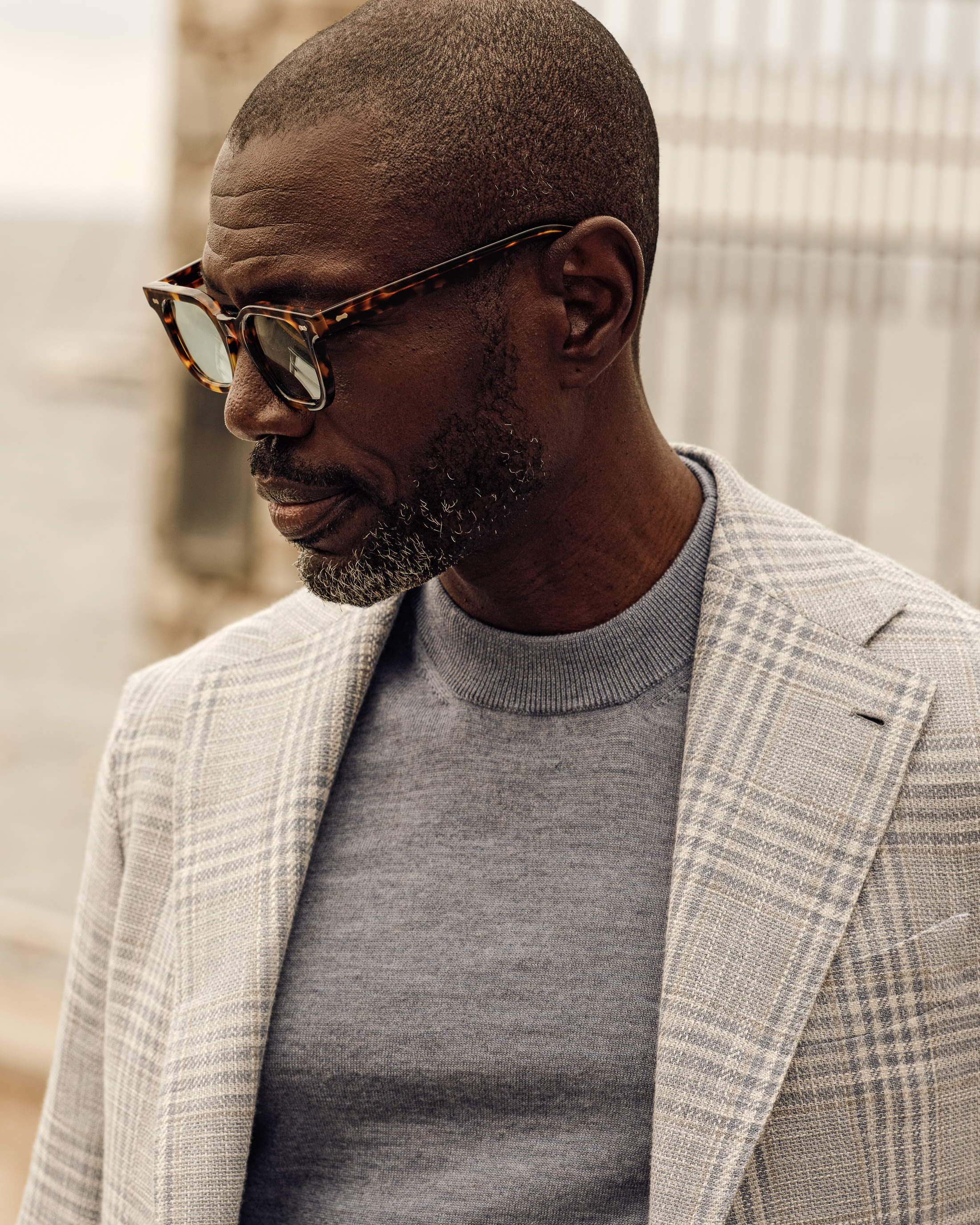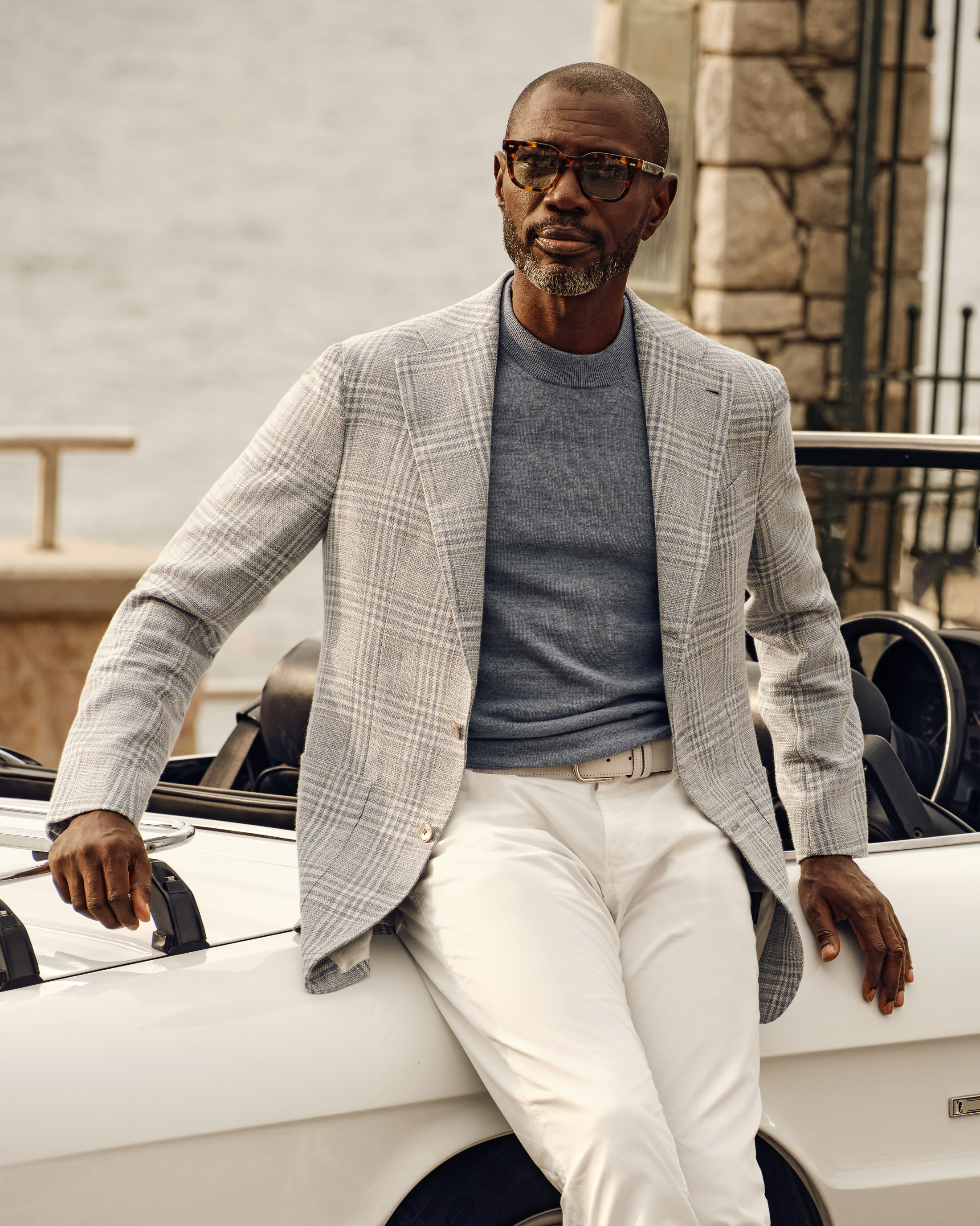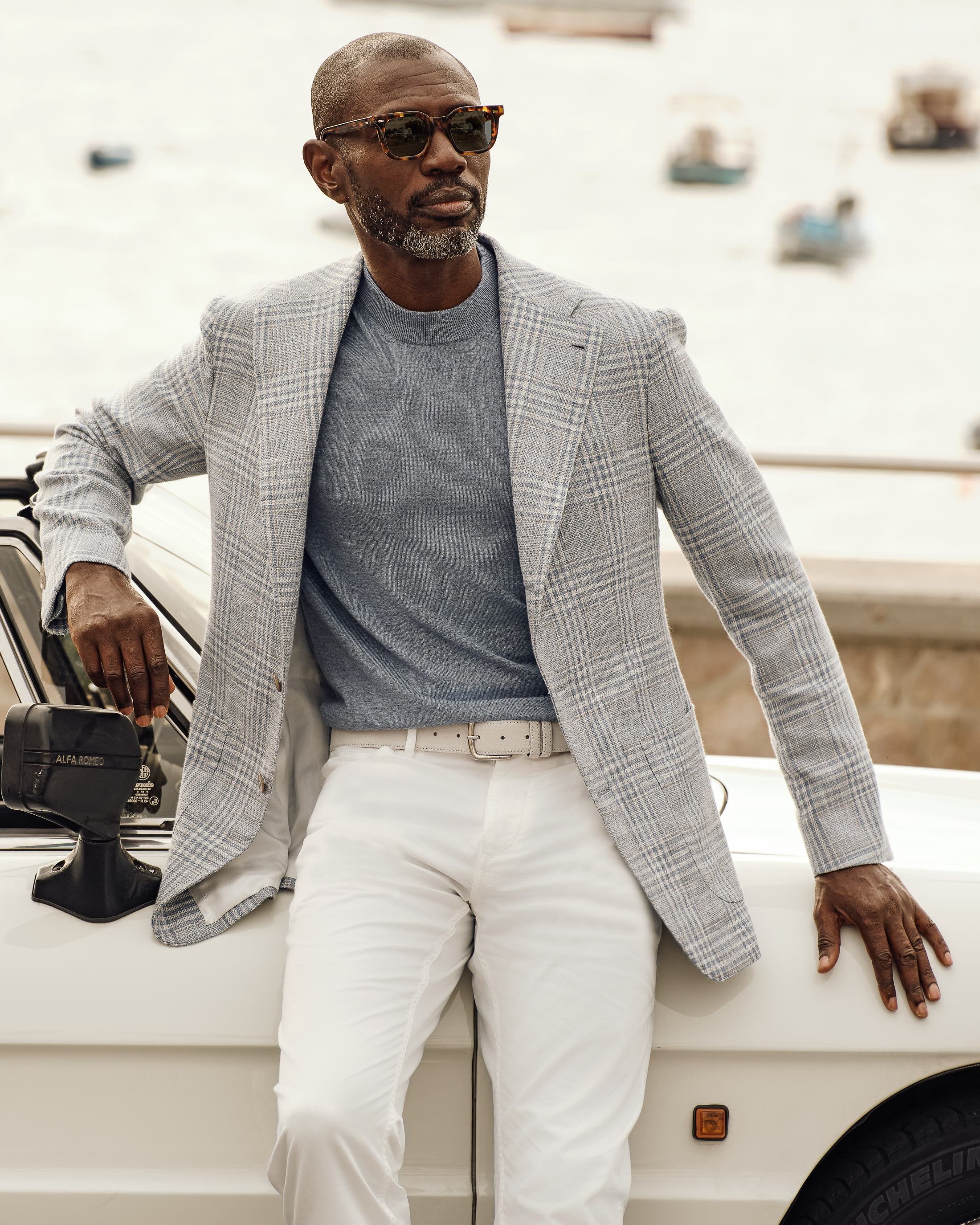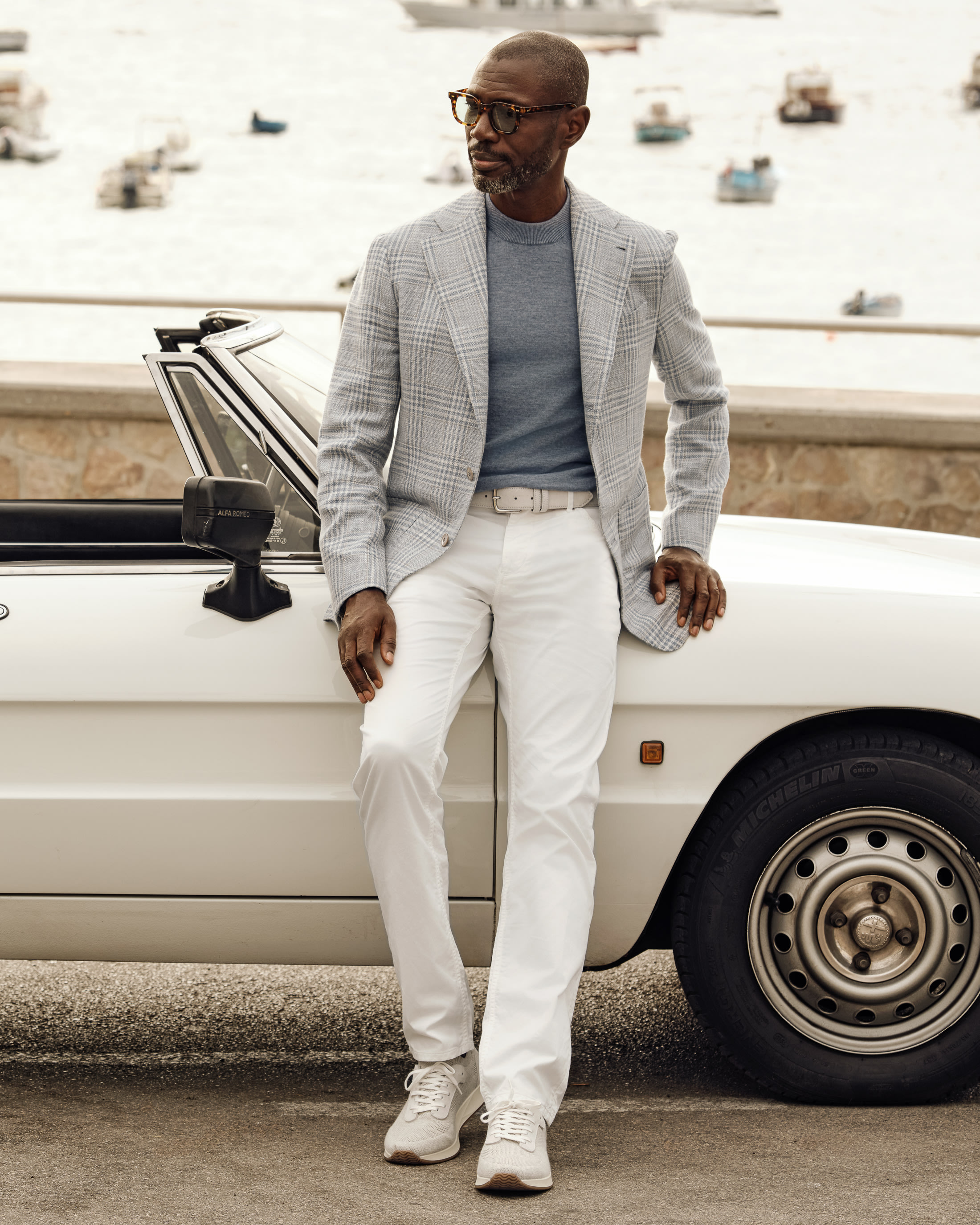 A study in versatility. Few pieces work harder than this plaid sports jacket in sky blue. The ultimate all-rounder, you can dress it up or down as you please with ease. For the weekend, pair the sharp tailoring with softer staples like a dusty blue knit, stretch 5-pockets, and a pair of knit runners.