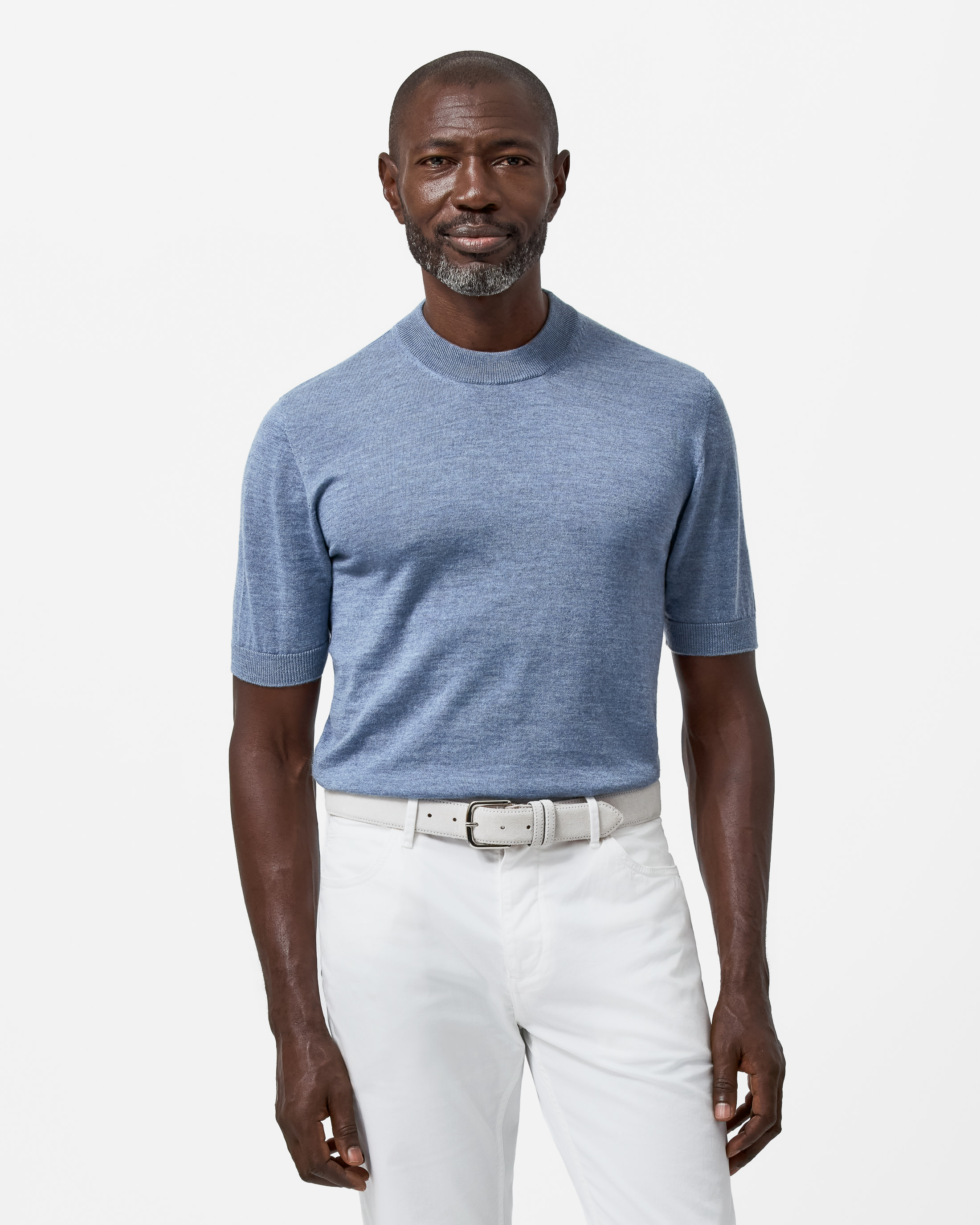 This light blue mélange knit adds timeless refinement and comfort to your year-round wardrobe. Crafted from extra-fine merino wool made by Zegna Baruffa Lane Borgosesia in Northern Italy, it’s as soft as cashmere and ideal for daily wear. Naturally resistant to stains, odors, and grease, it requires minimal maintenance. Designed here as a short-sleeved crew neck, in single-ply yarn for lightweight layering.