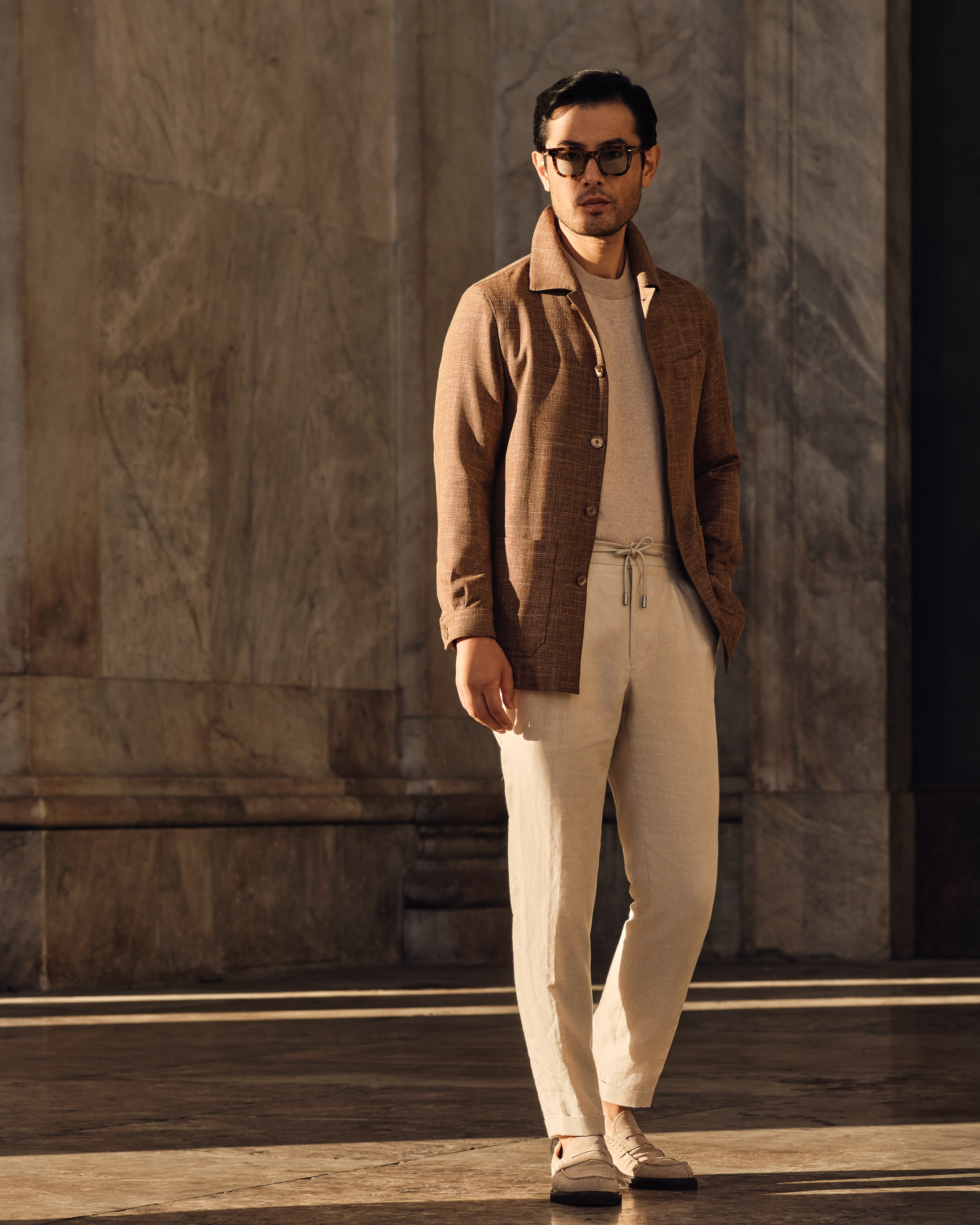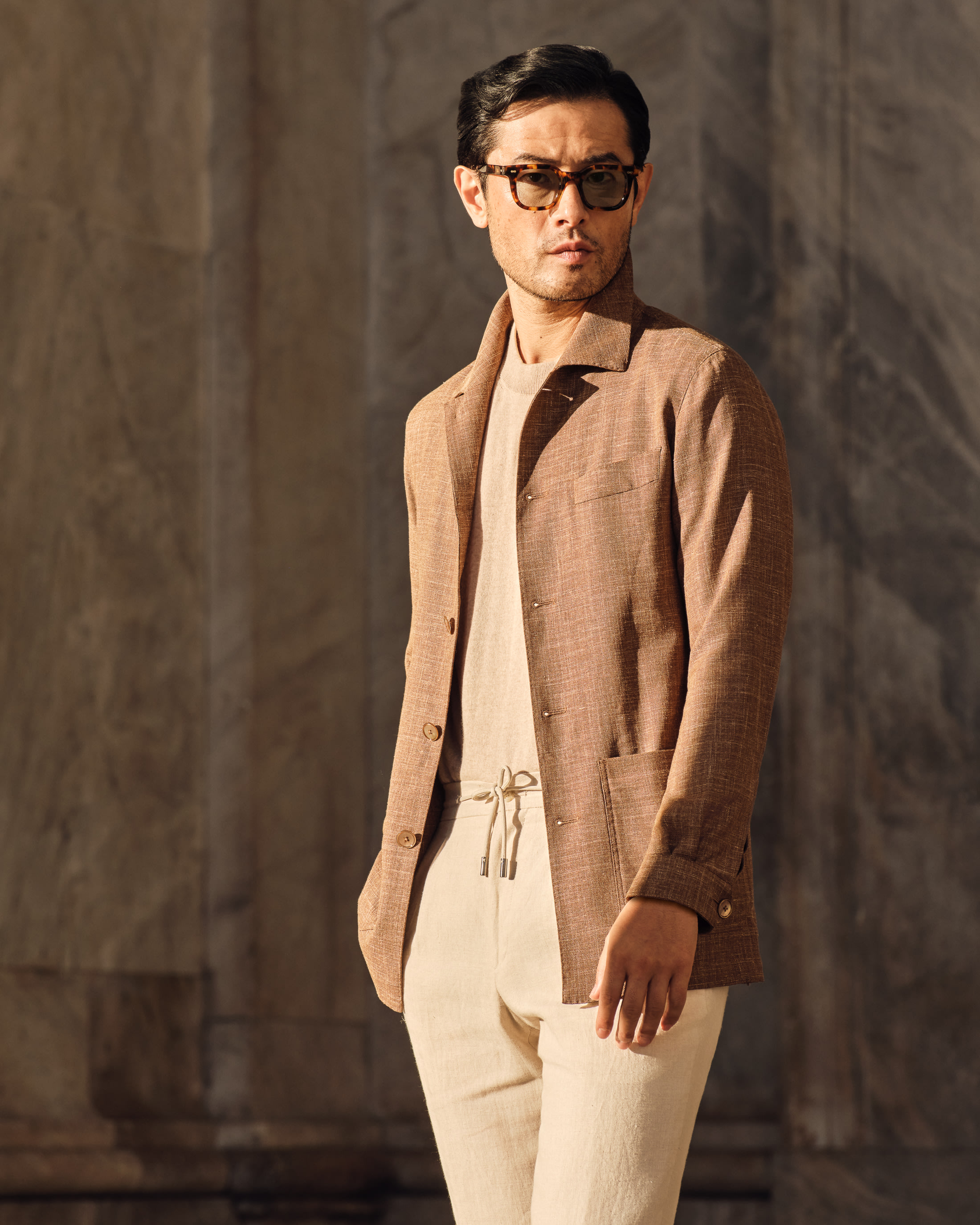 Curated for sun-drenched days that call for effortless sophistication. This utility jacket features one of our favourite fabrics this season made in Italy by Loro Piana. Layered with natural hues and heat-beating materials for an extra summery effect.