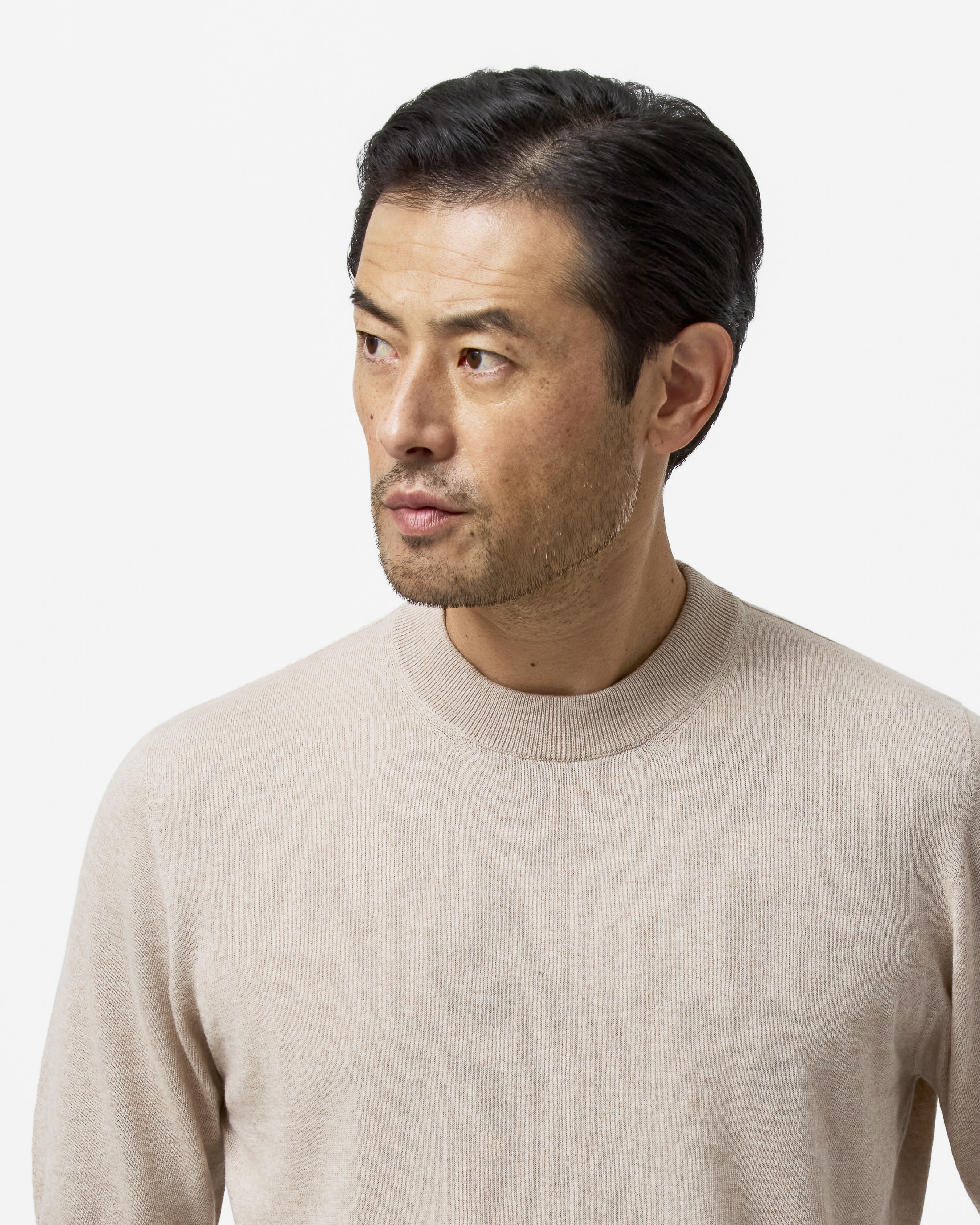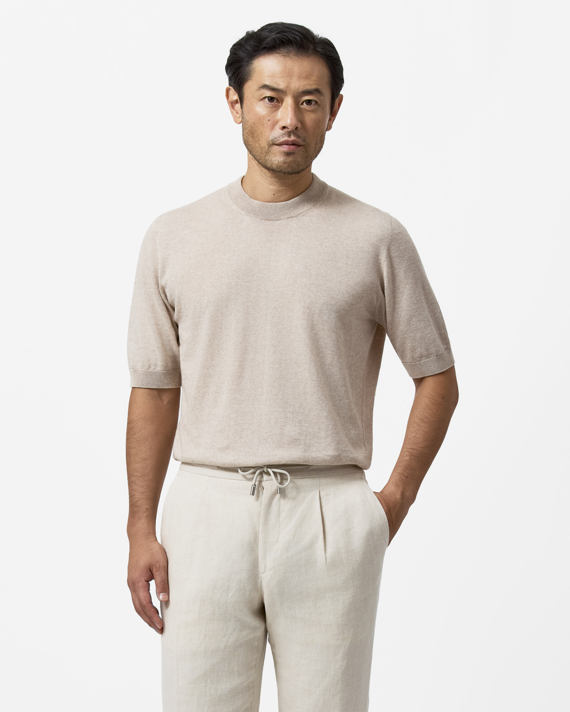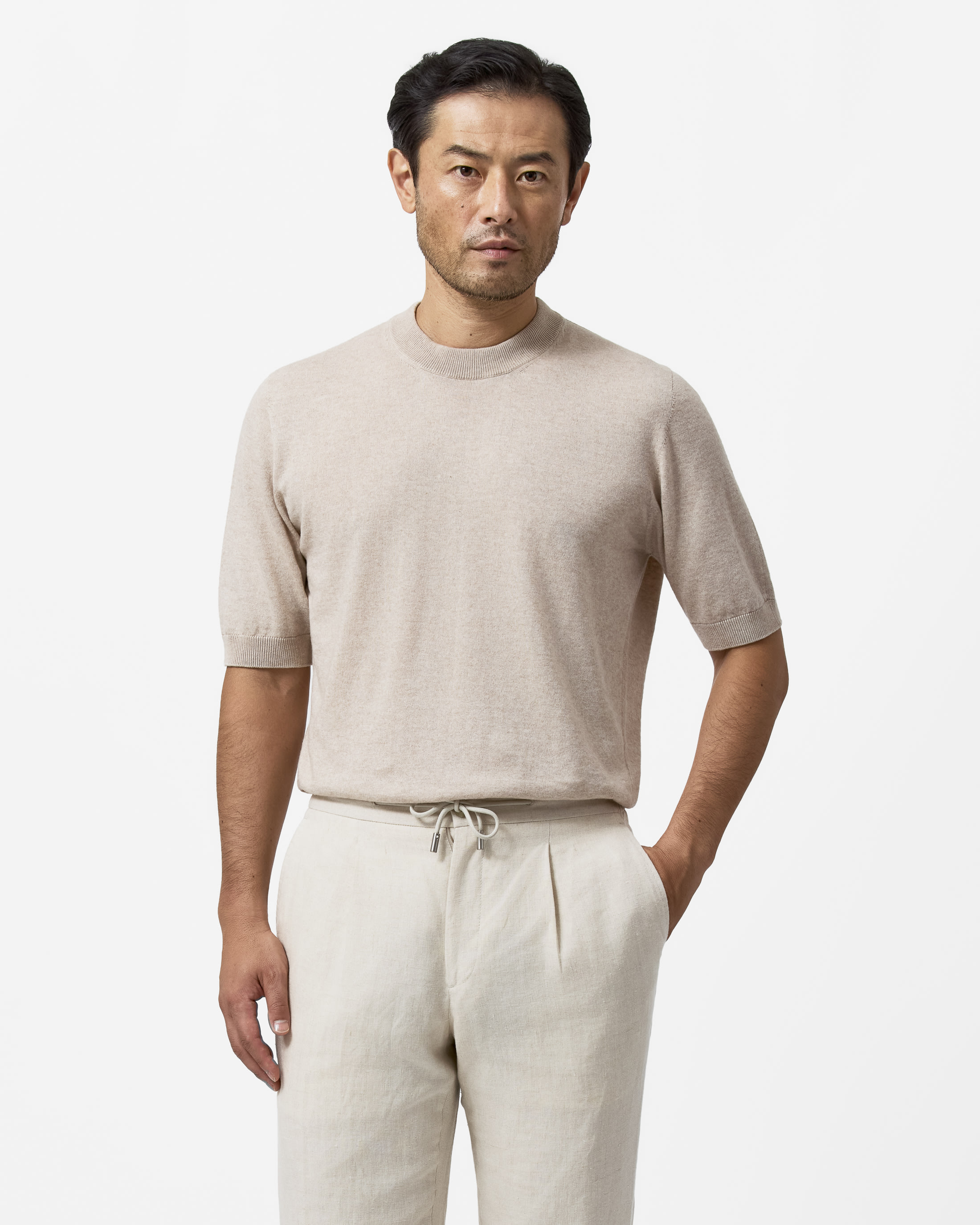 This sand-colored knit is summer friendly with a seamless finish. Crafted from a blend of breathable Turkish cotton and soft Inner Mongolian cashmere. Designed here as a short-sleeved crew neck, in single-ply yarn for a lightweight look.