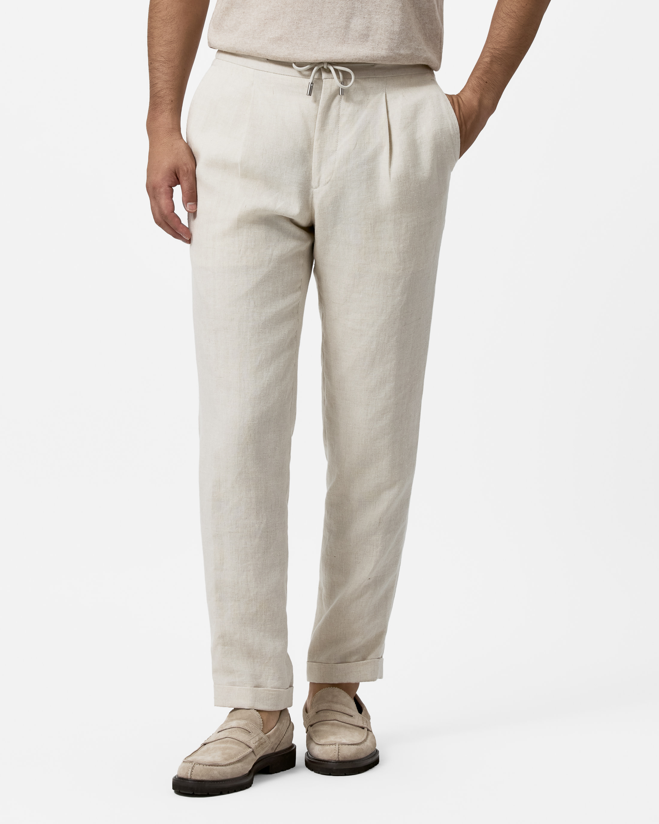 Elevate your casual summer style with these sand linen trousers. Crafted from robust and hollow fibers, allowing for excellent regulation of body temperature and moisture absorption with durability. Designed here as drawstring trousers with a single-pleated front and slanted side pockets.