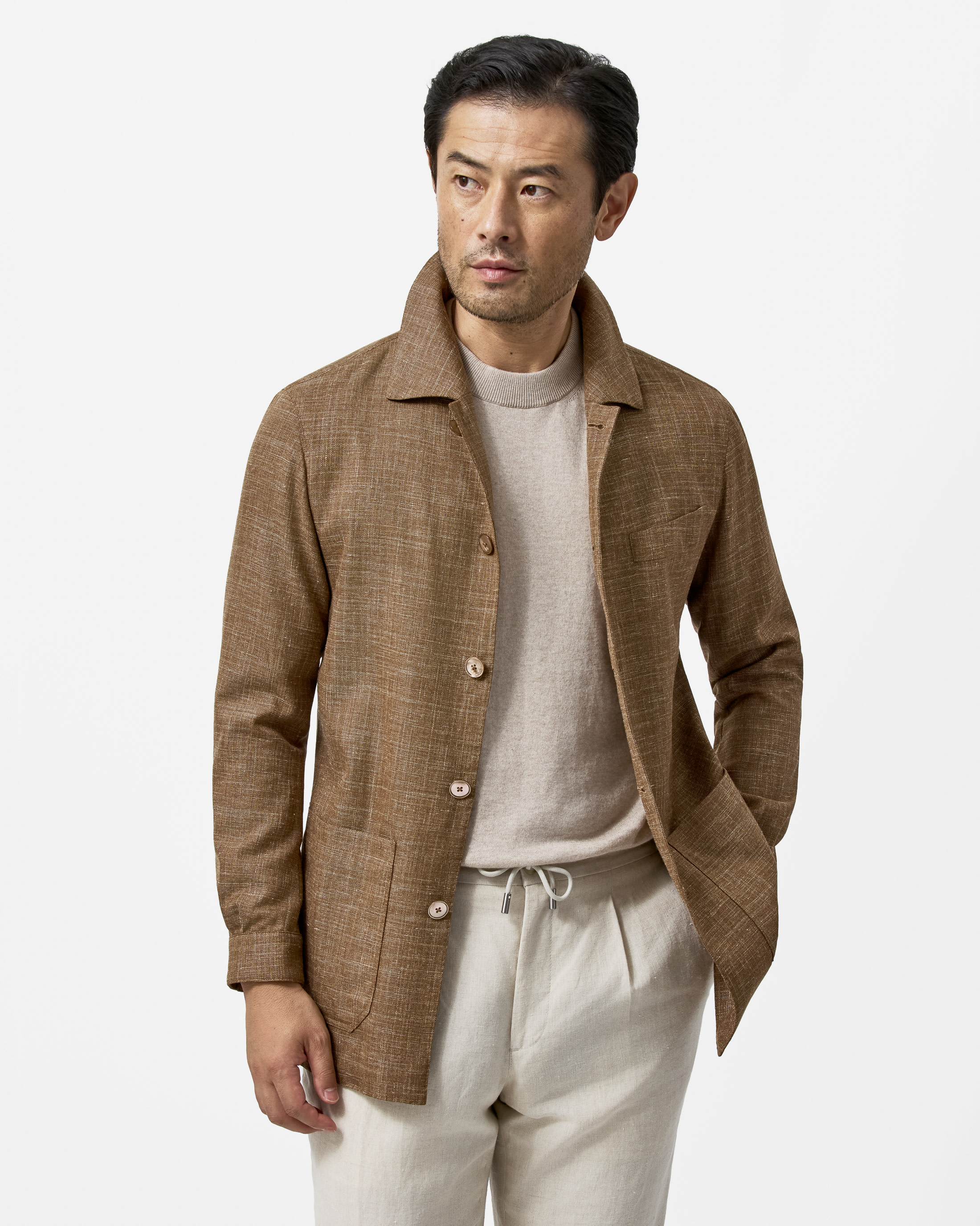 This camel lightweight jacket blends a colorful basketweave with mélange effect for contemporary comfort and coolness in one. The garment is crafted from Jersely® fabric made in Italy by Loro Piana. The summer blend of wool, silk, linen, and a touch of stretch offers exceptional breathability with a ‘knit-like’ jersey look that moves with the body. Designed here as a 5-button jacket with utility patch side pockets and pleated cuffs. Style it with a sand knit, linen drawstring trousers, and suede loafers to complete the look.