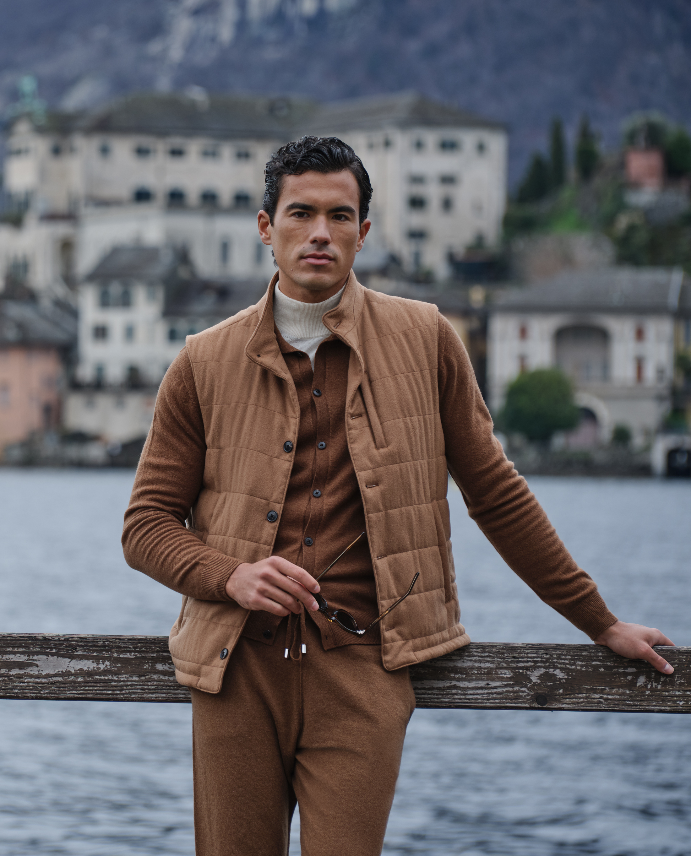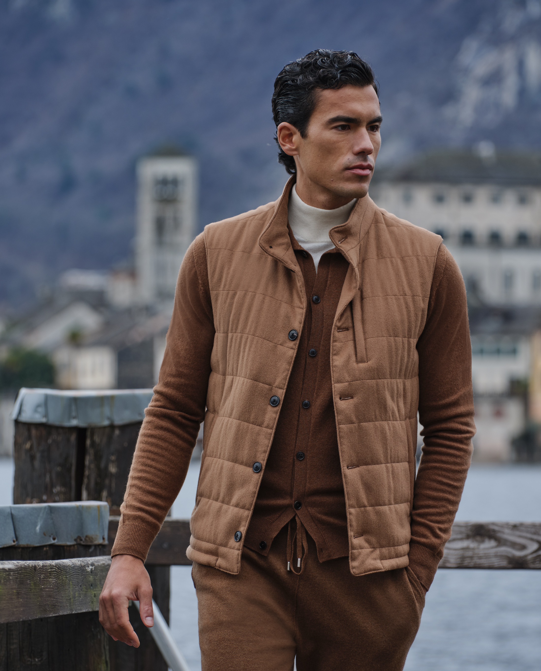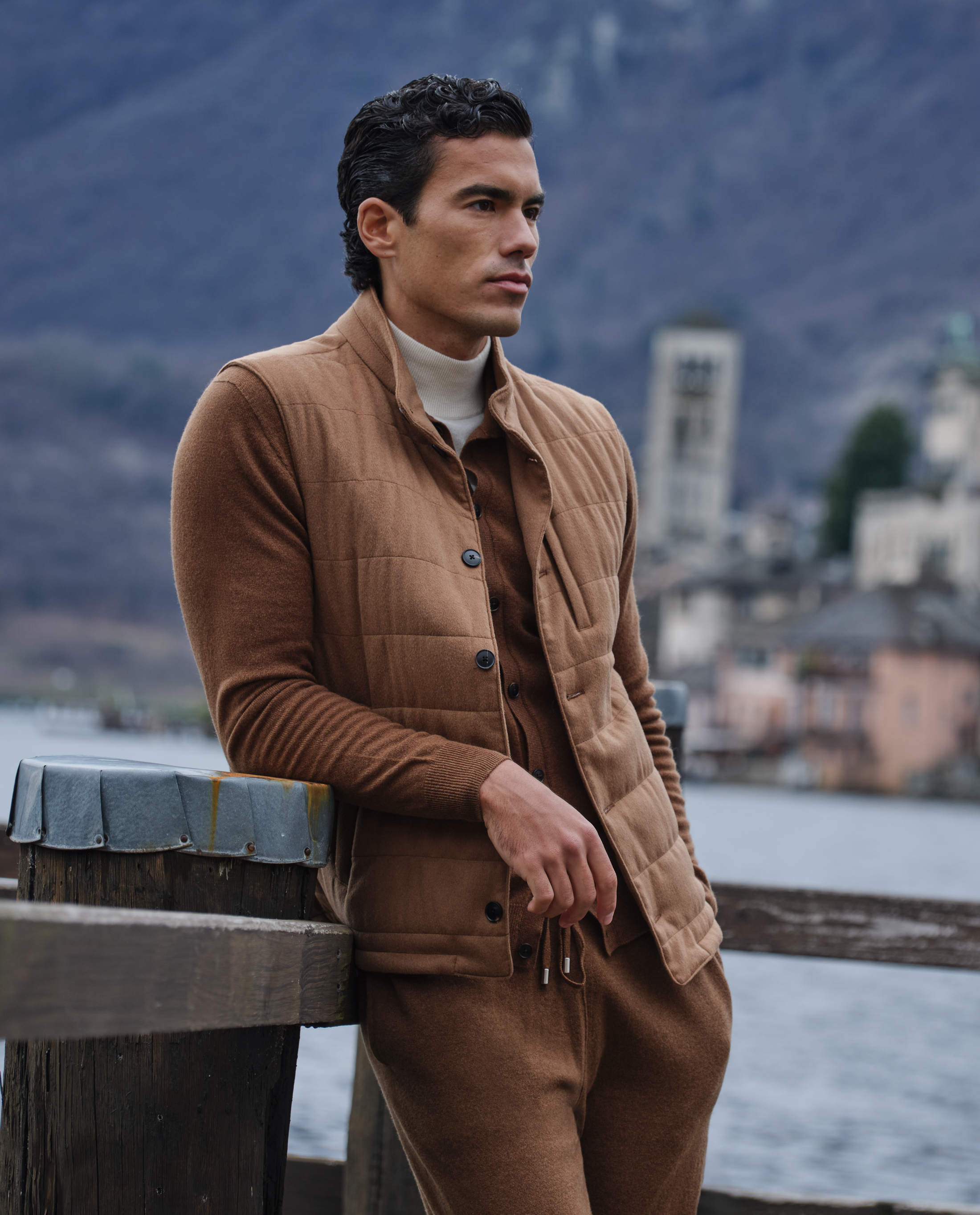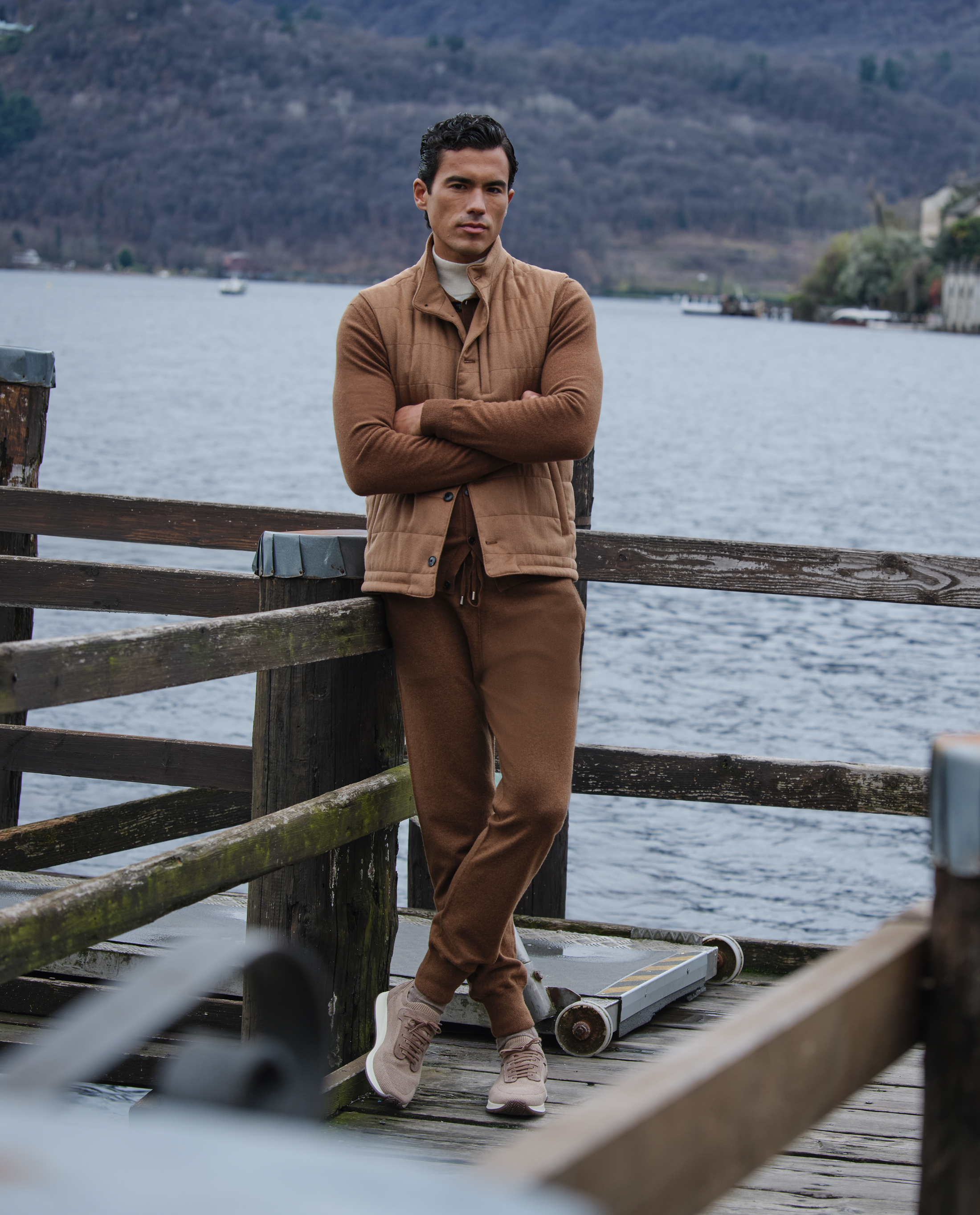 Wrap yourself in layers of luxurious cashmere, ideal weekend escapes. Pair this sophisticated brown cashmere leisure look with an off-white mock neck, a brushed camel vest, and stylish runners for relaxed elegance.