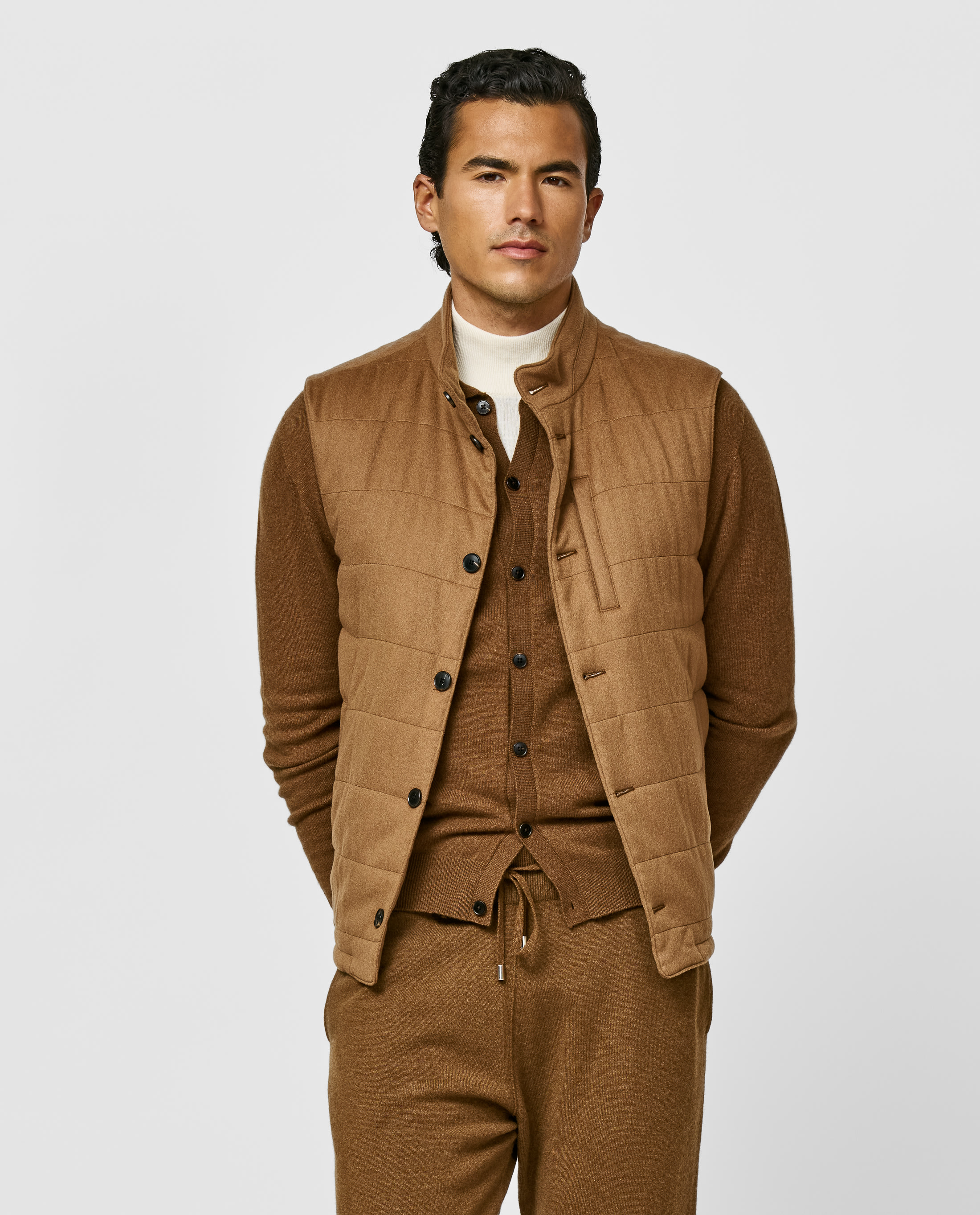 This cinnamon vest is crafted from the luxurious Bactrian camel fleece fabric made in Italy by Loro Piana. Sourced from the rare, noble fibers of baby camels in Mongolia, this ancestral quality is known for its exceptional softness, insulation, and natural color. Style it with a mock neck knit, leisure pants, and suede runners to complete the look. Make this vest your own with our many customization options to choose from.