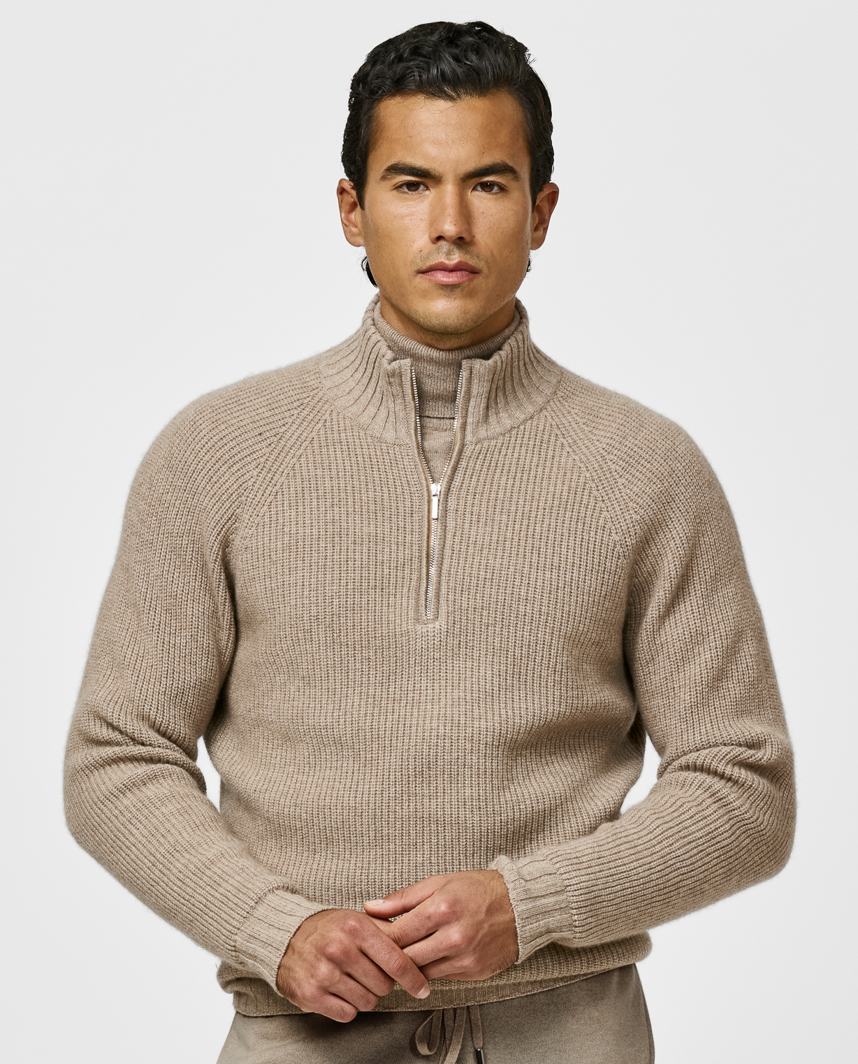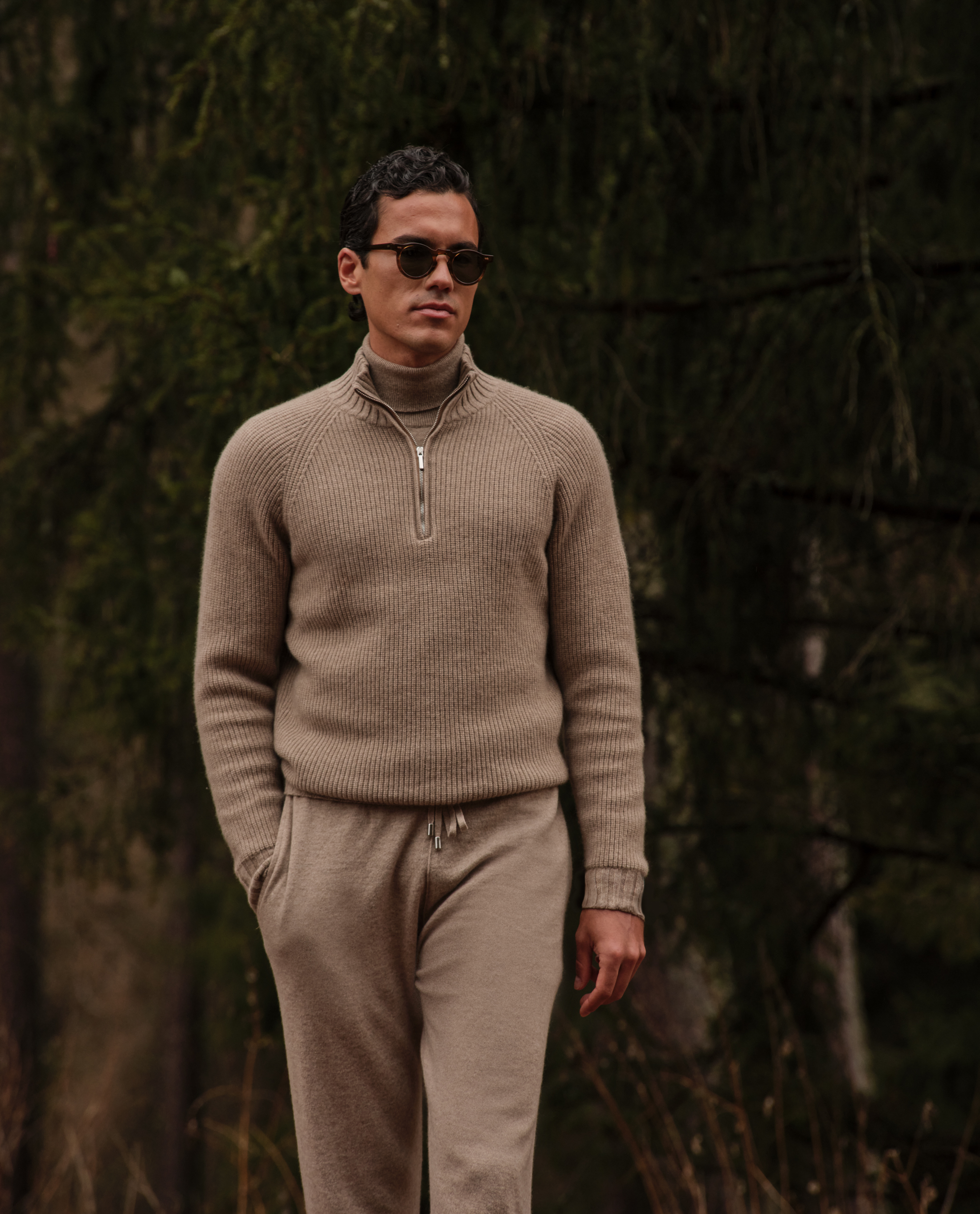 Experience tonal dressing at its finest with layers of ultra-soft cashmere in a seasonally neutral beige. This ensemble includes a half-zip, turtleneck, leisure pants, beanie, and scarf to keep you insulated against the winter chill. Perfect for travel days or long walks through snowy woods.