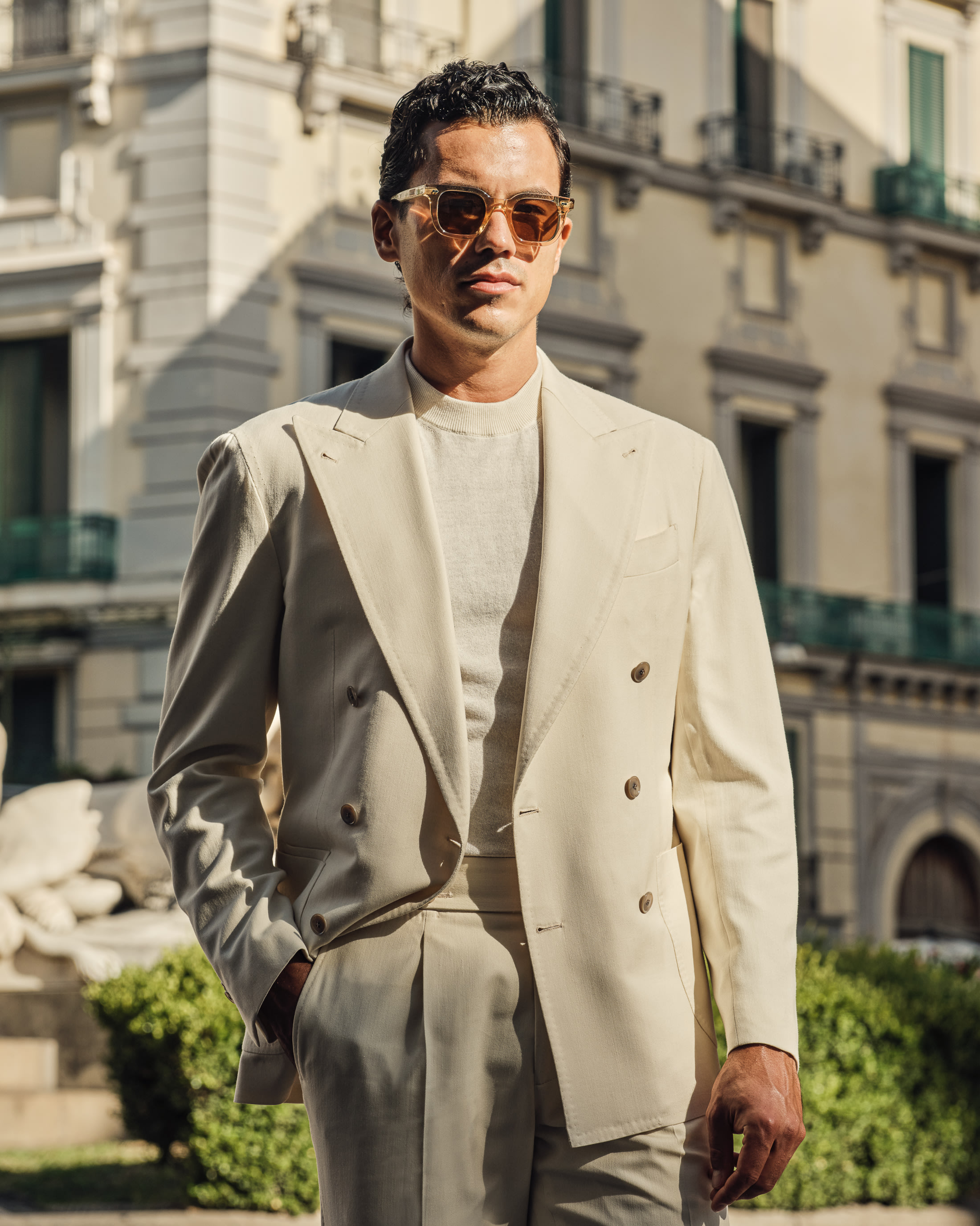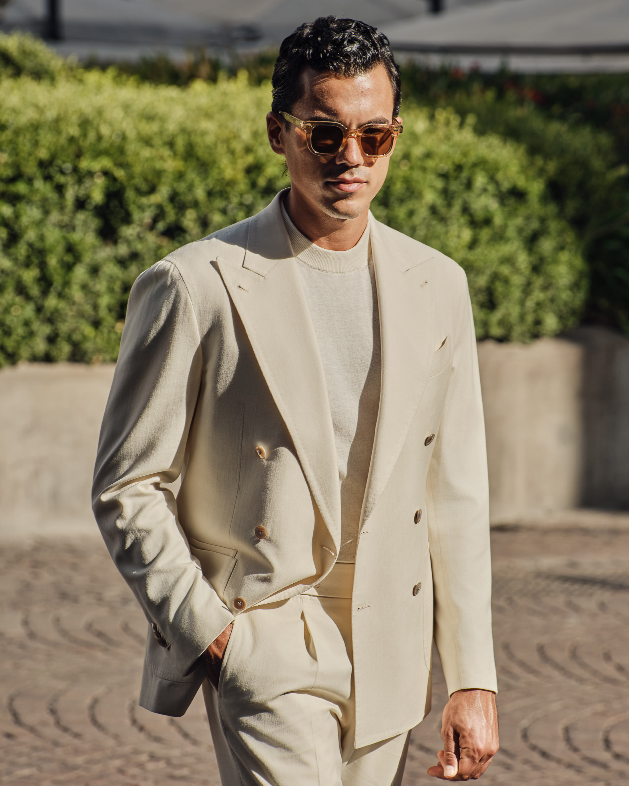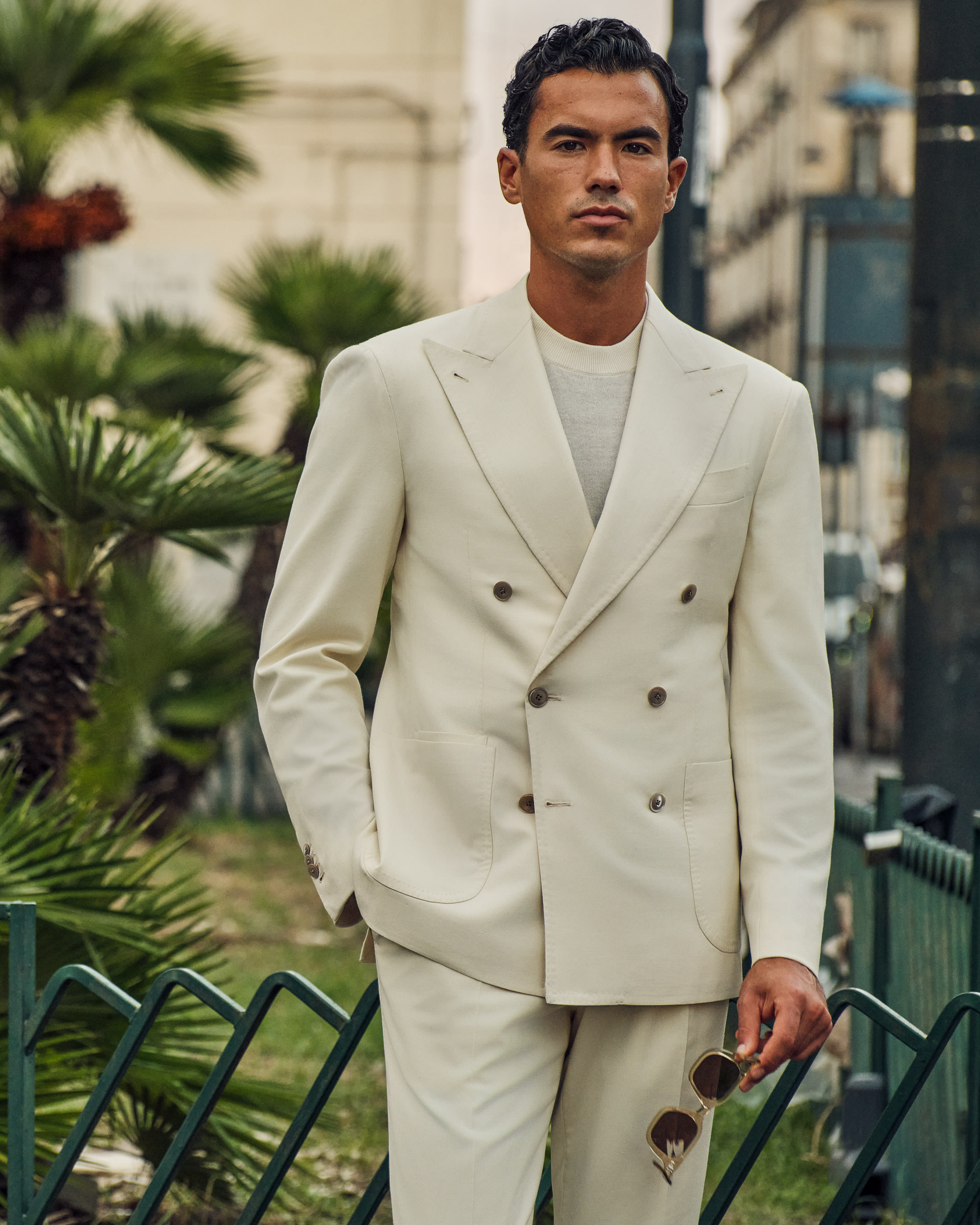 A statement for high summer. Rooted in Neapolitan tailoring, this crisp colored look strikes the perfect balance between presence and ease. This kind of confident silhouette needs no tie, only a cotton-cashmere knit, pair of suede loafers, and your favourite pair of shades.