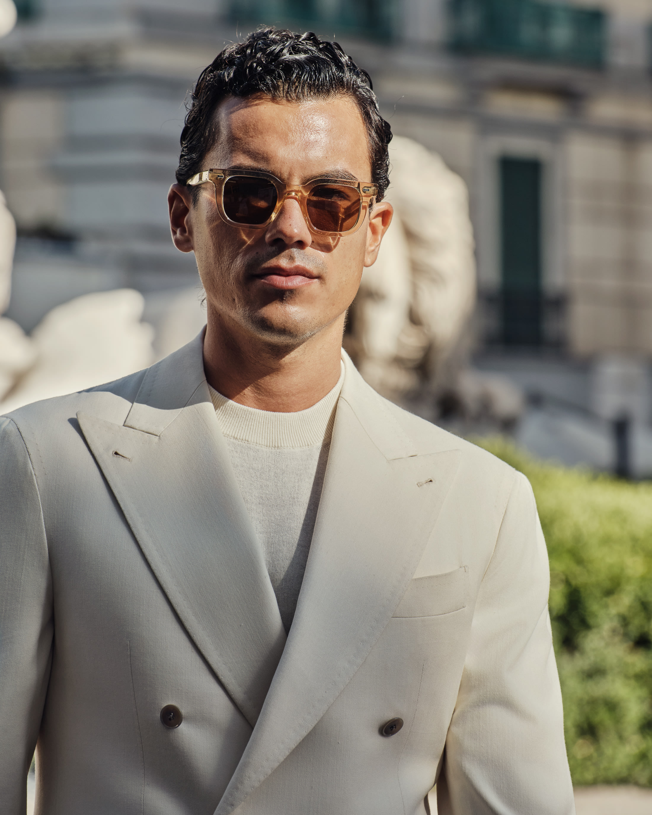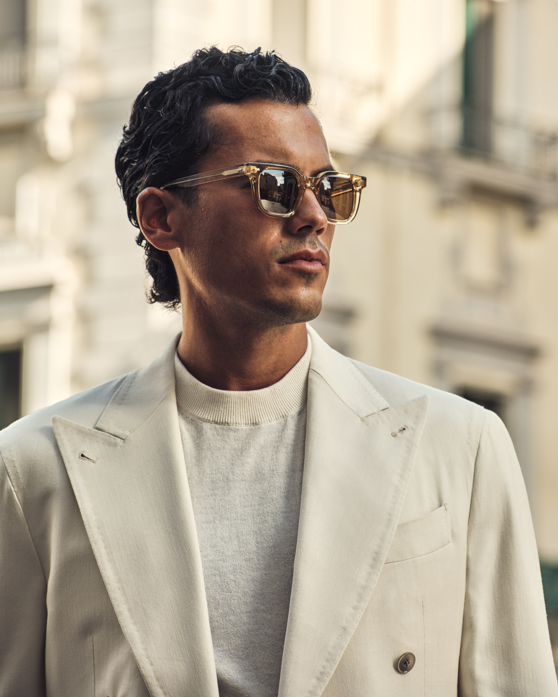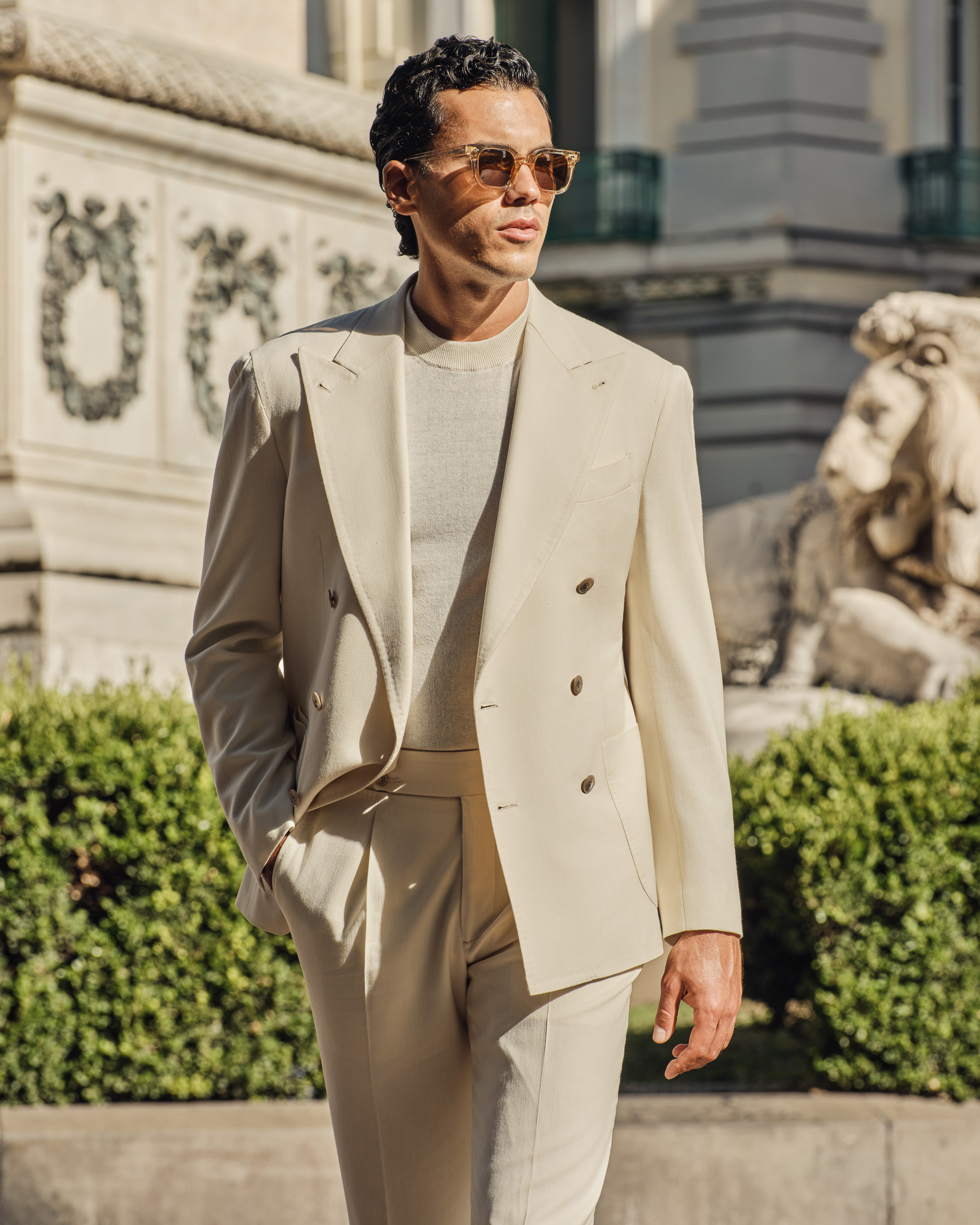 A statement for high summer. Rooted in Neapolitan tailoring, this crisp colored look strikes the perfect balance between presence and ease. This kind of confident silhouette needs no tie, only a cotton-cashmere knit, pair of suede loafers, and your favourite pair of shades.