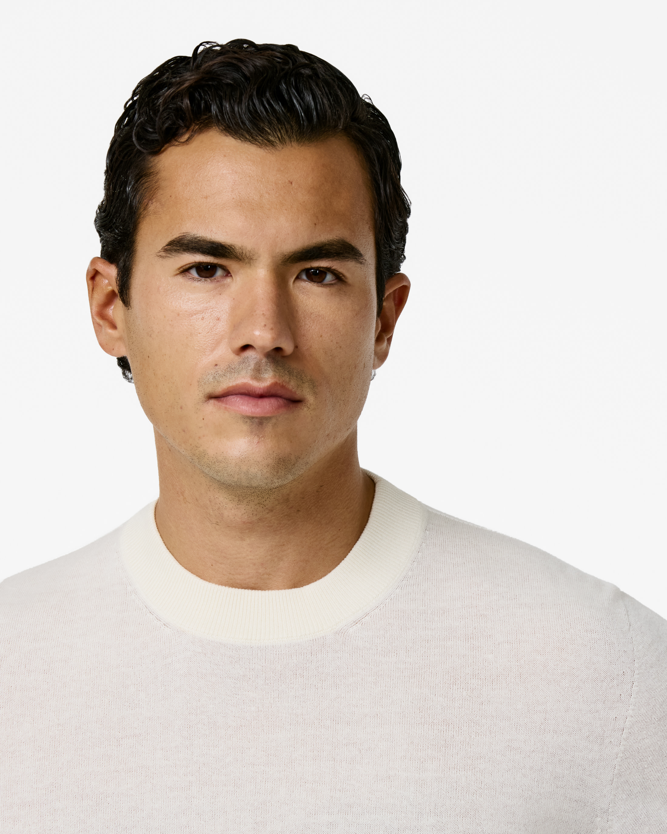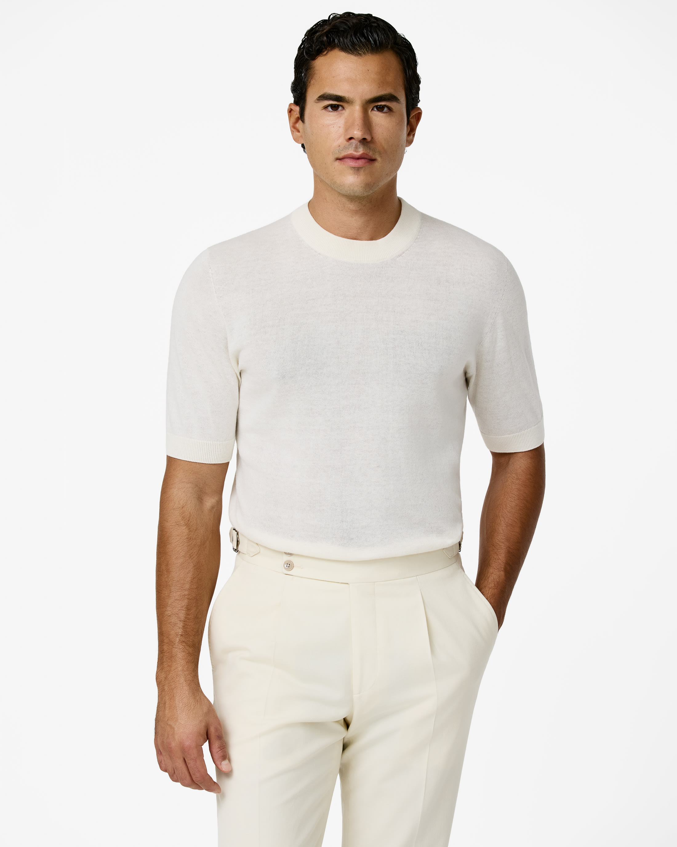 This off-white knit is summer friendly with a seamless finish. Crafted from a blend of breathable Turkish cotton and soft Inner Mongolian cashmere. Designed here as a classic crew neck, in single-ply yarn for a lightweight look.
