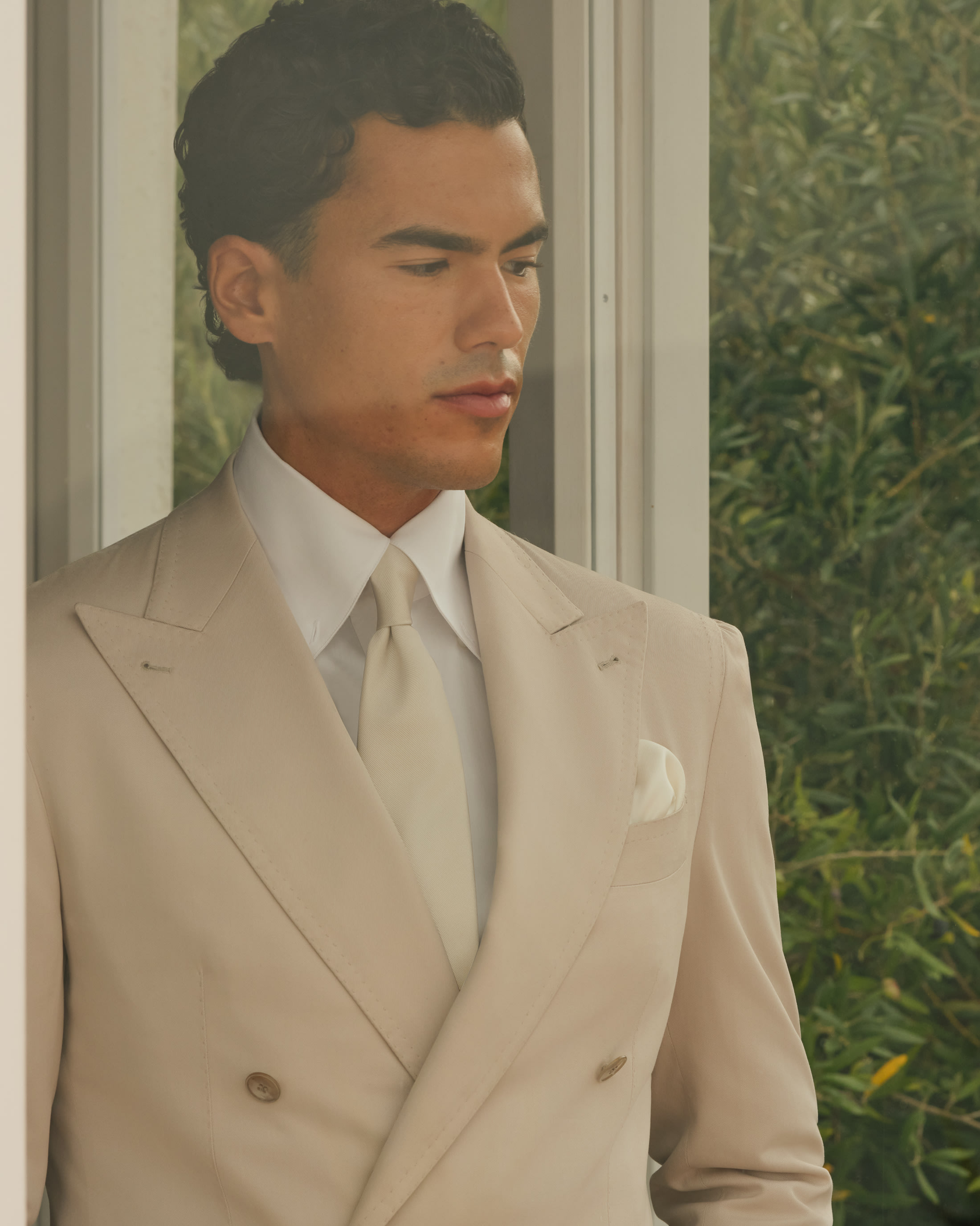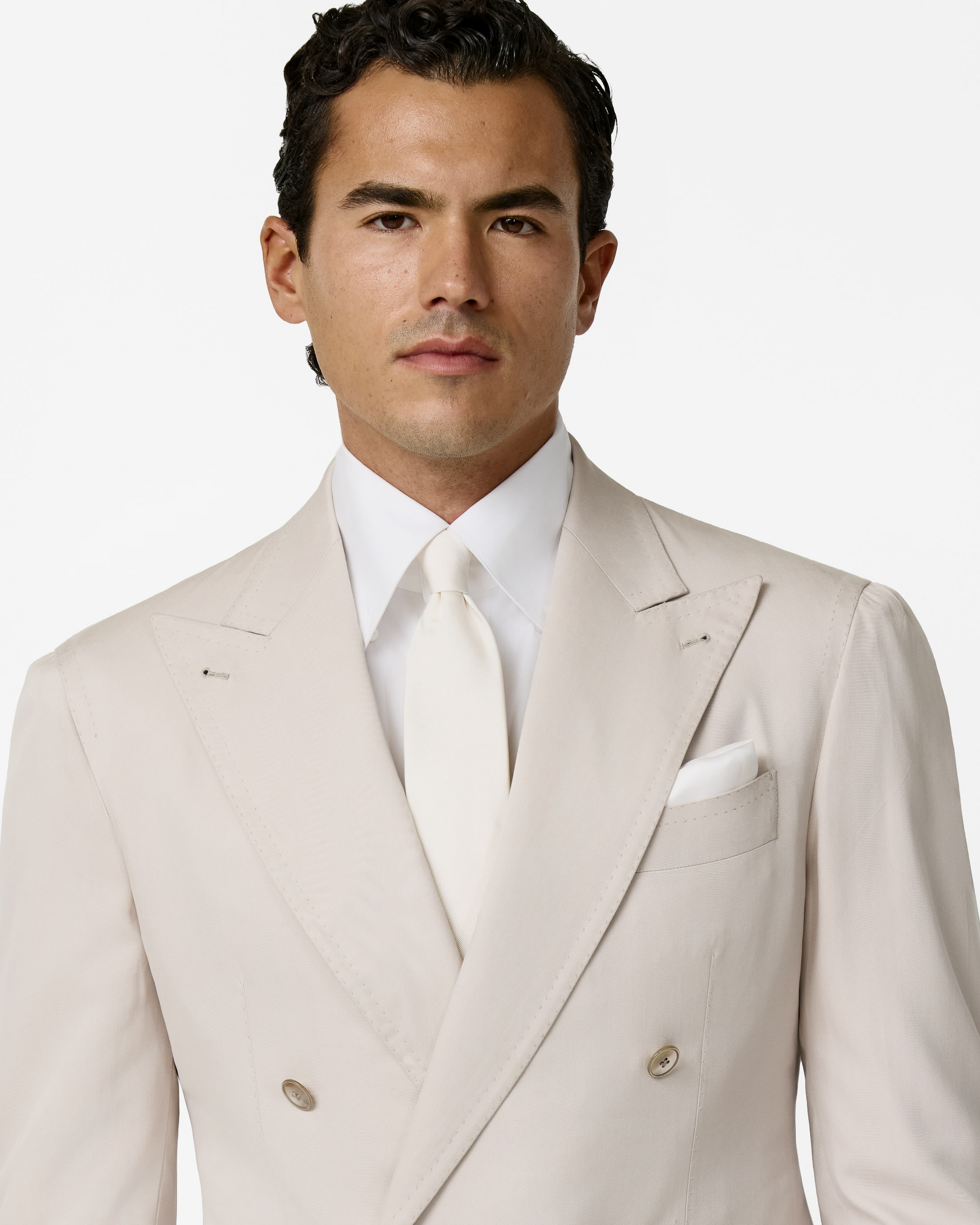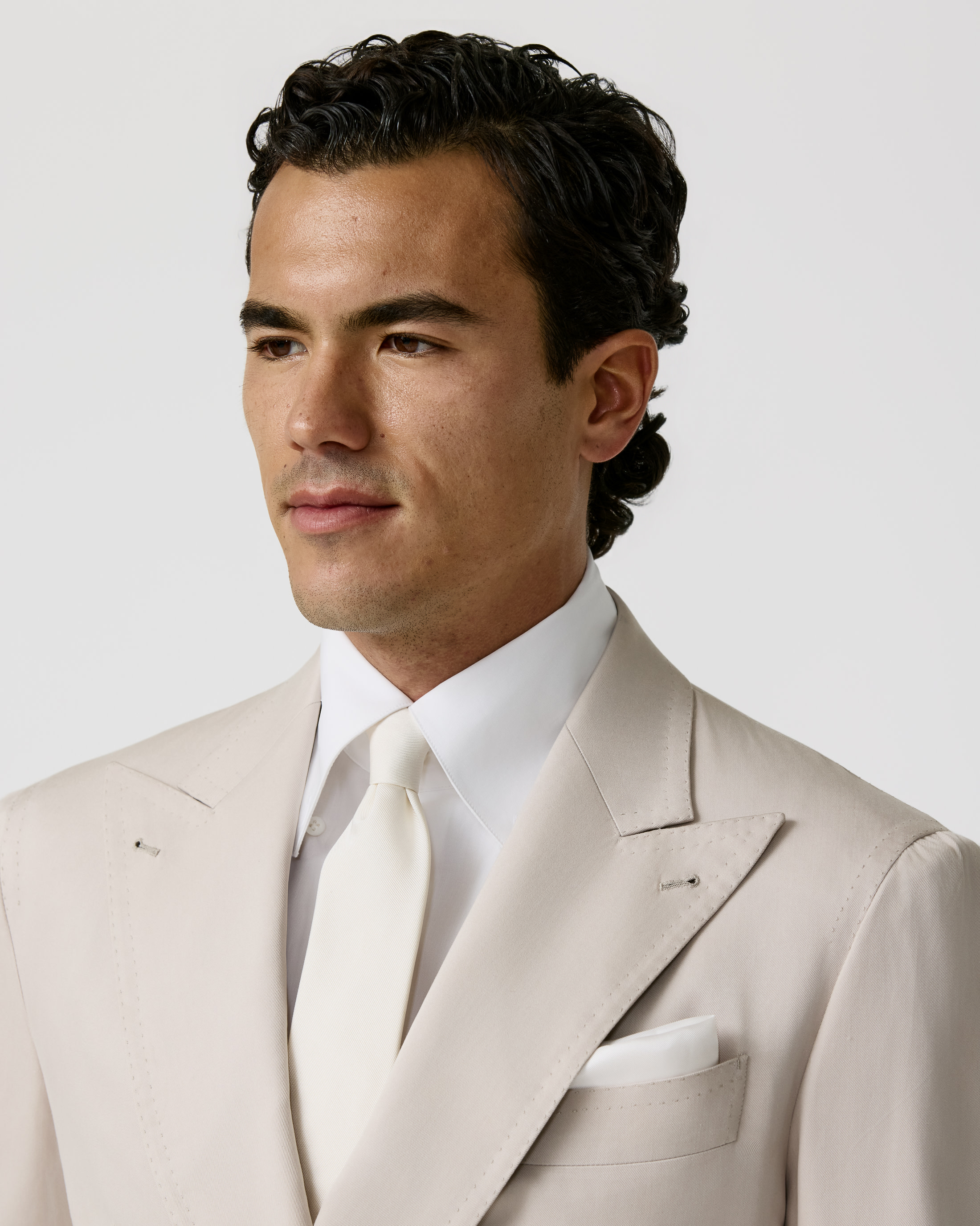 An ensemble for life’s defining moments. This suit's exclusive ecru silk allows the fine detailing and drape to take center stage. Curated for a summer soirée with a classic white shirt, silver silk tie, and a light gray edged silk pocket square.