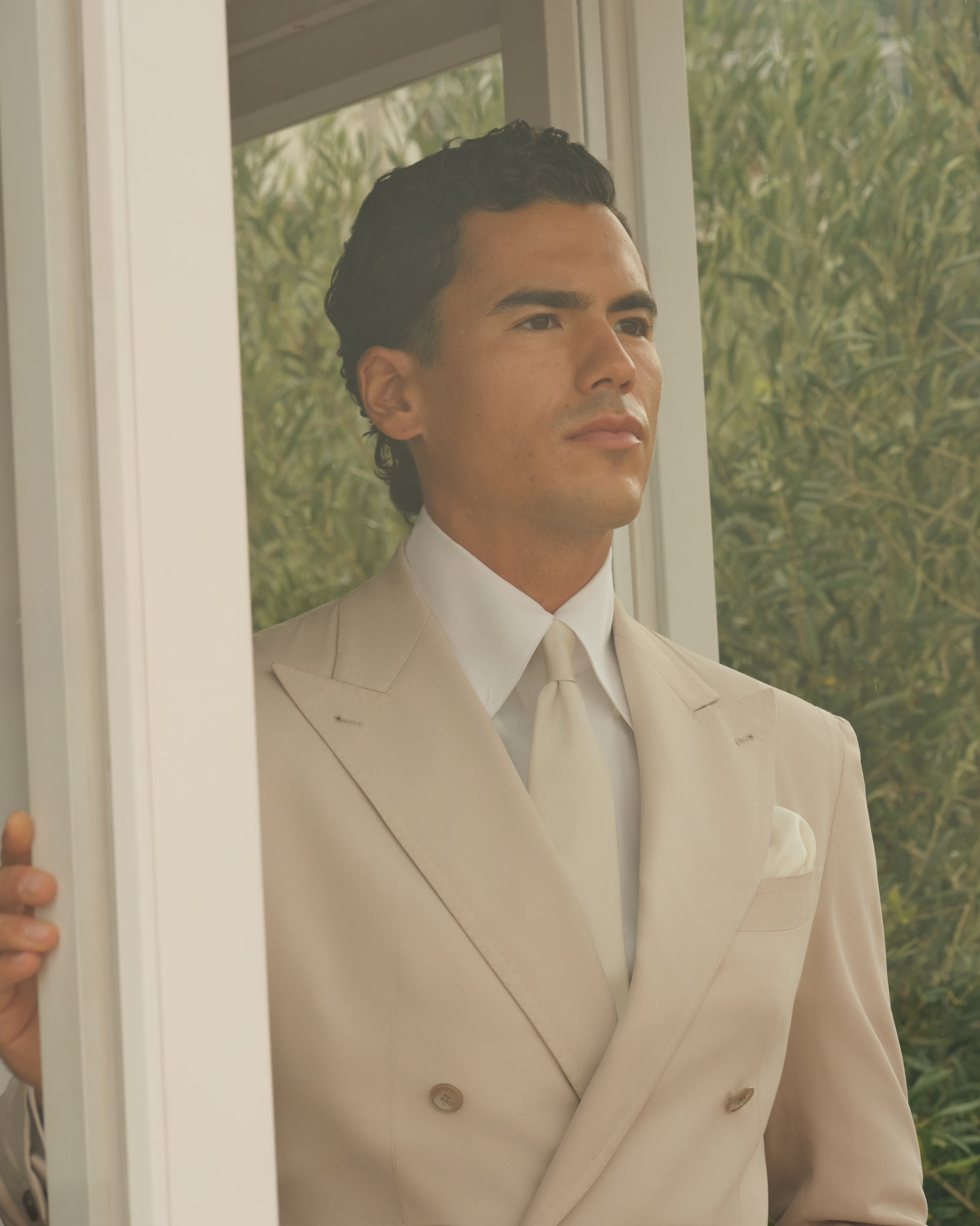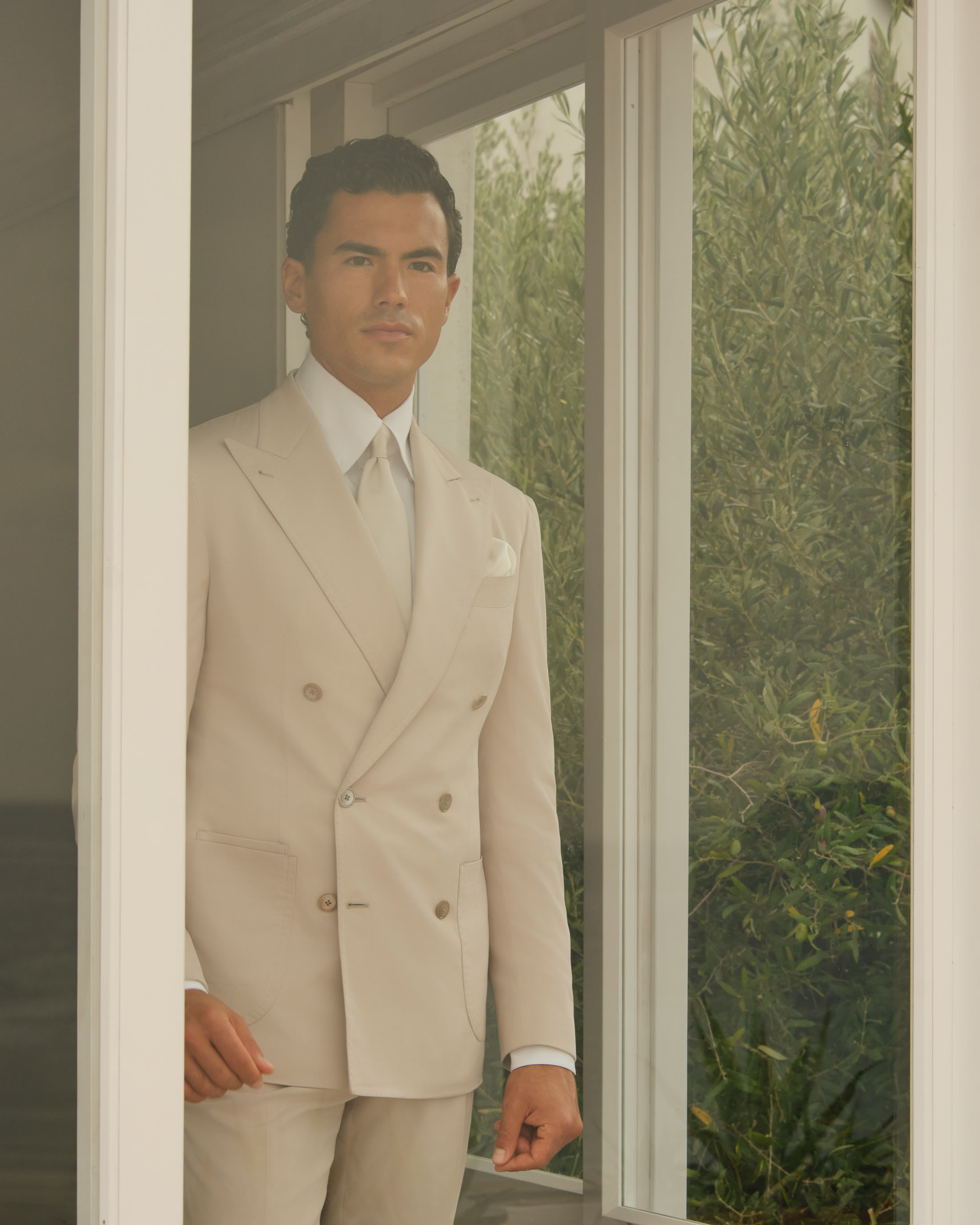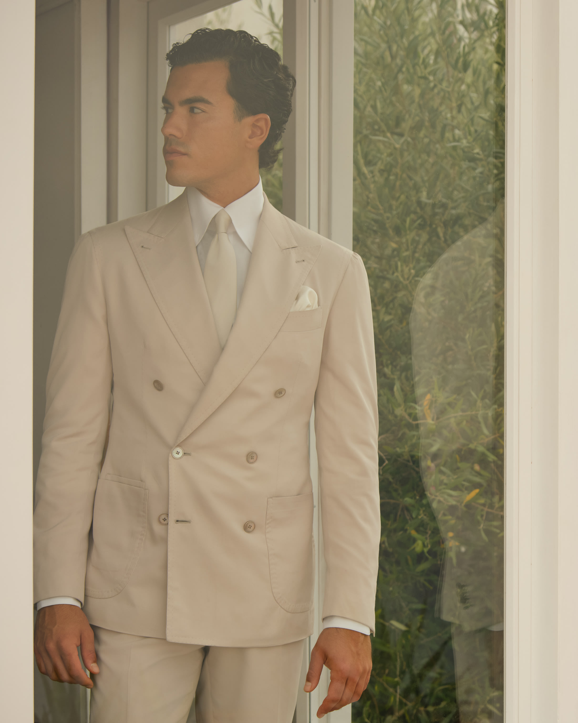 An ensemble for life’s defining moments. This suit's exclusive ecru silk allows the fine detailing and drape to take center stage. Curated for a summer soirée with a classic white shirt, silver silk tie, and a light gray edged silk pocket square.