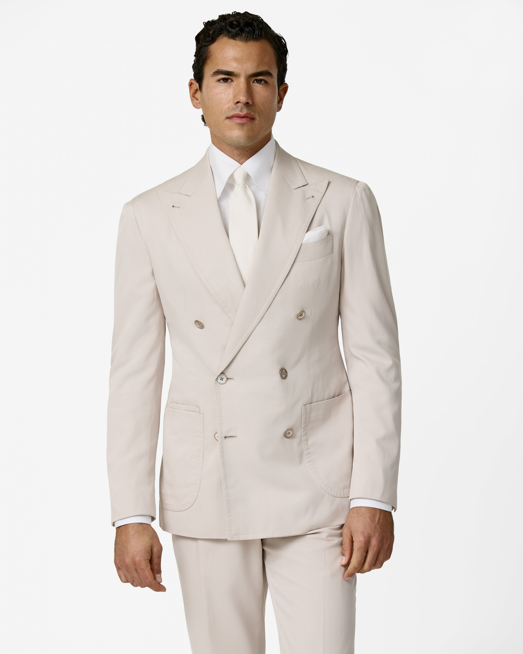 With comfort, character, and season-spanning wearability, this ecru suit defines understated sophistication. Made from pure silk with a distinctive washed finish, the fabric is an excellent example of refined Italian craftsmanship. With a uniquely soft handfeel, subtle delavé tones, and a suede-like drape, it transitions effortlessly between classic tailoring and relaxed luxury. Designed here as a double-breasted jacket with peak lapels and an unconstructed camicia shoulder. Style it with a silk tie, pocket square, and suede loafers to complete the look.