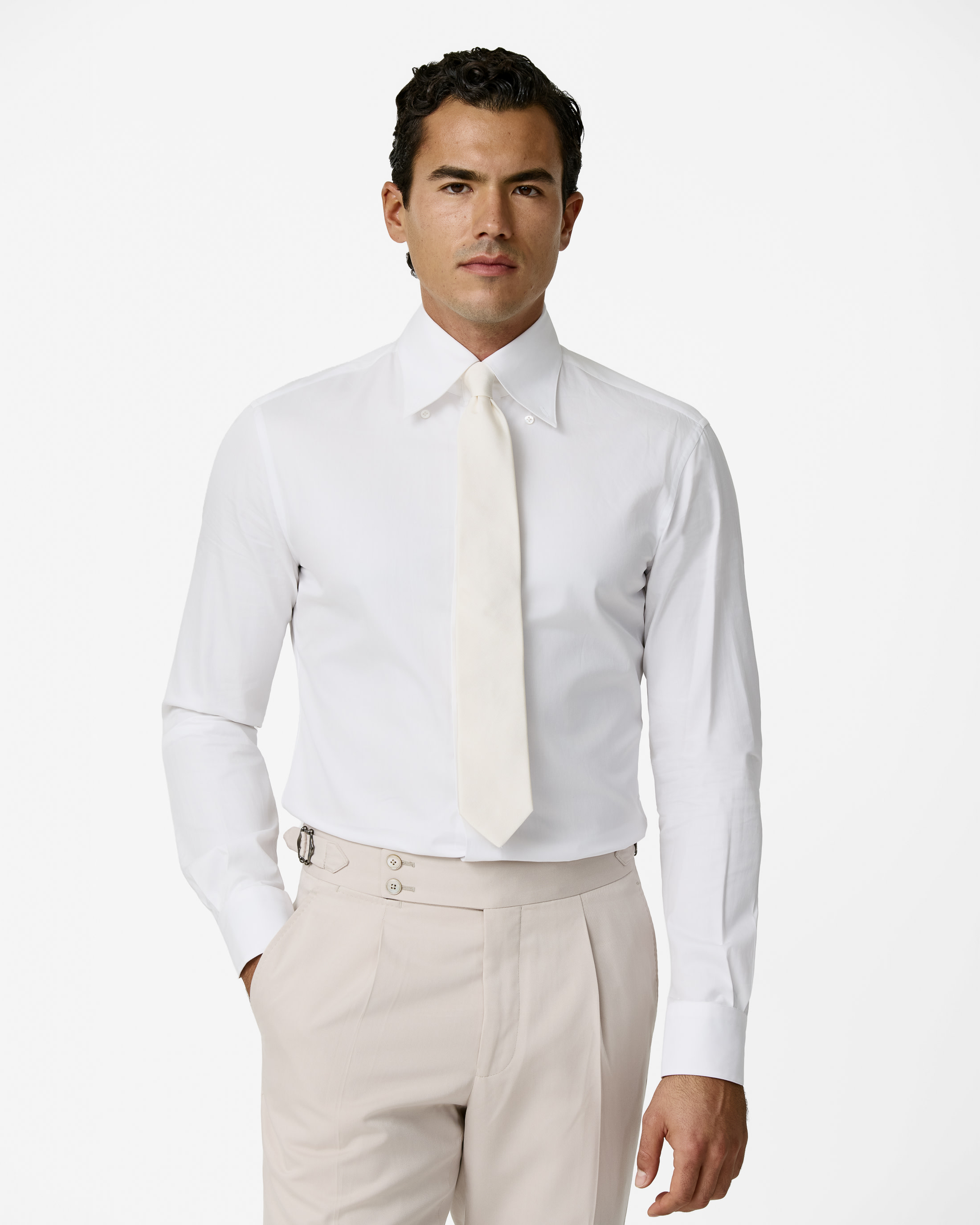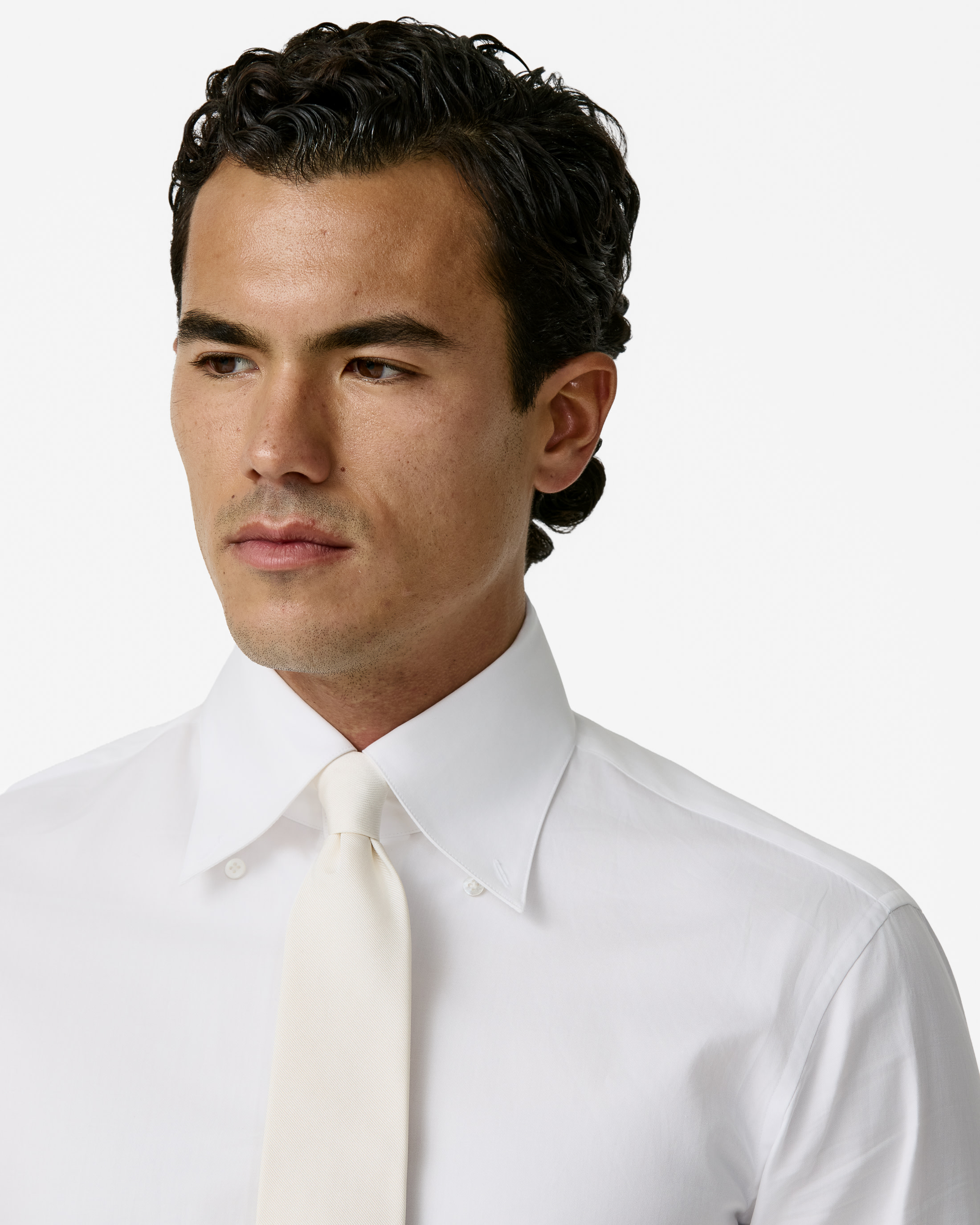 This soft white shirt is a luxurious take on a summer essential. Made from rare Sea Island cotton, woven with fine double-twisted yarns. Designed here with a button-down collar.