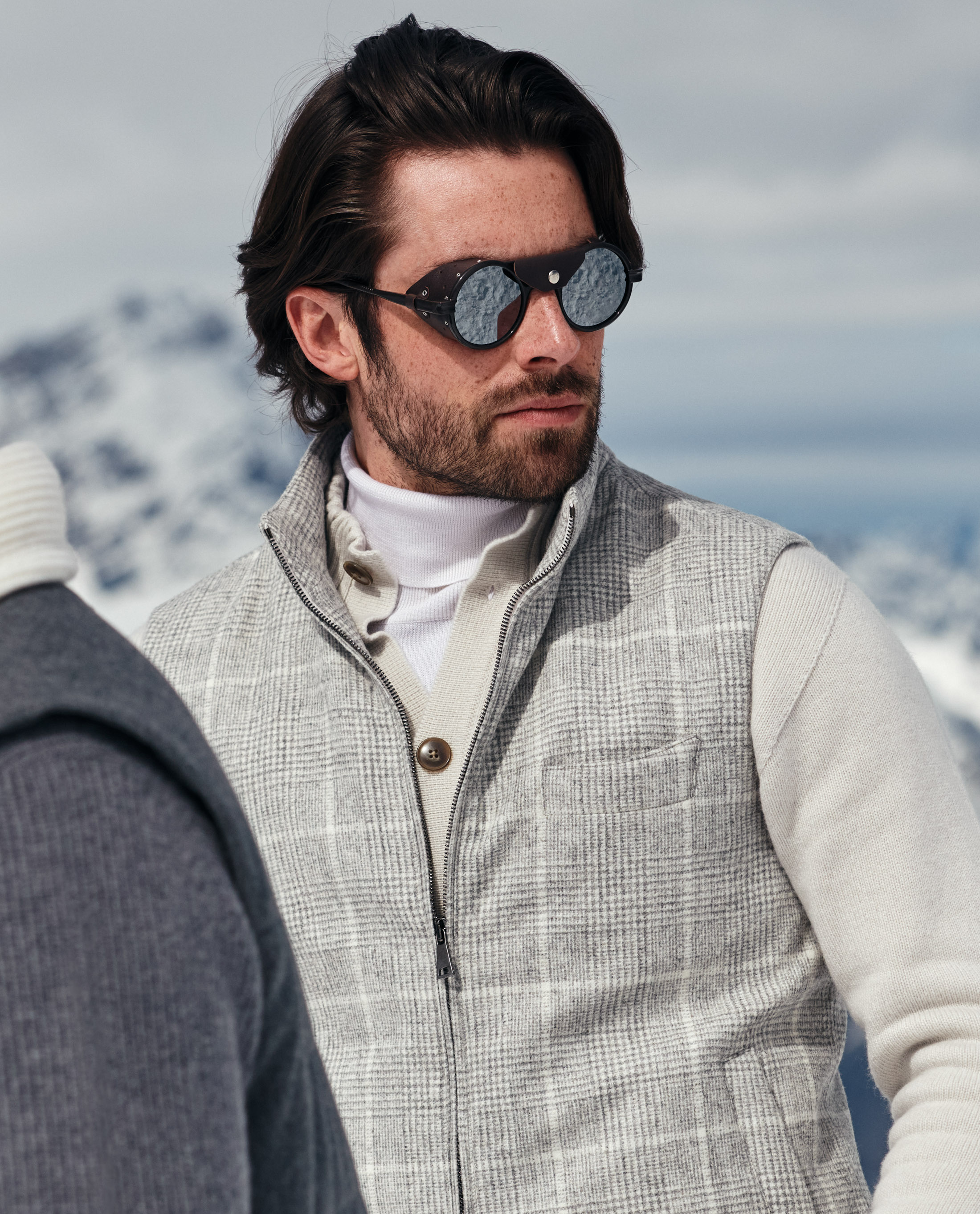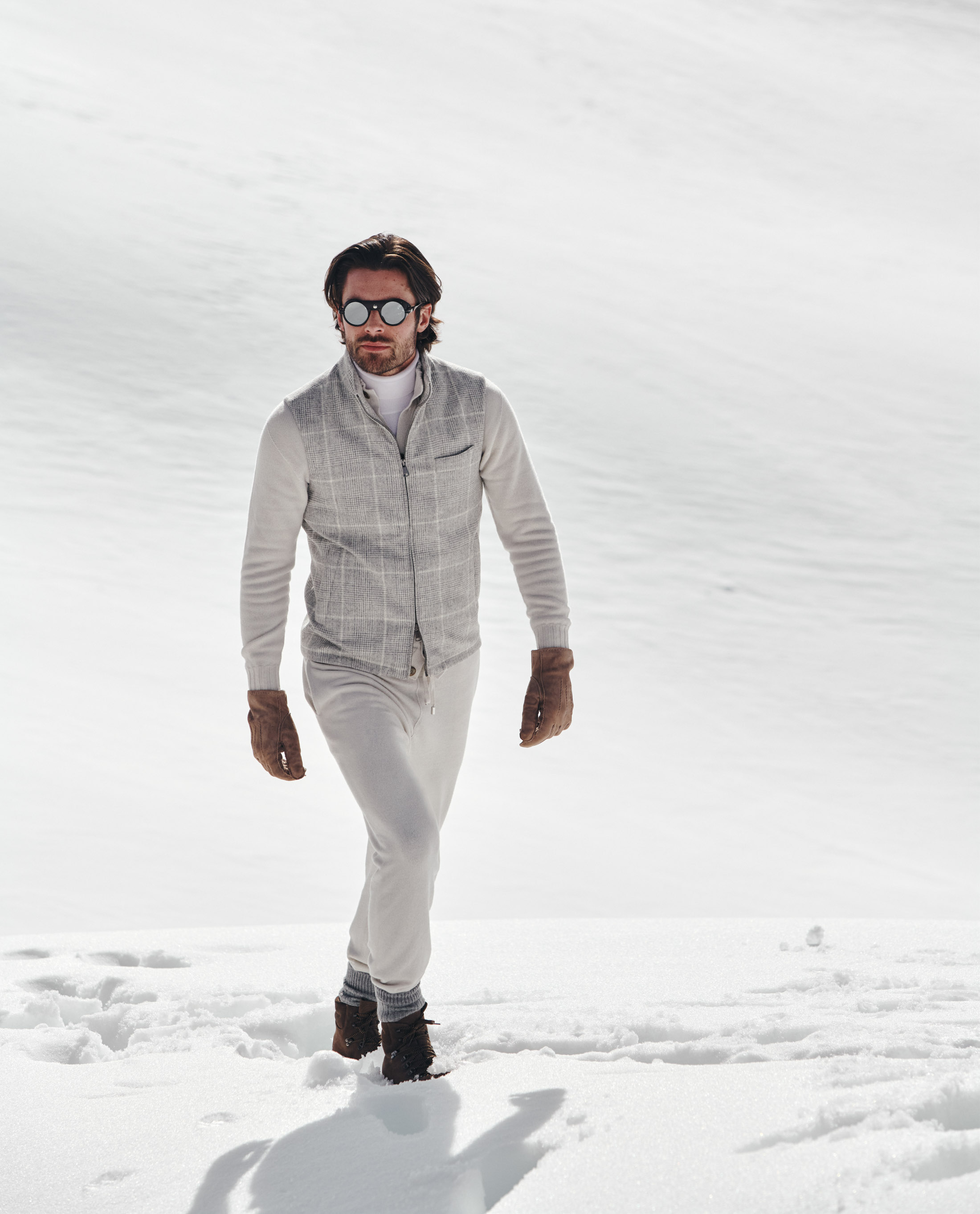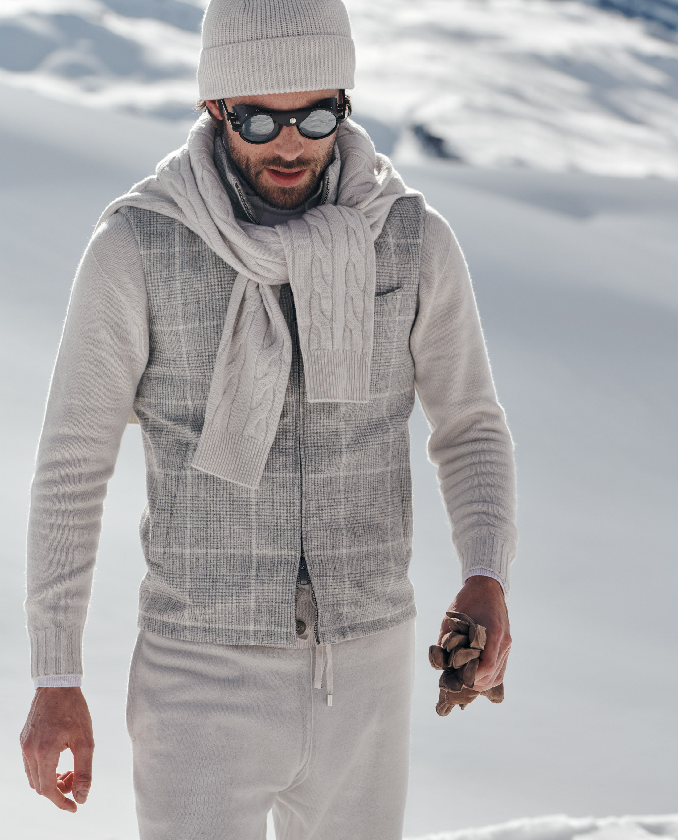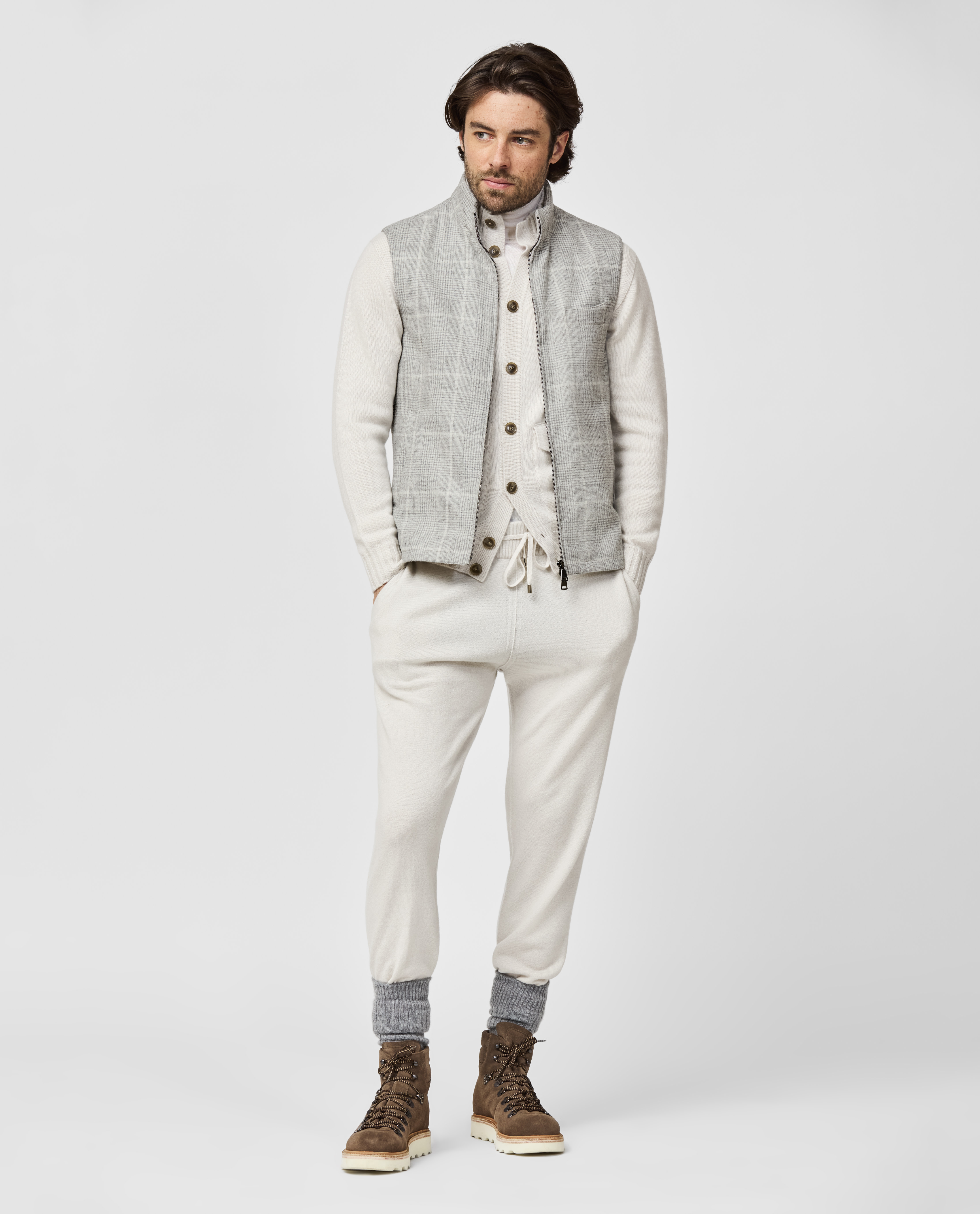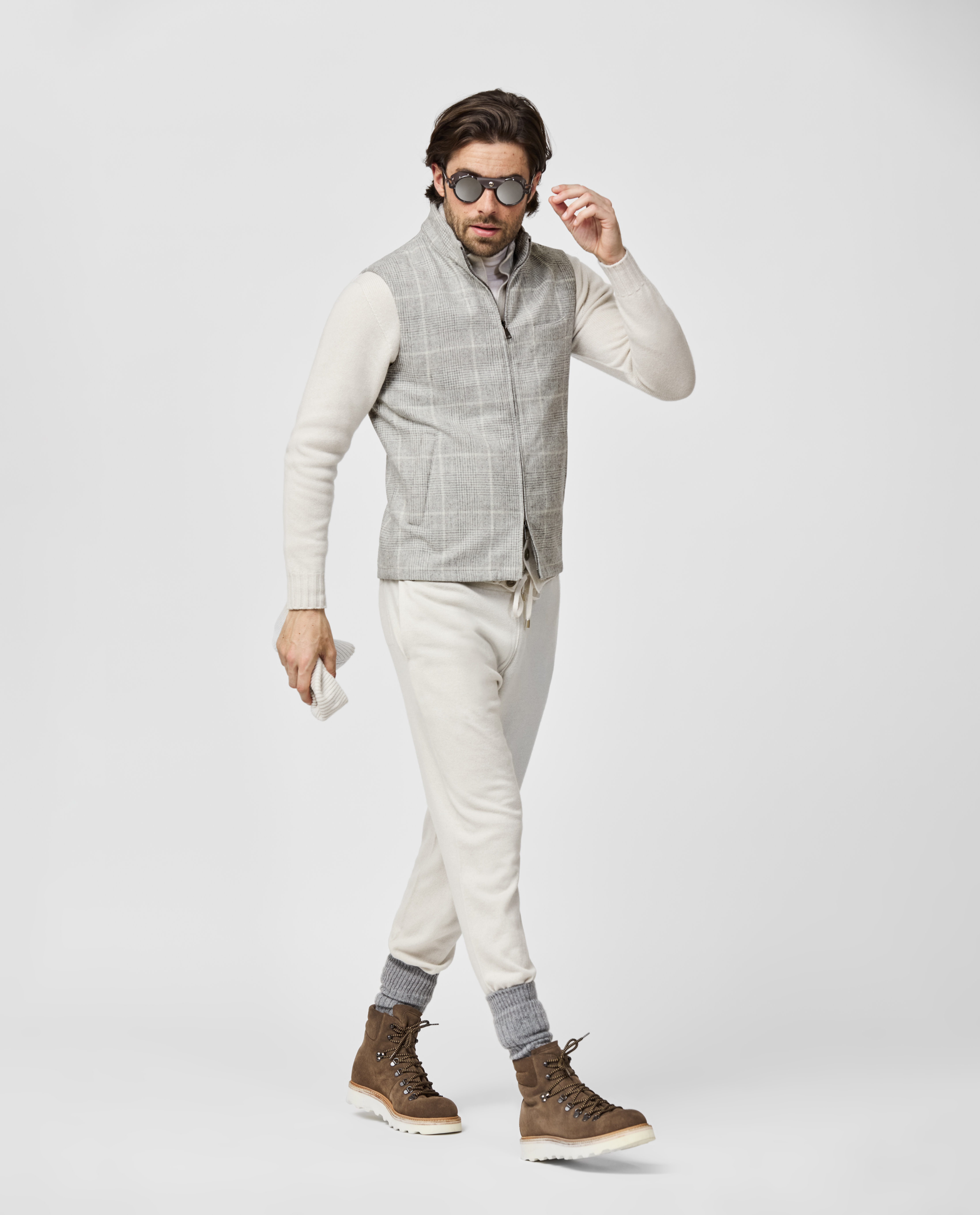 Whether you're relaxing at home or enjoying a snowy stroll, this smart-yet-comfy ensemble will keep you plenty warm thanks to its mix of ultra-soft seasonal staples. Built around an alpaca-wool vest in light gray Glen plaid, its tonal look is accented by mountain boots in brown suede and a matching full-button bomber knit, leisure pants, beanie, and scarf.