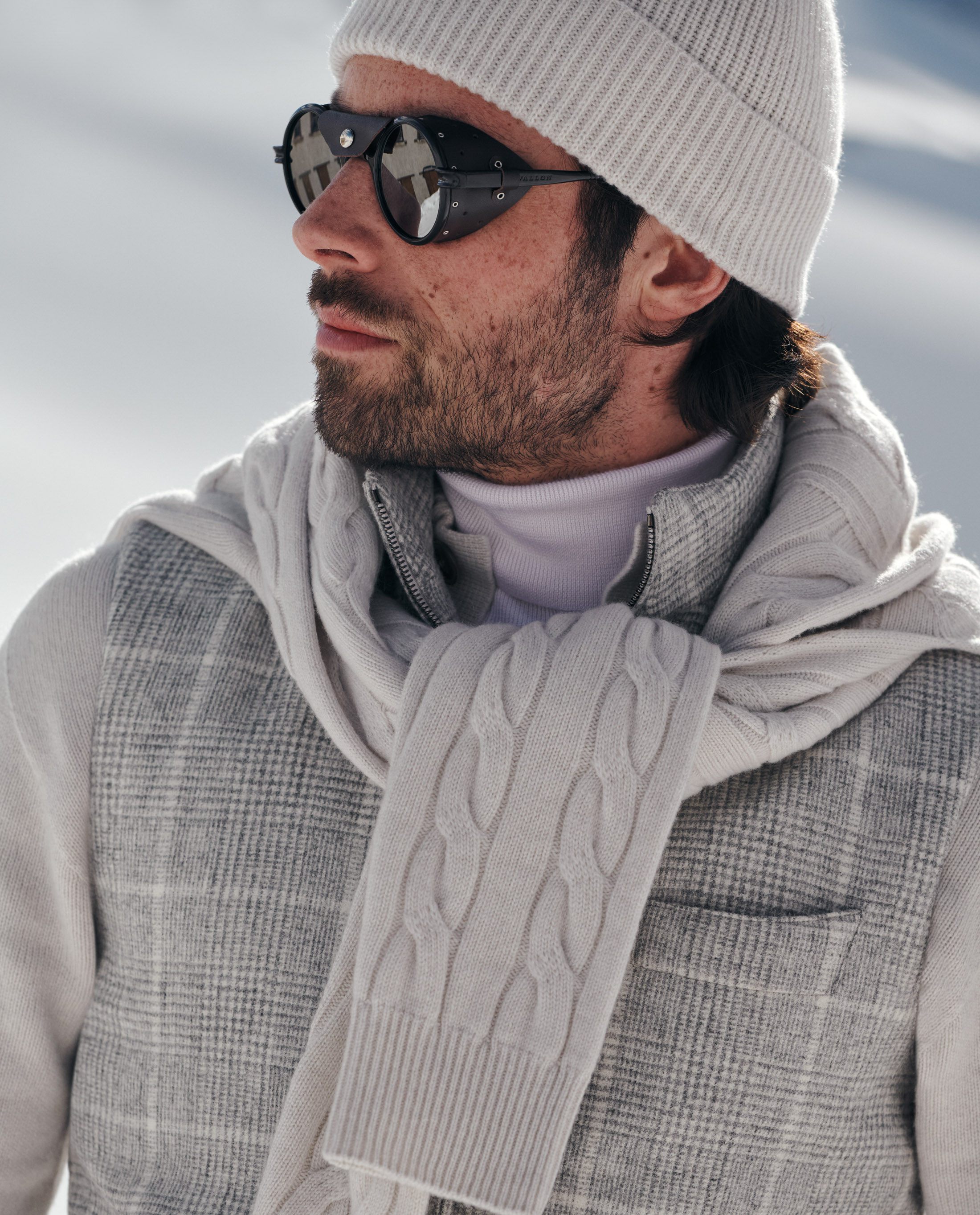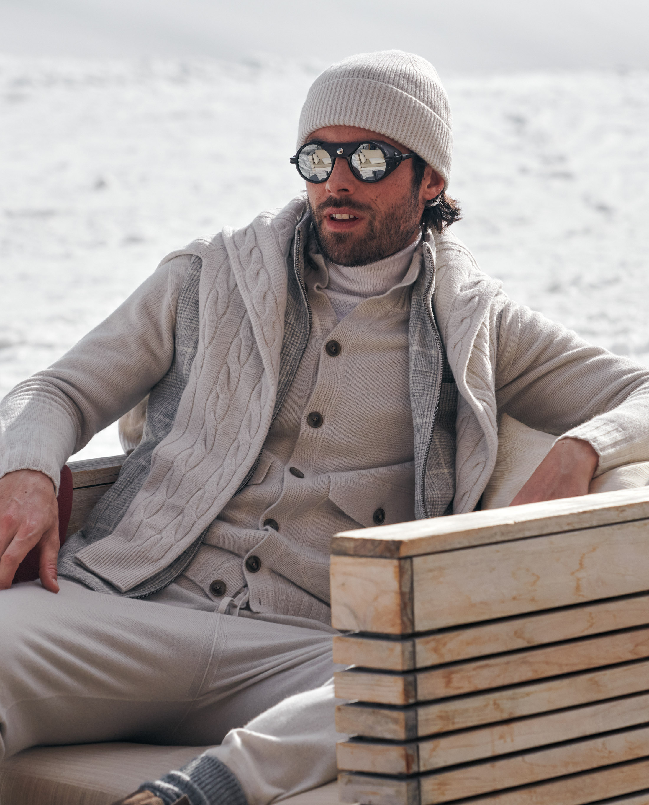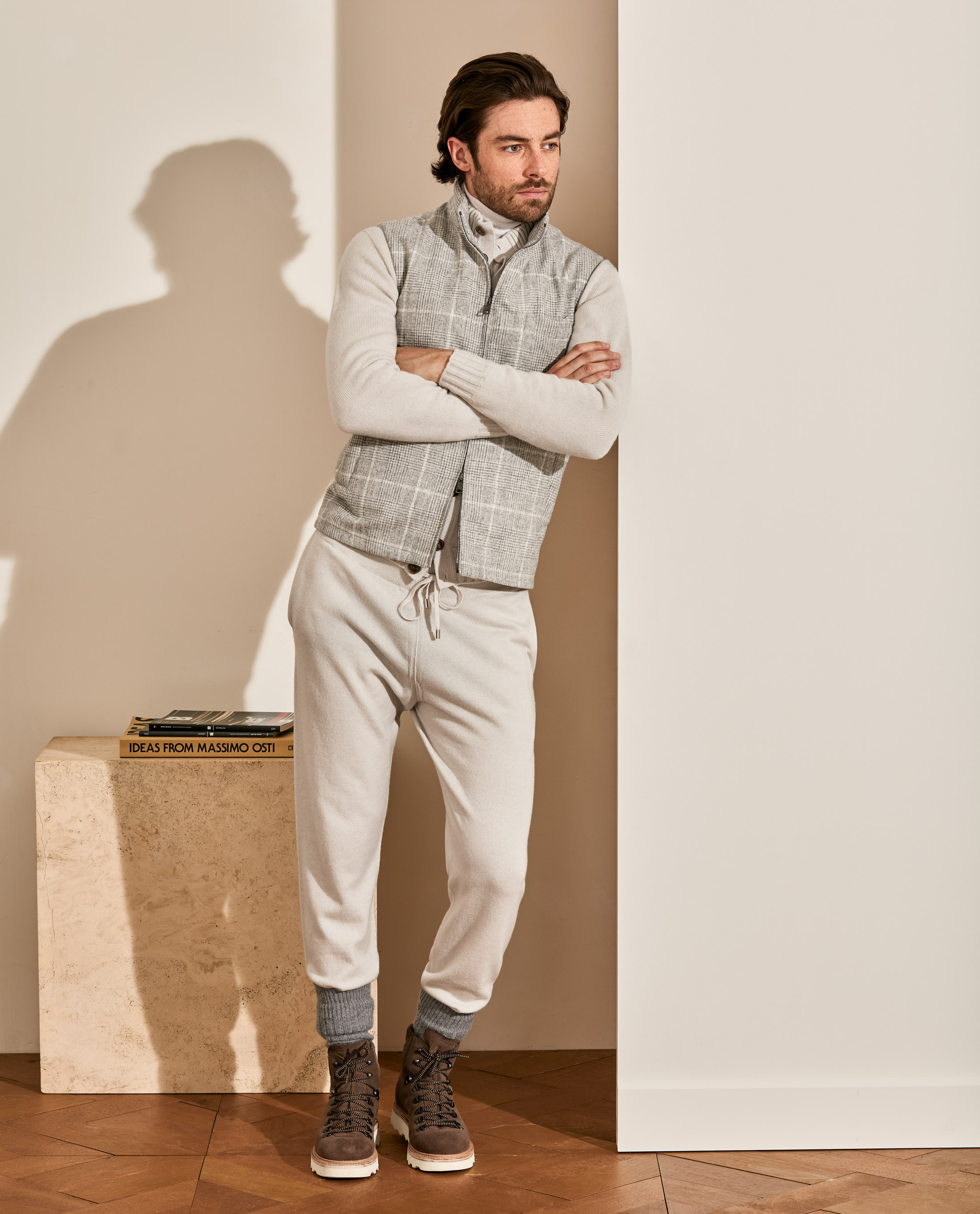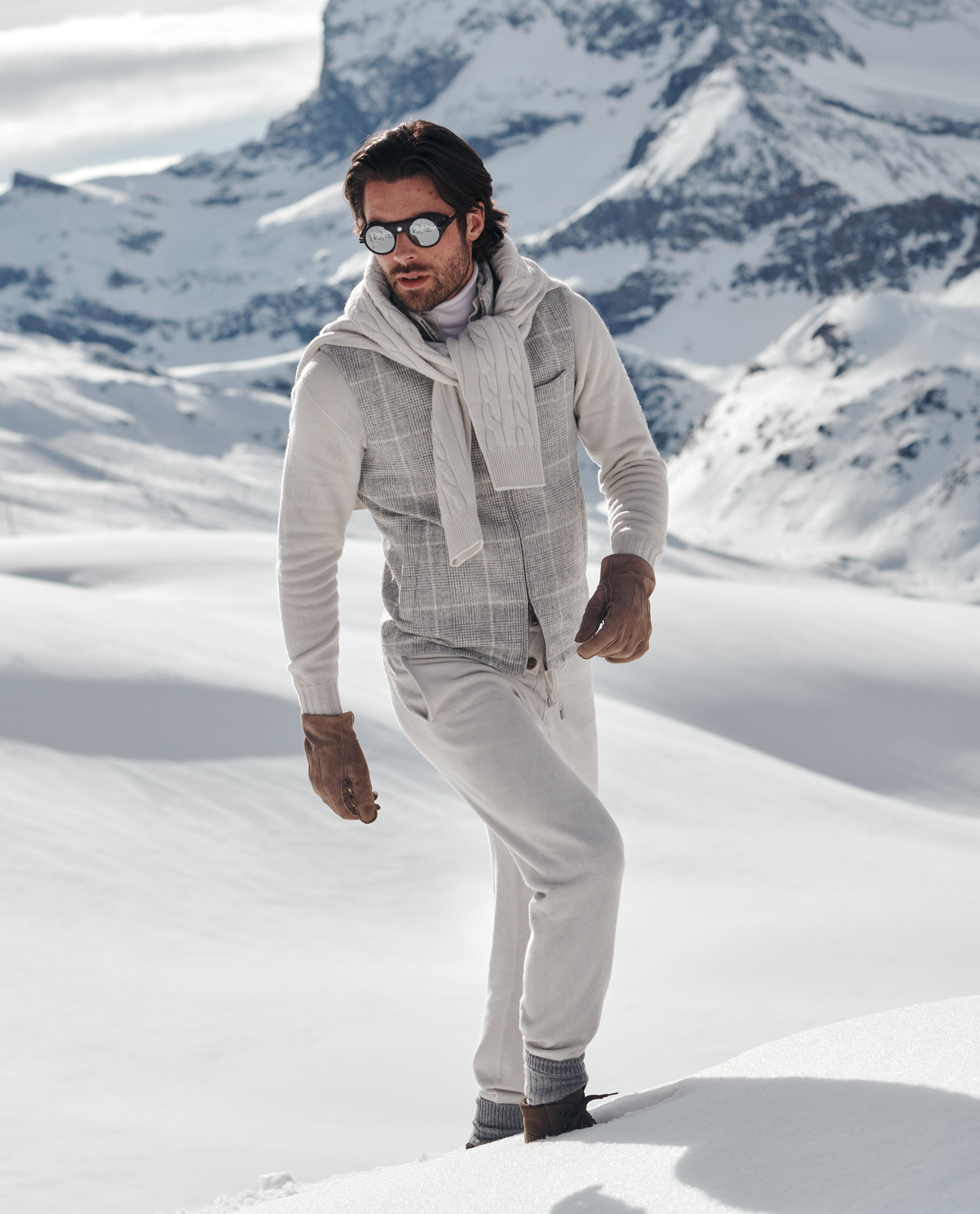 Whether you're relaxing at home or enjoying a snowy stroll, this smart-yet-comfy ensemble will keep you plenty warm thanks to its mix of ultra-soft seasonal staples. Built around an alpaca-wool vest in light gray Glen plaid, its tonal look is accented by mountain boots in brown suede and a matching full-button bomber knit, leisure pants, beanie, and scarf.