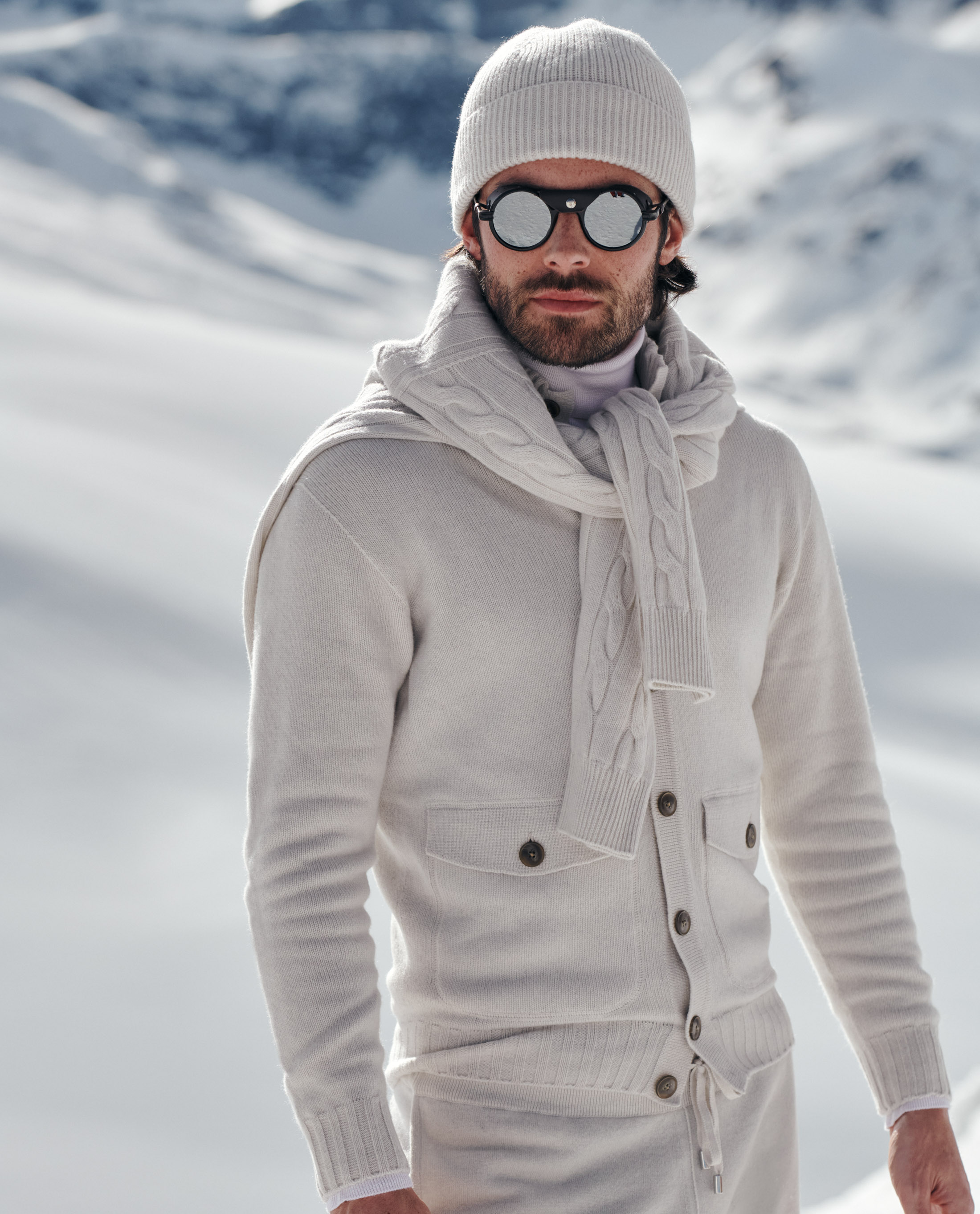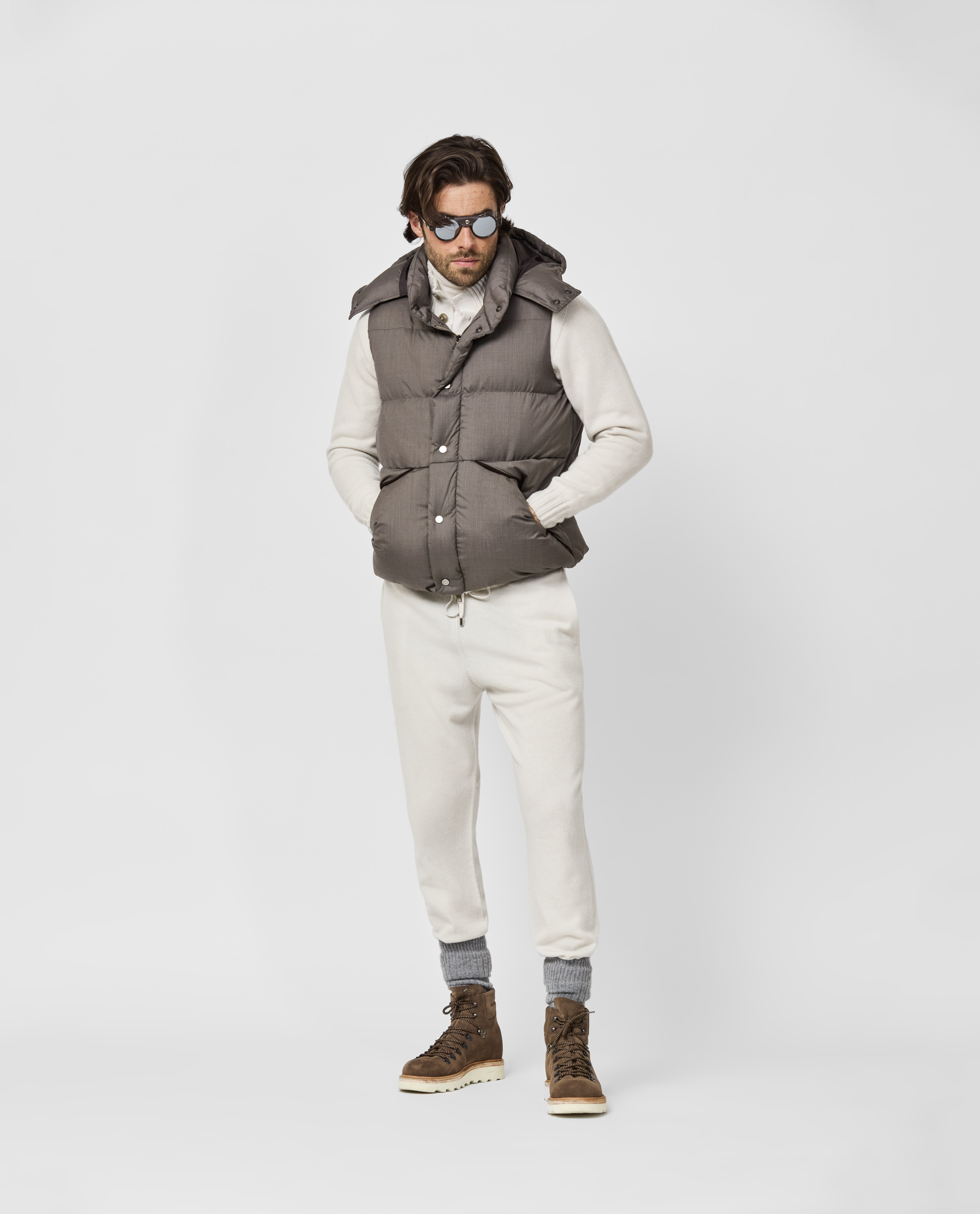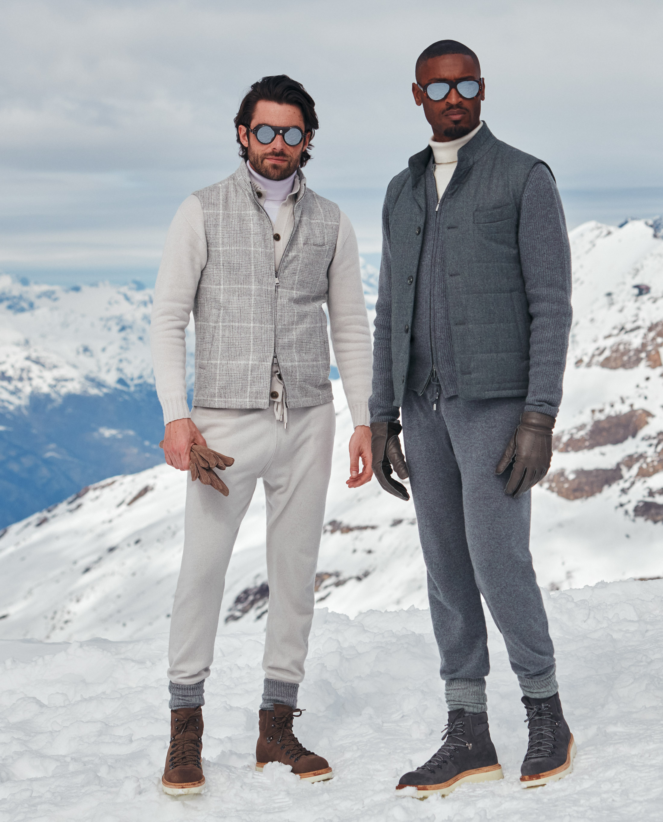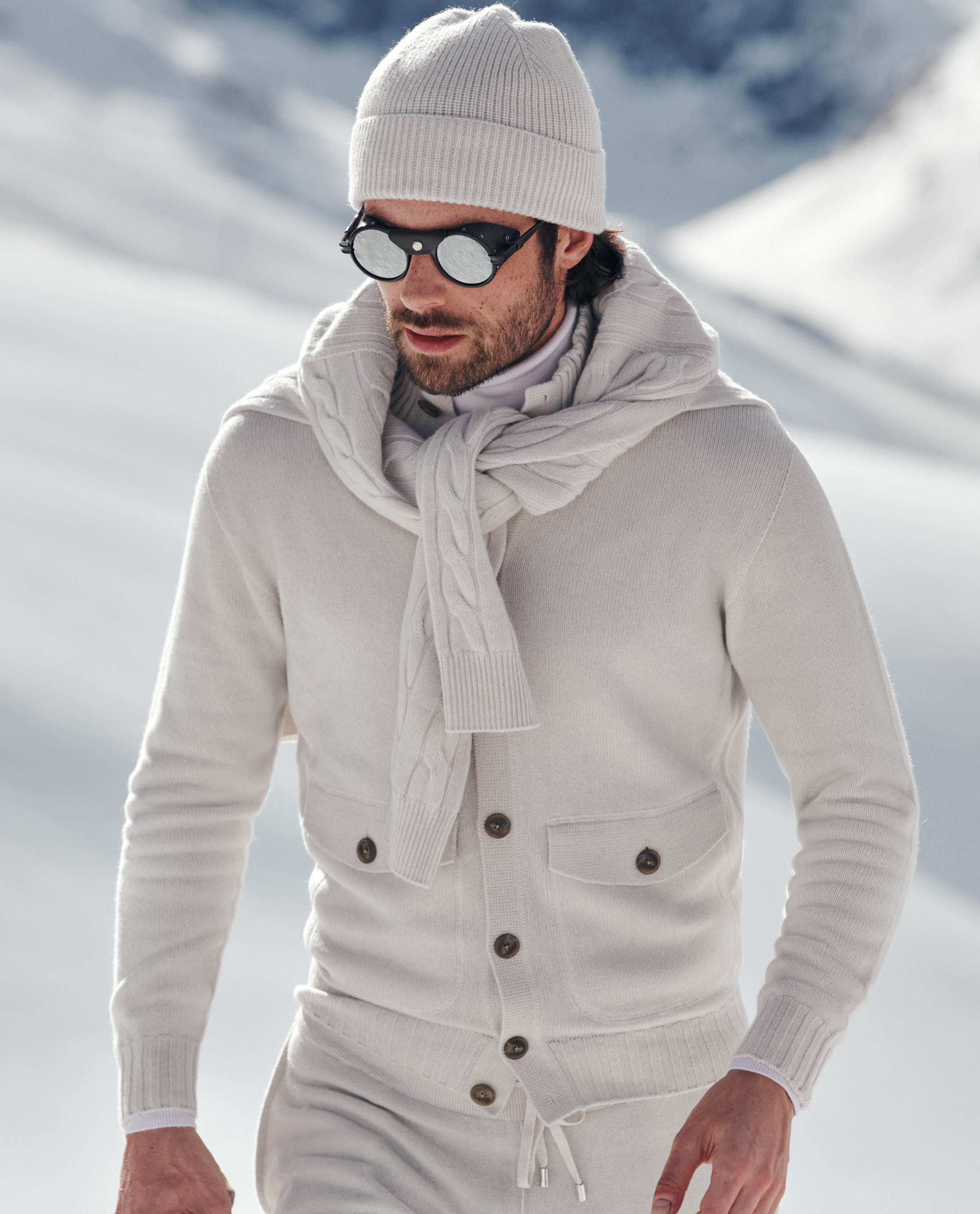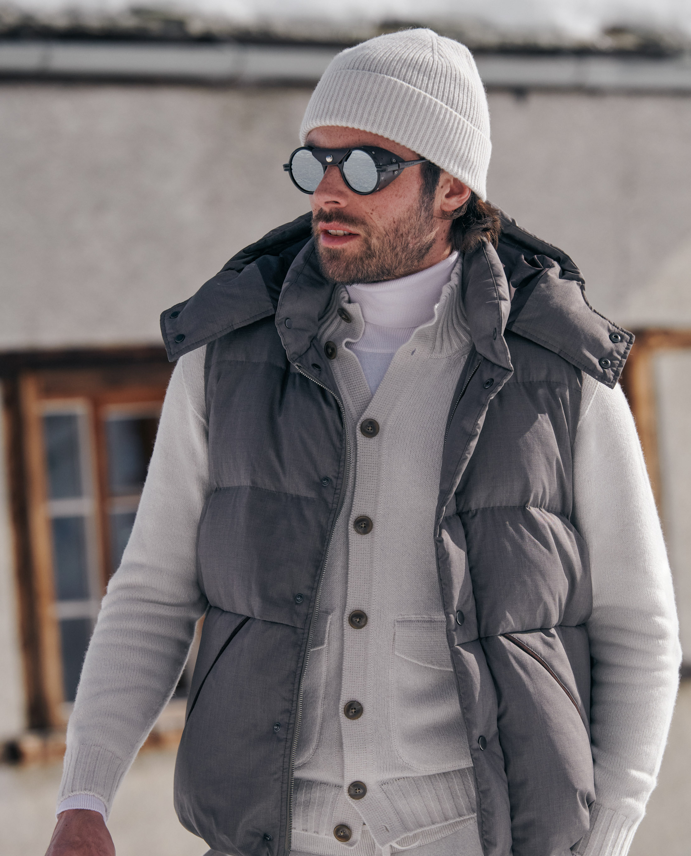 Whether you're relaxing at home or enjoying a snowy stroll, this smart-yet-comfy ensemble will keep you plenty warm thanks to its mix of ultra-soft seasonal staples. Built around an alpaca-wool vest in light gray Glen plaid, its tonal look is accented by mountain boots in brown suede and a matching full-button bomber knit, leisure pants, beanie, and scarf.