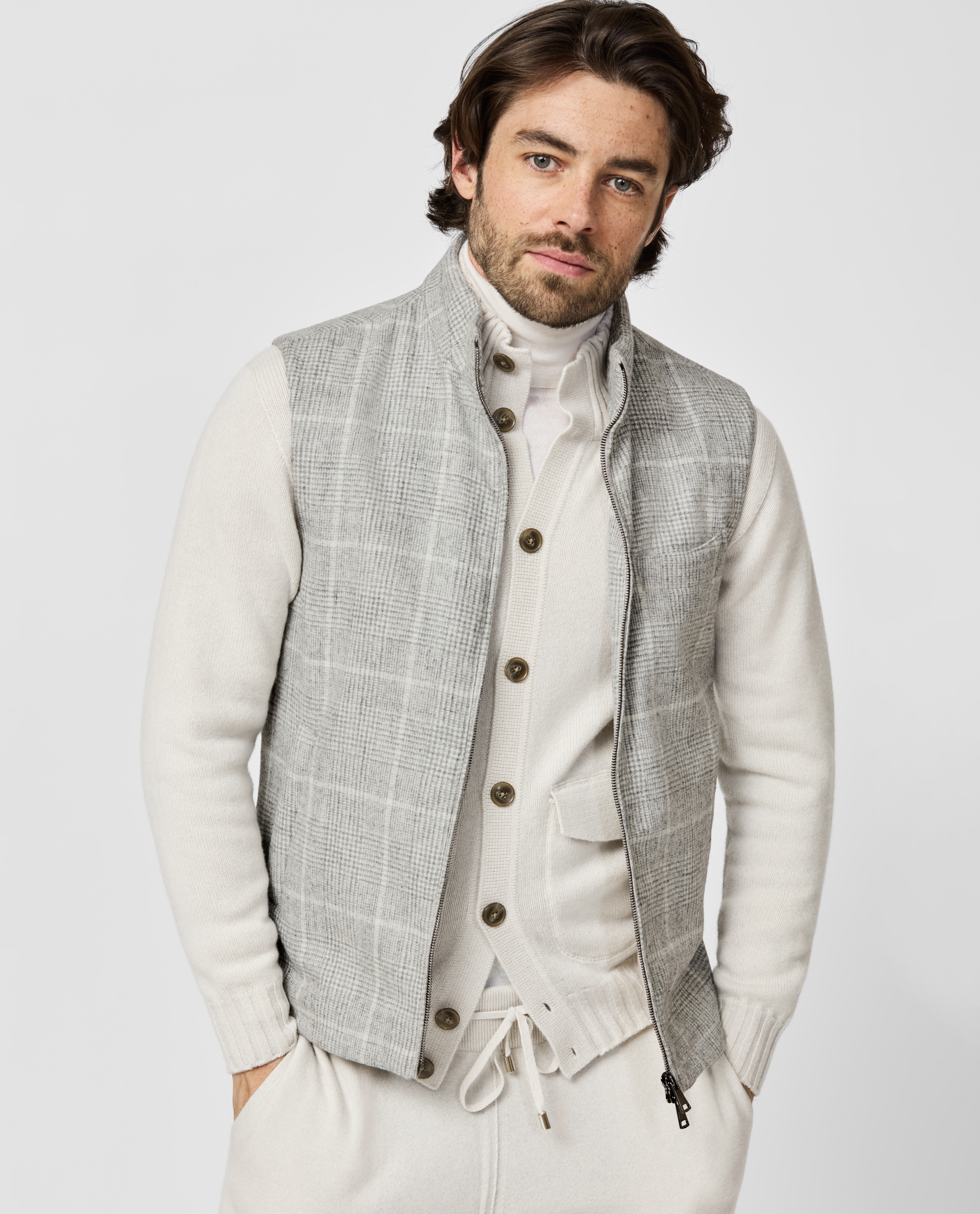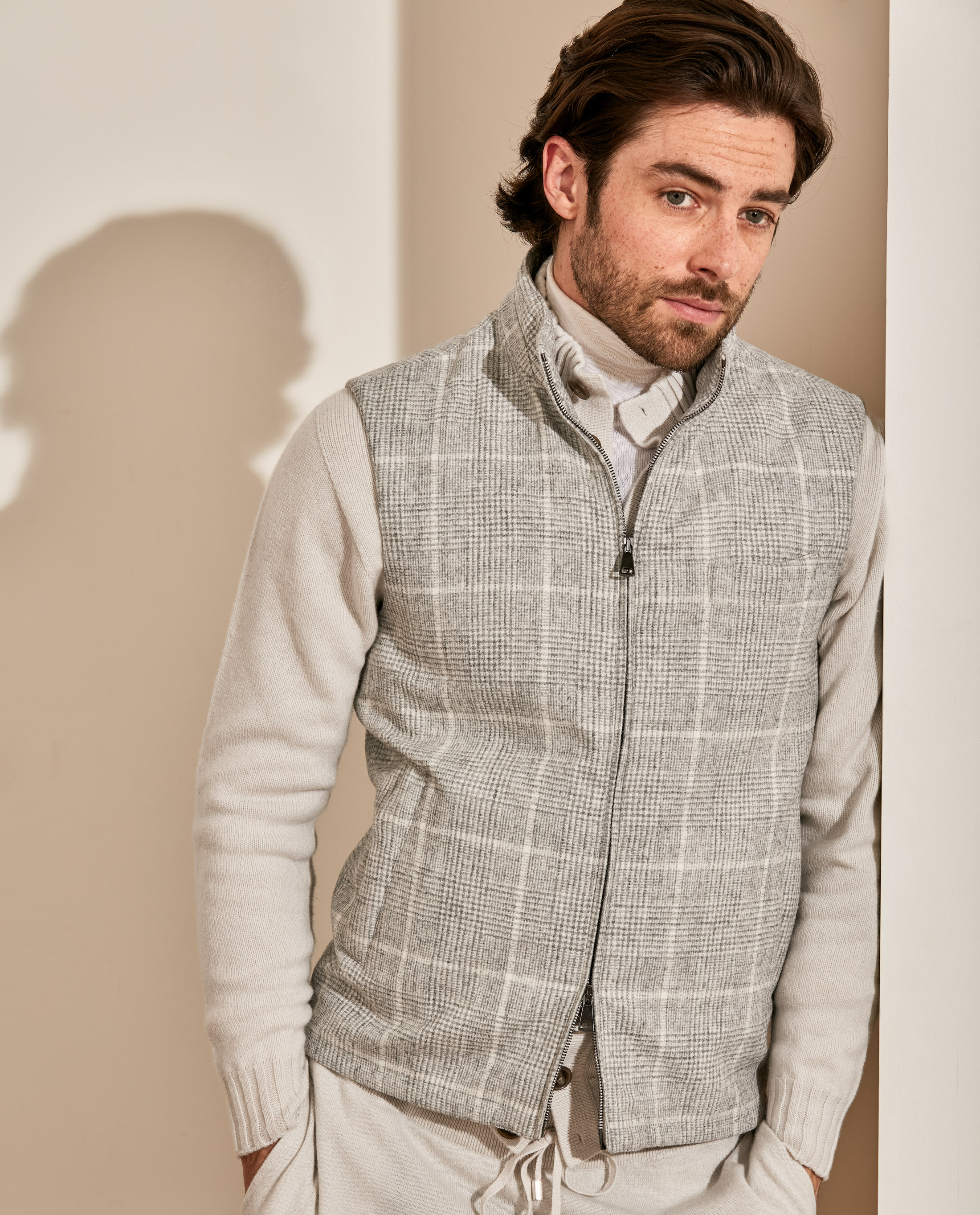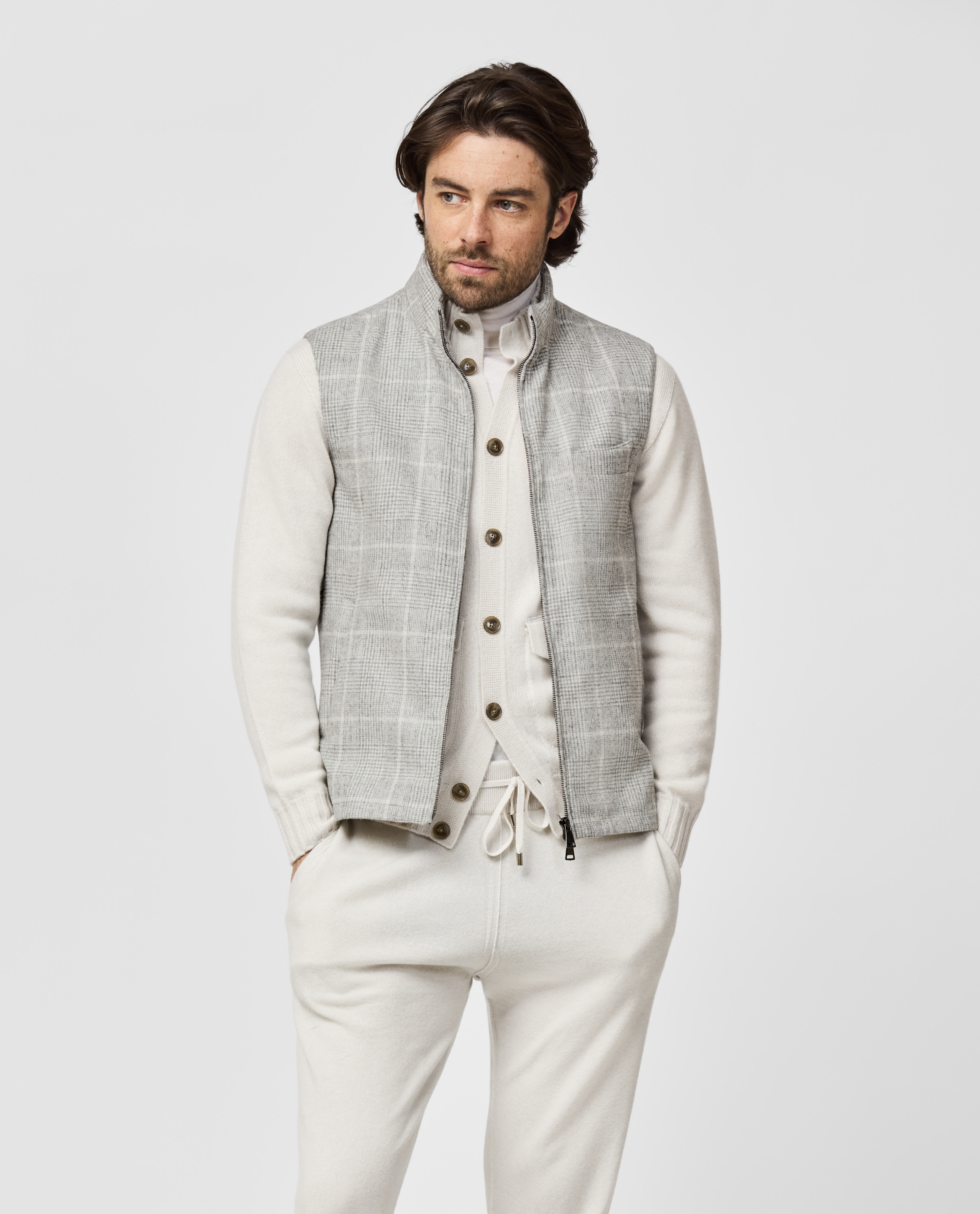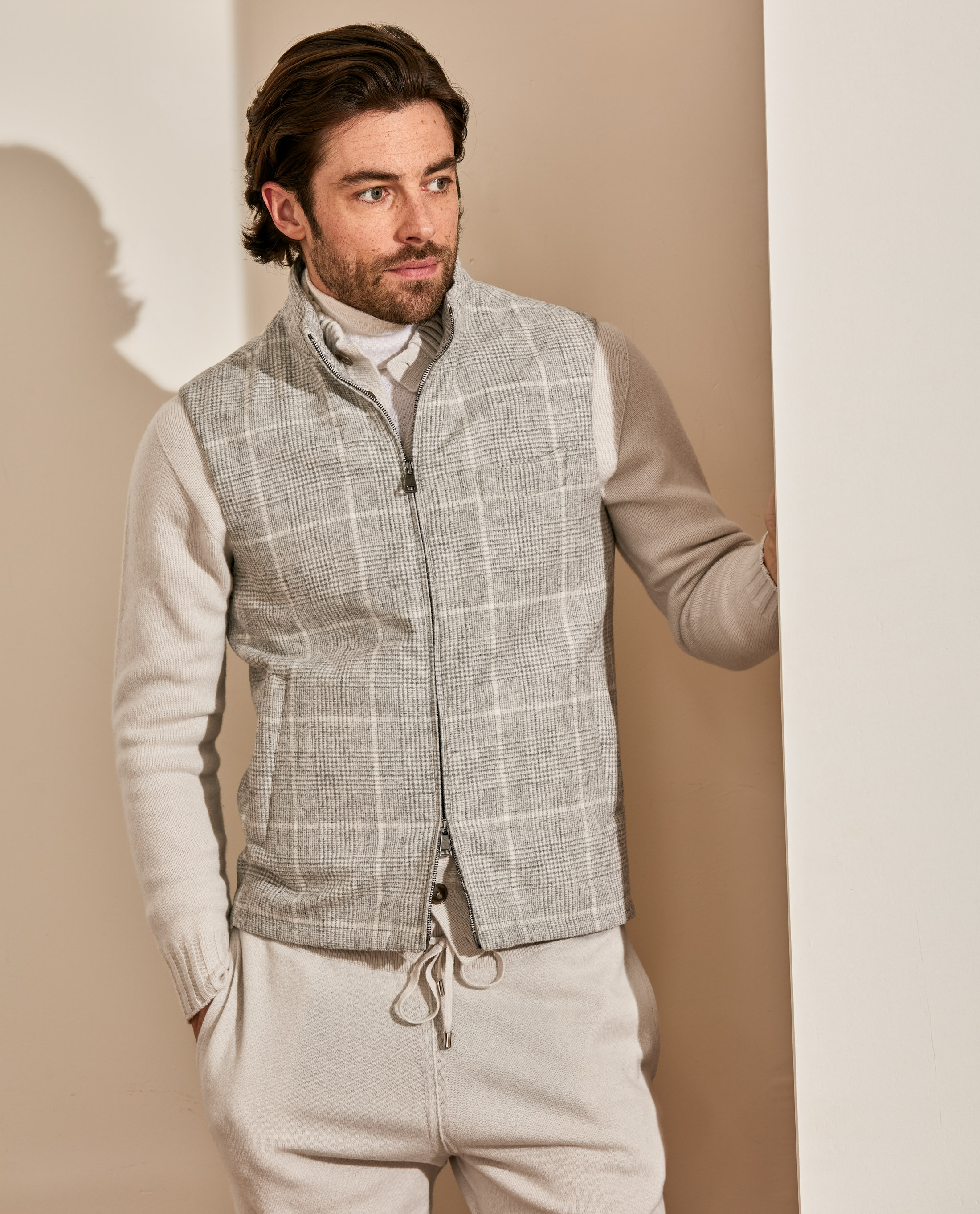 Warm up with your arms free with this light gray plaid vest. Made from a rare blend of ultra-fine baby alpaca, mulesing-free merino wool, and technical fibres. Designed here with a two-way zip for a classic look. Style it with a matching knit, leisure pants, beanie, and scarf to complete the look. Make this vest your own with our many customization options. Baby alpaca & merino wool blend Glen plaid Warm Hypoallergenic Soft feel